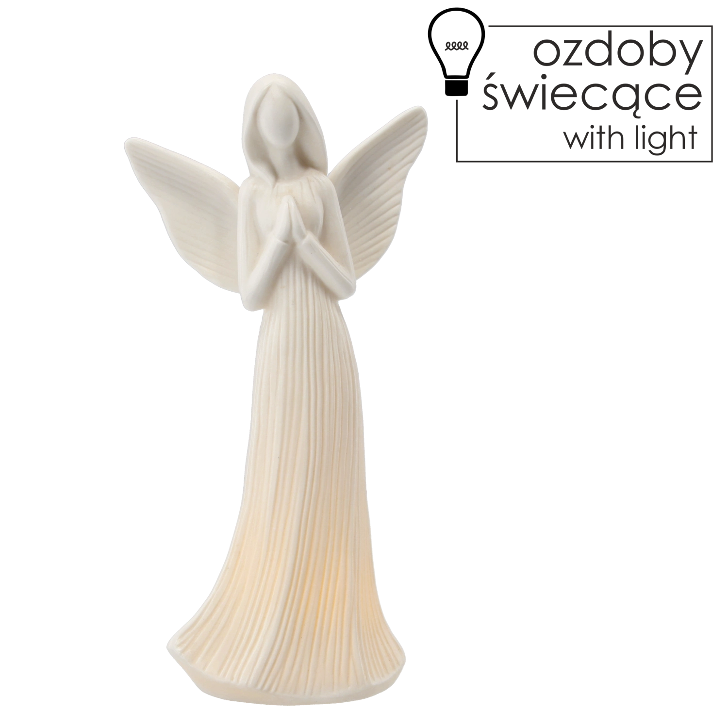 Tato andělská dekorace s LED podsvícením vyniká klasickým, nadčasovým designem a matným povrchem, který působí elegantně v každém interiéru. Díky stabilní základně bezpečně stojí na rovných plochách a její výška 23,6 cm z ní dělá ideální doplněk do obývacího pokoje, ložnice i předsíně.