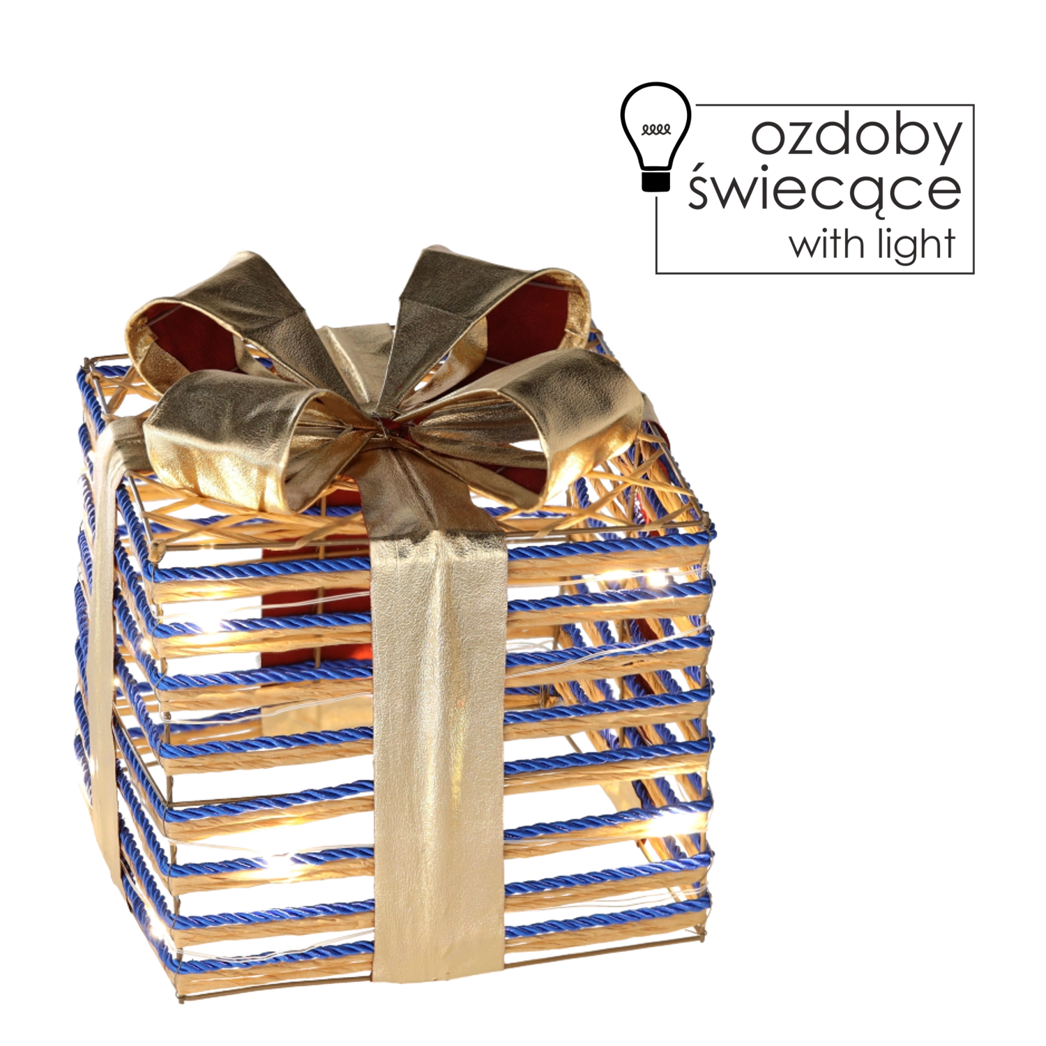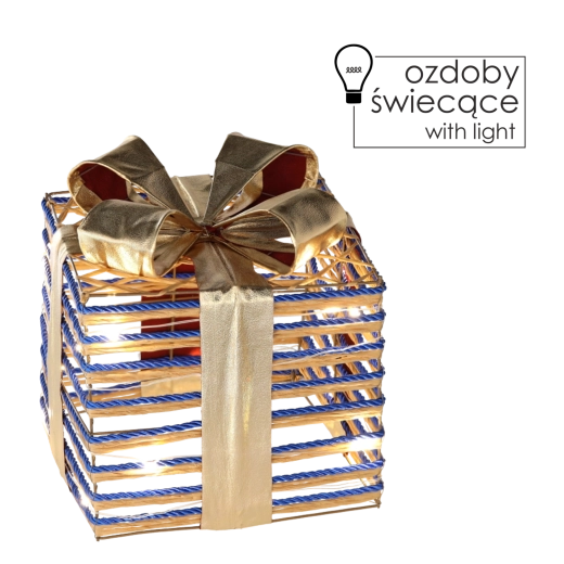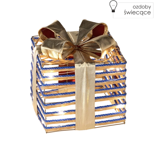 Dopřejte si kouzlo Vánoc s designovou dekorací ve tvaru dárkové krabičky, kterou zdobí výrazná modrá mašle a integrované LED osvětlení. Teplé světlo vytváří příjemnou sváteční atmosféru a dokonale doplní vaši výzdobu v interiéru i exteriéru.