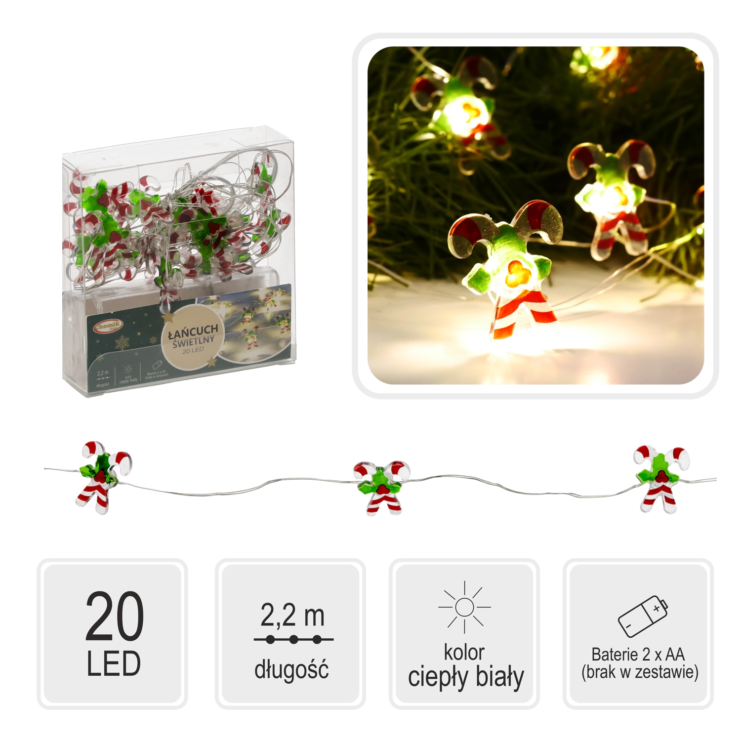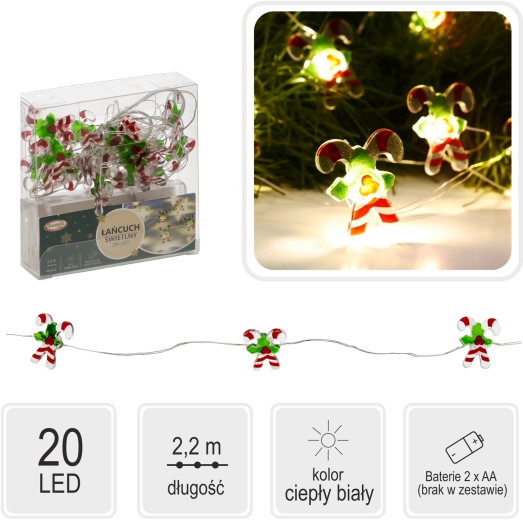 Dvacet LED diod v motivu cukrovinek vyzařuje příjemné teplé světlo, které navodí klidnou sváteční náladu v každé místnosti.