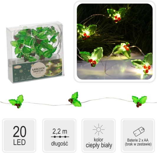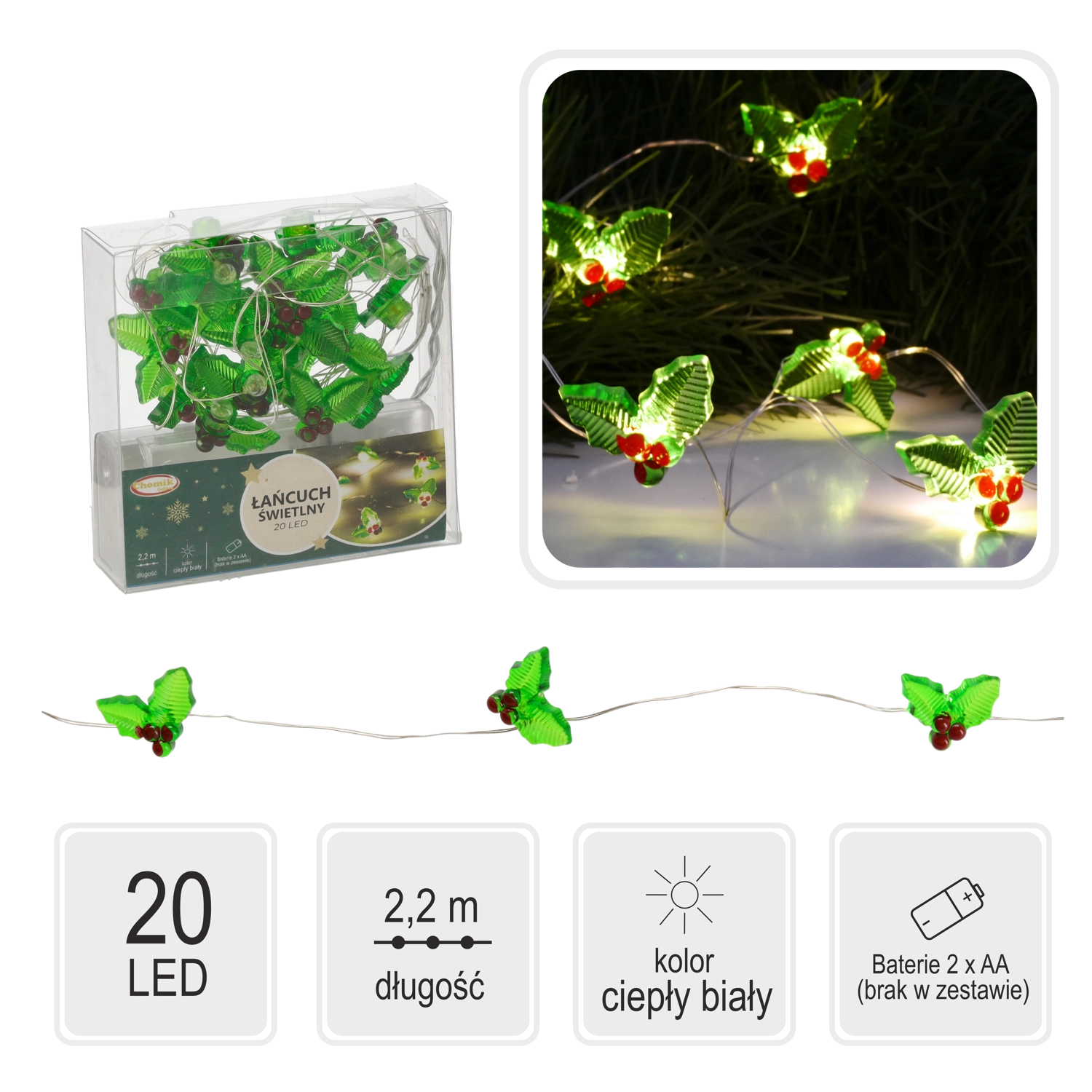 Vneste do interiéru kouzlo Vánoc s dekorativním světelným řetězem ve tvaru jmelí. 20 teplých LED na flexibilním drátku vytváří útulné světlo bez potřeby zásuvky díky napájení 2× AA. Délka 2,2 m je ideální na věnce, zábradlí, stůl i police.
