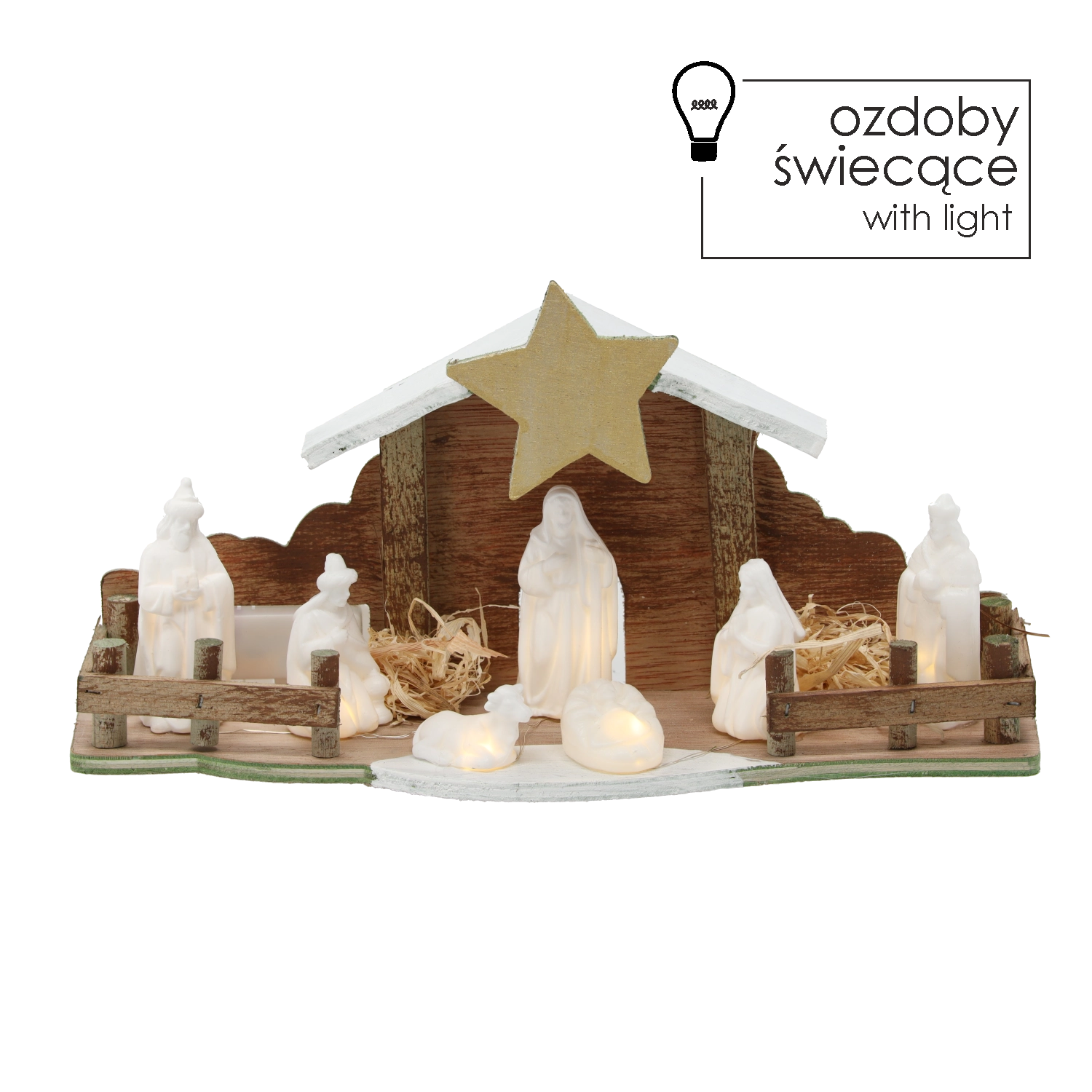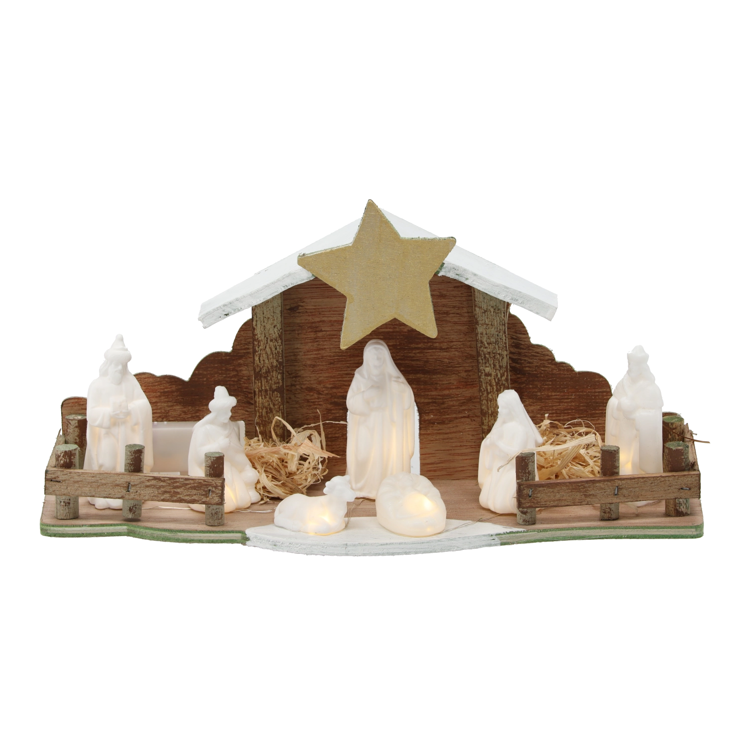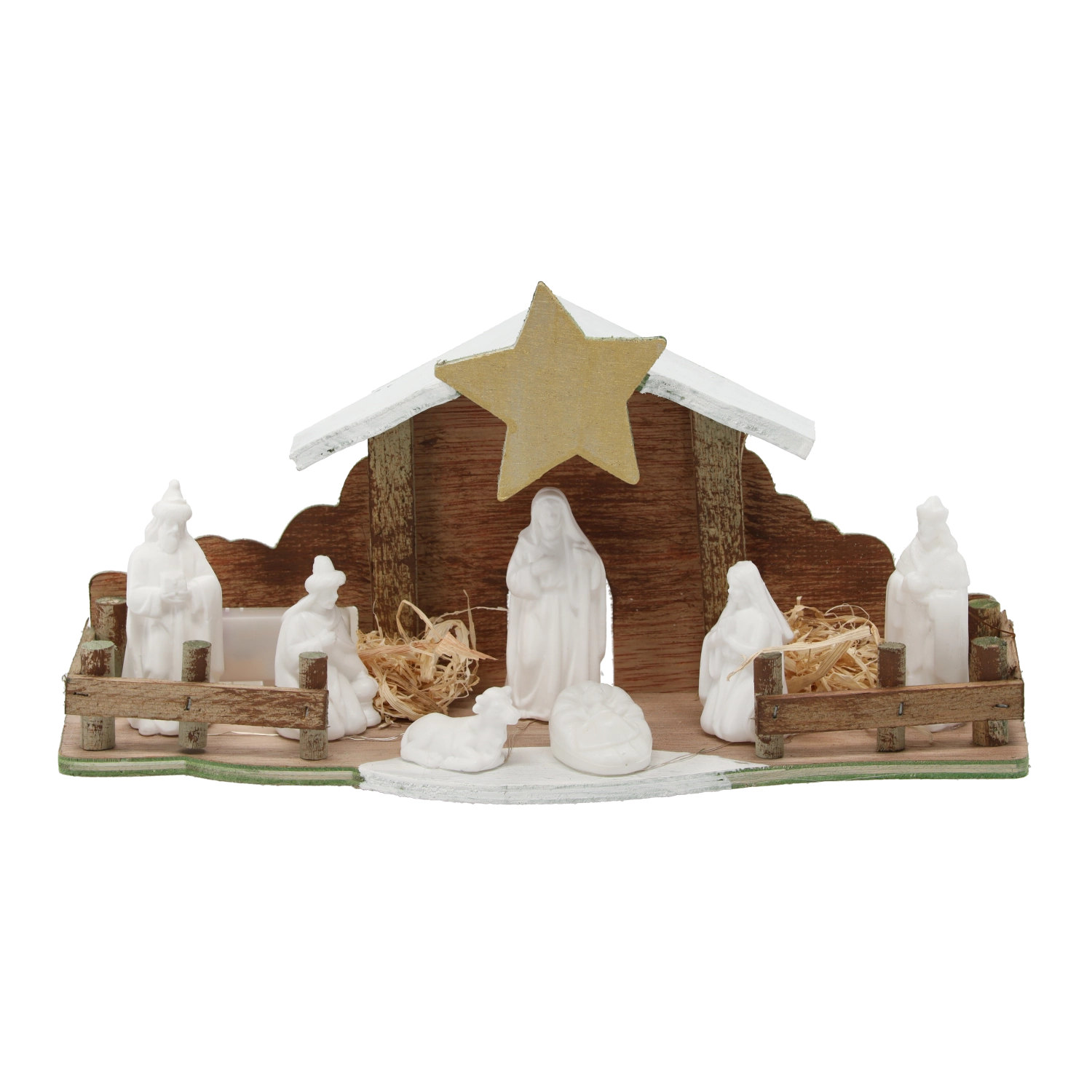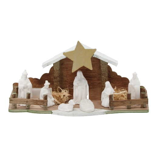 - Dřevo, dekorativní sláma; bílé figurky