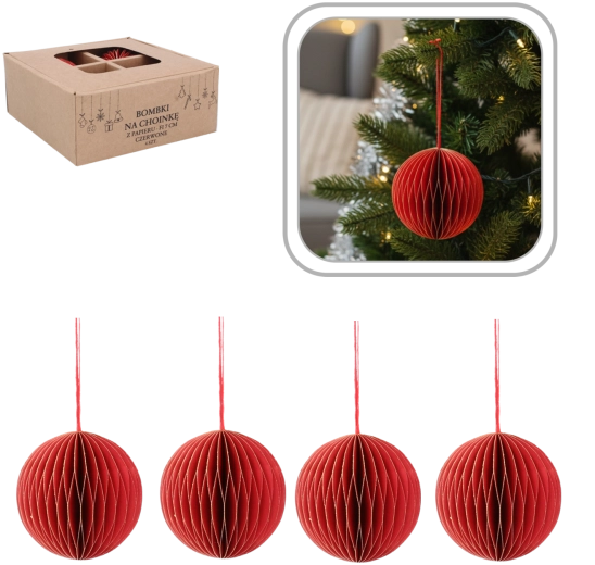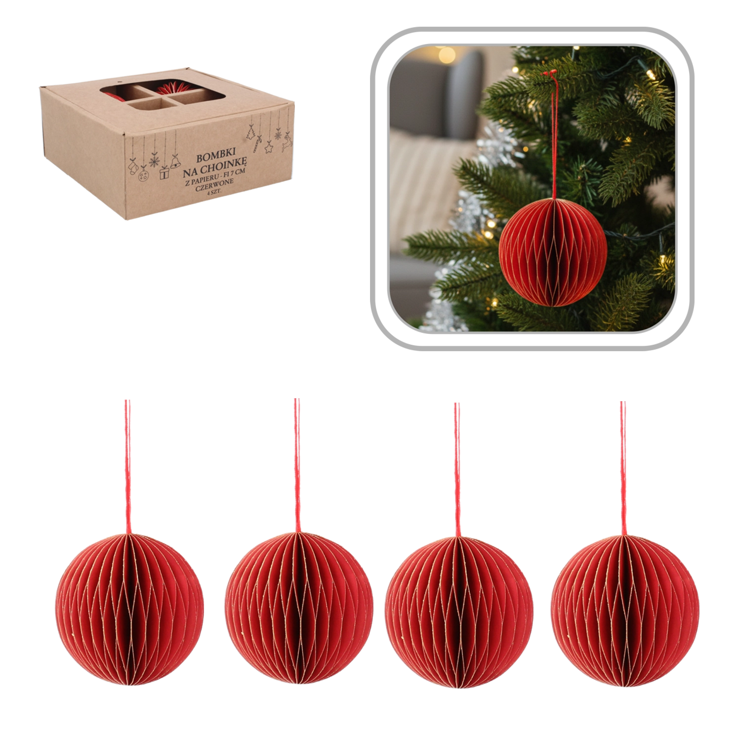 Dodejte svému stromečku elegantní sváteční nádech se sadou čtyř červených papírových ozdob o průměru 7 cm. Lehký materiál zajišťuje snadné zavěšení bez zatížení větví, zatímco klasická červená barva a nadčasový minimalistický design krásně ladí s tradiční i moderní výzdobou.