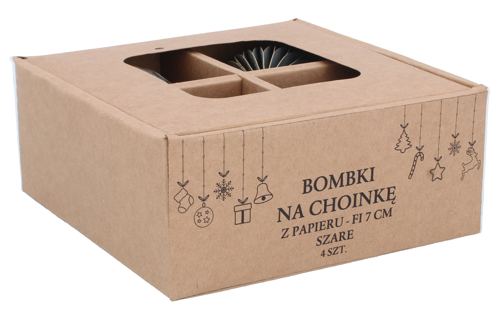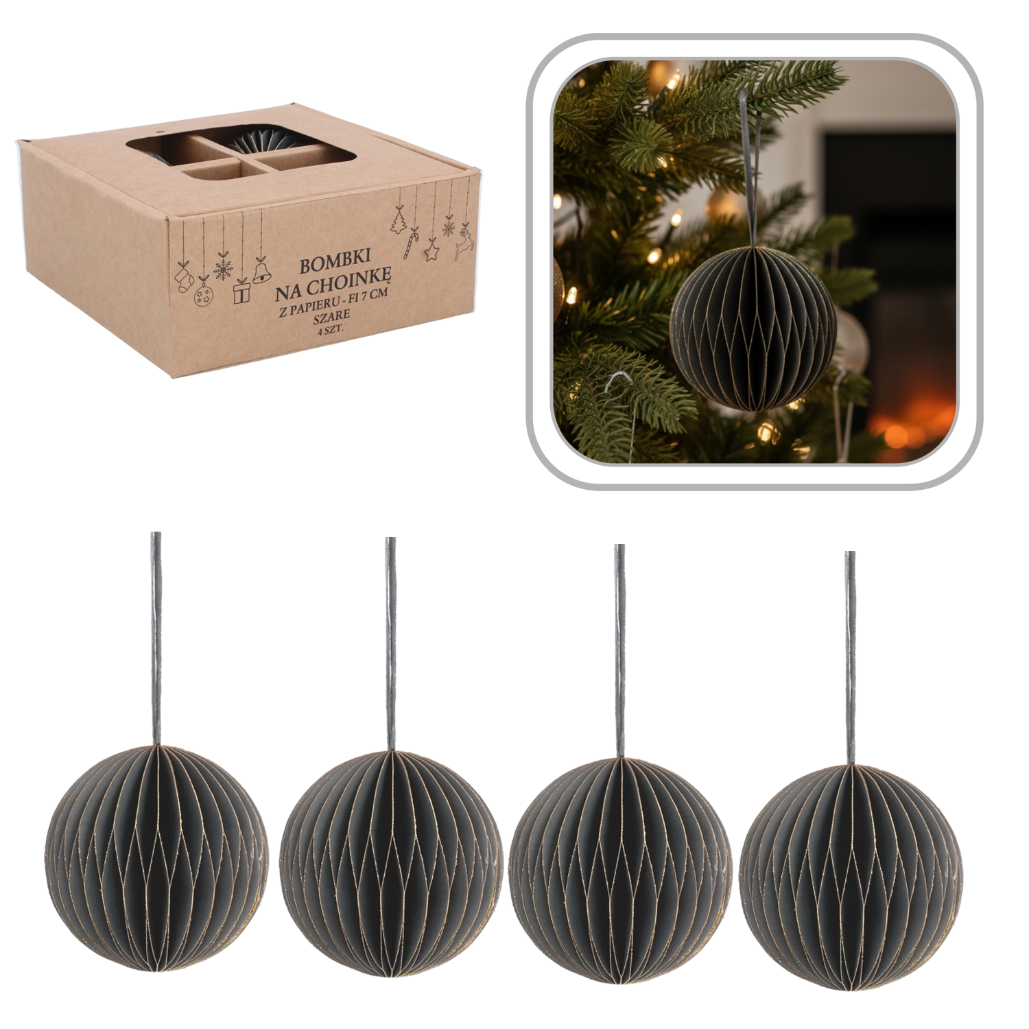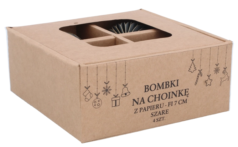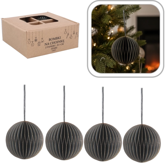 Elegantní sada čtyř papírových vánočních ozdob o průměru 7 cm v šedé barvě přináší moderní, harmonický a bezpečný doplněk vaší sváteční výzdoby. Jsou lehké, netříštivé a odolné, se šňůrkami pro snadné zavěšení na stromek, věnce i girlandy. Minimalistický design se skvěle kombinuje s dalšími dekoracemi a dodá interiéru elegantně vyvážený vzhled.