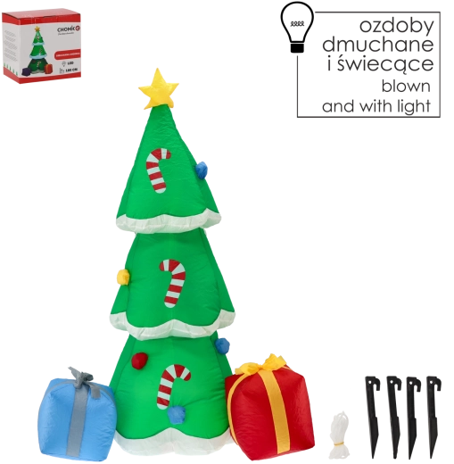 Dodejte svým Vánocům poutavou dominantní dekoraci. Barevný nafukovací stromek s hvězdou a dárky okolo upoutá pozornost dětí i dospělých, a to uvnitř i venku. Stačí zapojit do zásuvky – zabudovaný motor se postará o automatické nafouknutí a LED osvětlení vytvoří útulnou atmosféru po celý večer.