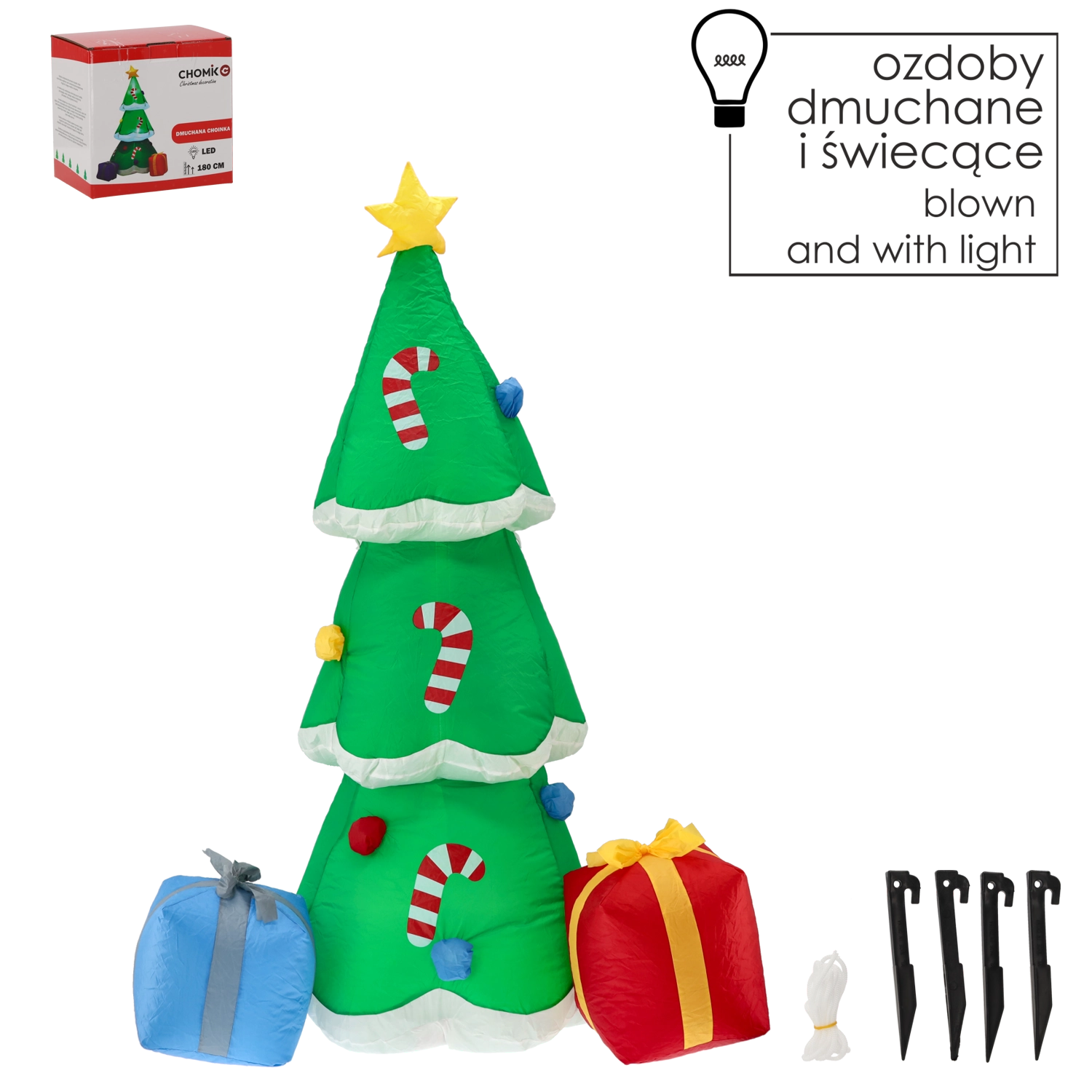 Nafukovací vánoční stromek s LED osvětlením o výšce 180 cm promění zahradu i interiér v kouzelnou sváteční scénu. Díky integrovanému ventilátoru se sám nafoukne během pár minut, odolné provedení IP44 zvládne venkovní podmínky a bílé LED diody zajistí krásný efekt po setmění. Jednoduchá instalace a bezpečné nízkonapěťové napájení s certifikacemi CE, ROHS, EMC a LVD.