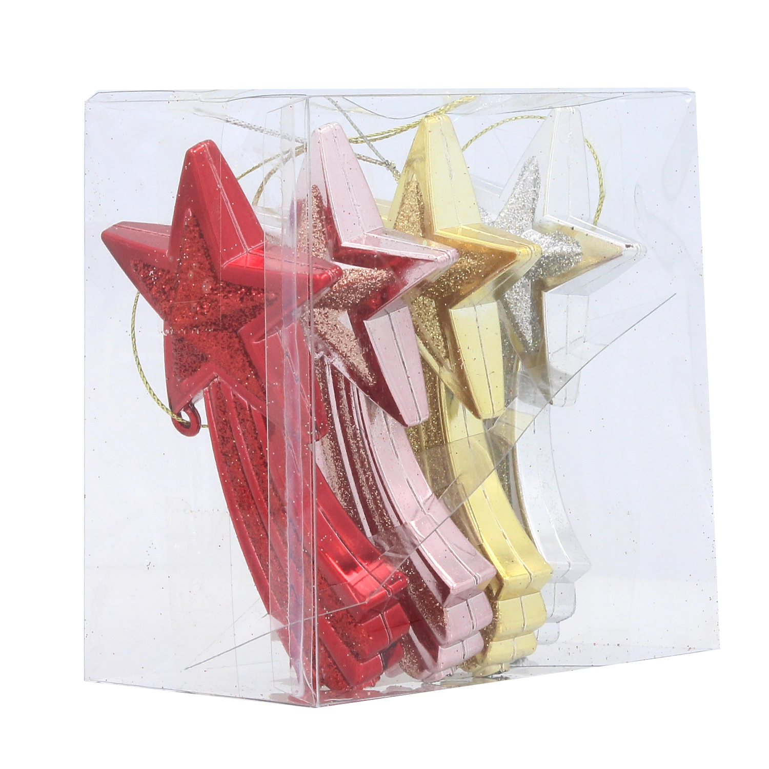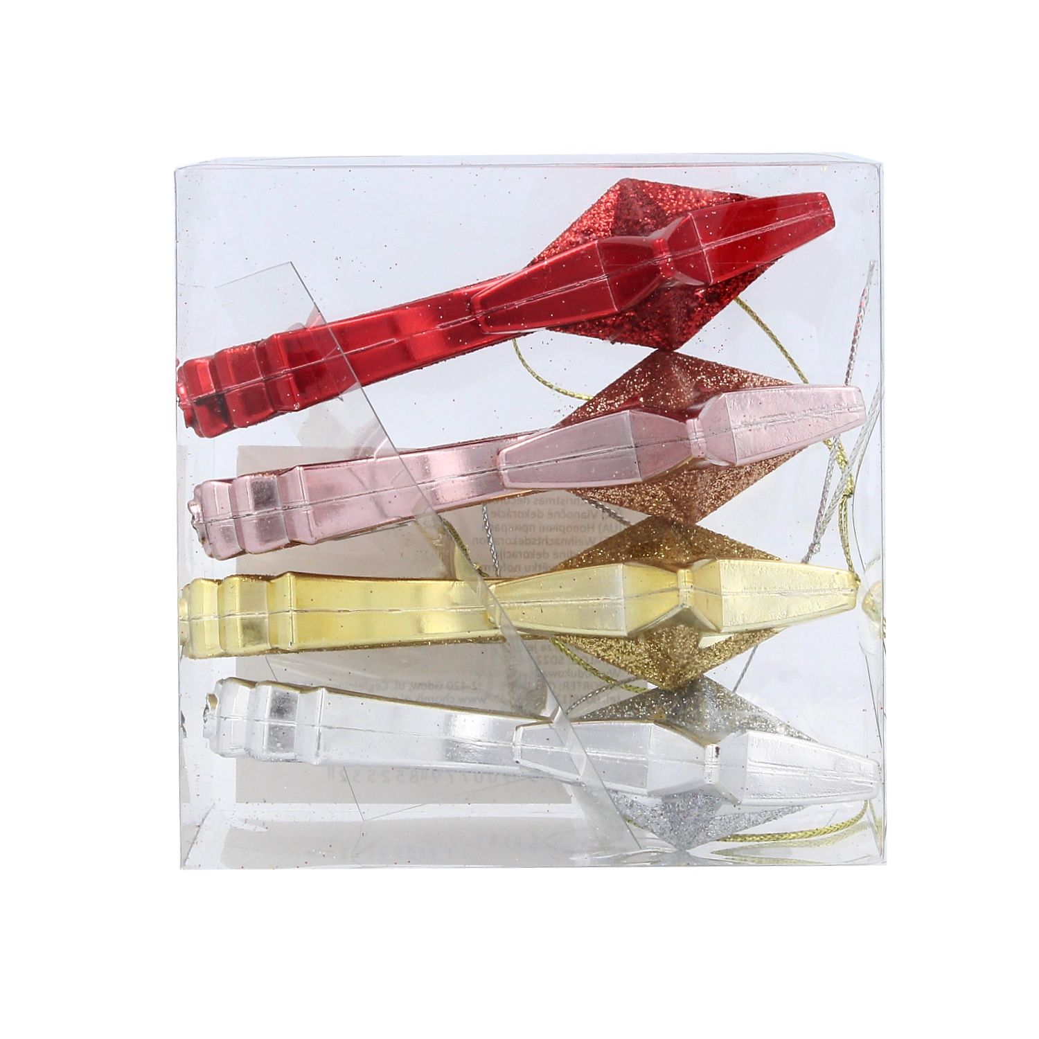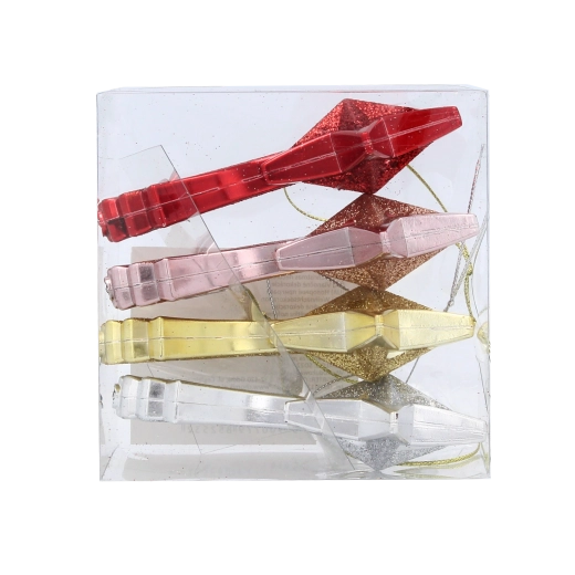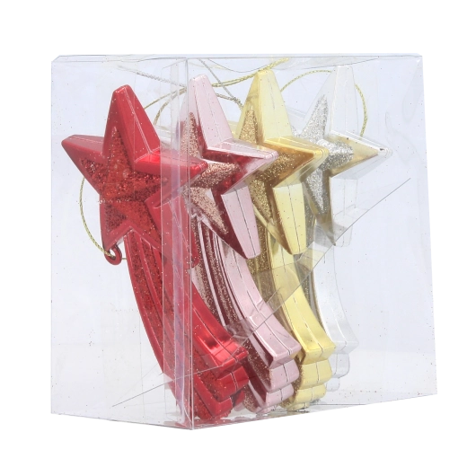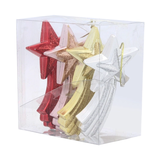 Dodejte svému stromku i celé domácnosti sváteční třpyt se sadou čtyř ozdob ve tvaru padající hvězdy o velikosti 11 cm. Ozdoby z odolného plastu jsou lehké, bezpečné a mají praktickou šňůrku pro zavěšení. Čtyři elegantní barvy – červená, zlatá, stříbrná a růžová – snadno sladíte s vaší výzdobou a vytvoříte harmonickou vánoční atmosféru.