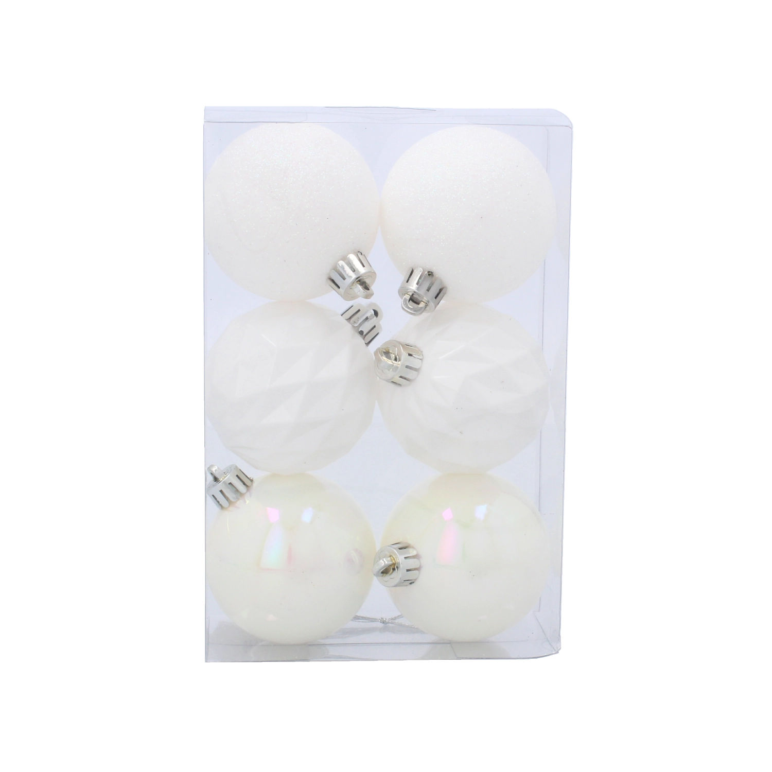 Každá koule je osazena kovovým závěsným očkem a set je uložen v praktické krabičce pro přehledné skladování po svátcích. Kombinace matné, perleťové a facetové struktury vytváří harmonický a luxusní vzhled, který se hodí k tradiční i moderní výzdobě.