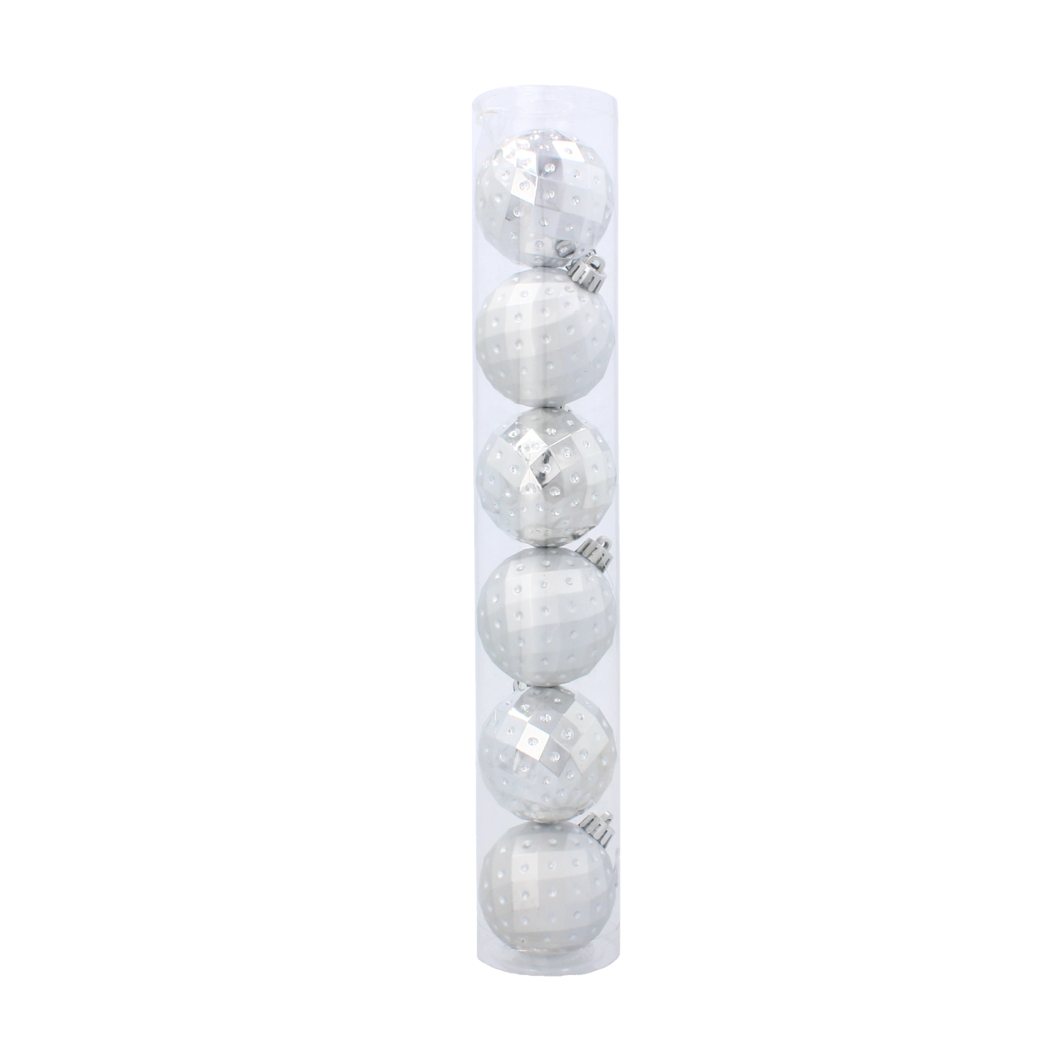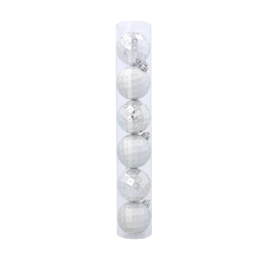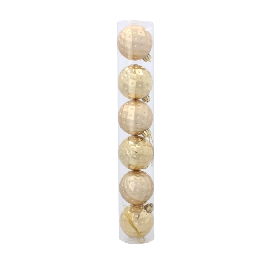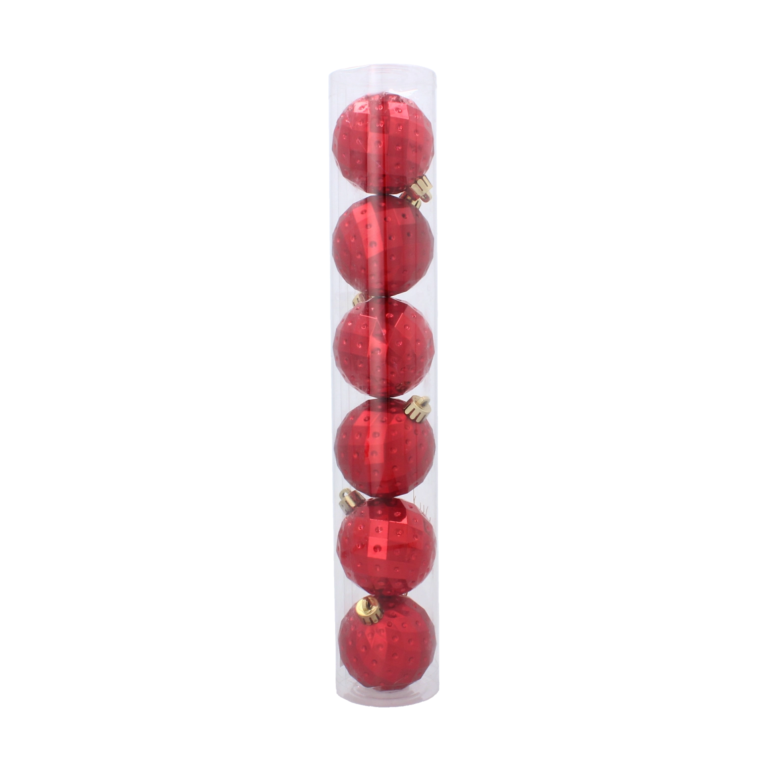 Elegantní sada šesti vánočních koulí o průměru 6 cm v kombinaci červené, zlaté a stříbrné barvy rozzáří každý stromek. Ozdoby jsou z netříštivého plastu pro bezpečné používání, mají moderní geometrický reliéf a přicházejí v praktické průhledné tubě se šňůrkami pro snadné zavěšení.