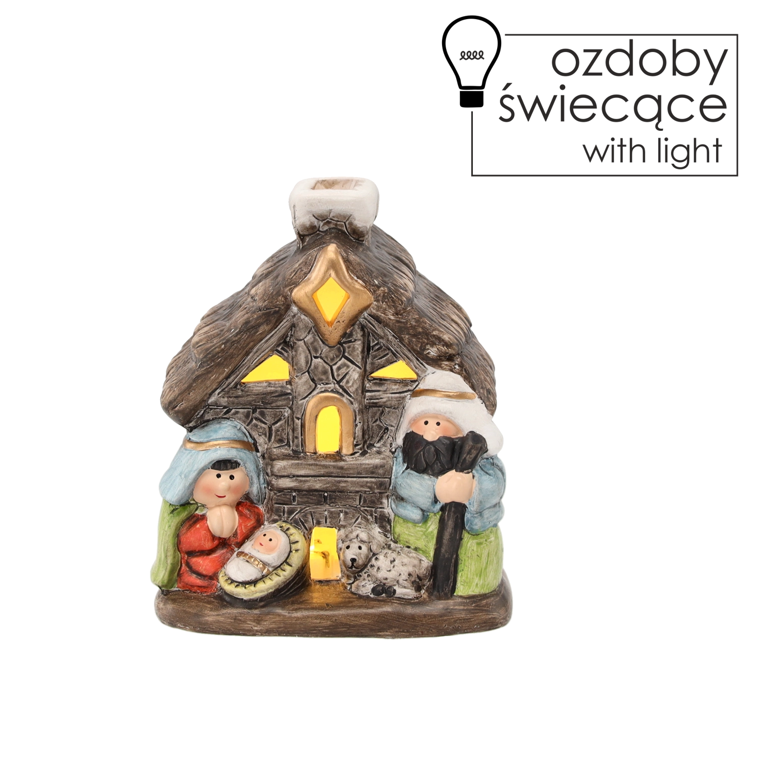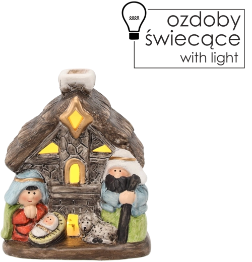 Tento půvabný betlém v podobě kamenného domku zobrazuje Svatou rodinu s jemnými detaily, včetně ovečky, která podtrhuje klidnou a tradiční atmosféru. Integrované LED podsvícení dodává dekoraci teplý svit a promění polici, komodu či sváteční stůl v útulné místo.