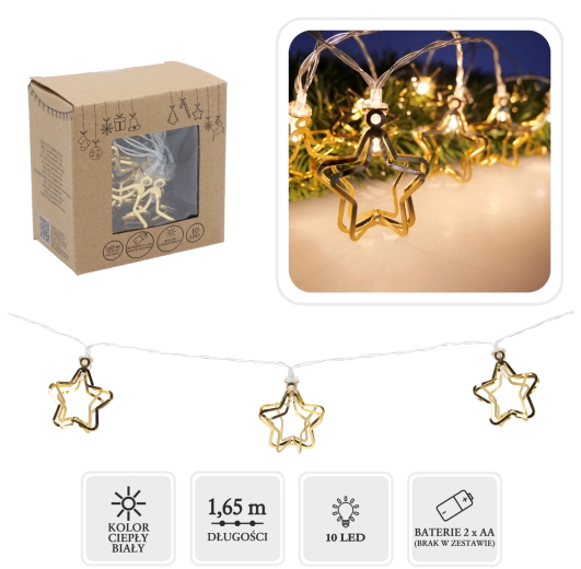 Vneste do svého domova kouzlo Vánoc se stylovým LED řetězem s 3D zlatými kovovými hvězdami. Teplé bílé světlo vytváří útulnou atmosféru a díky napájení na baterie (2× AA) jej umístíte kamkoli bez kabelů – na stůl, komodu, krb i věnec.