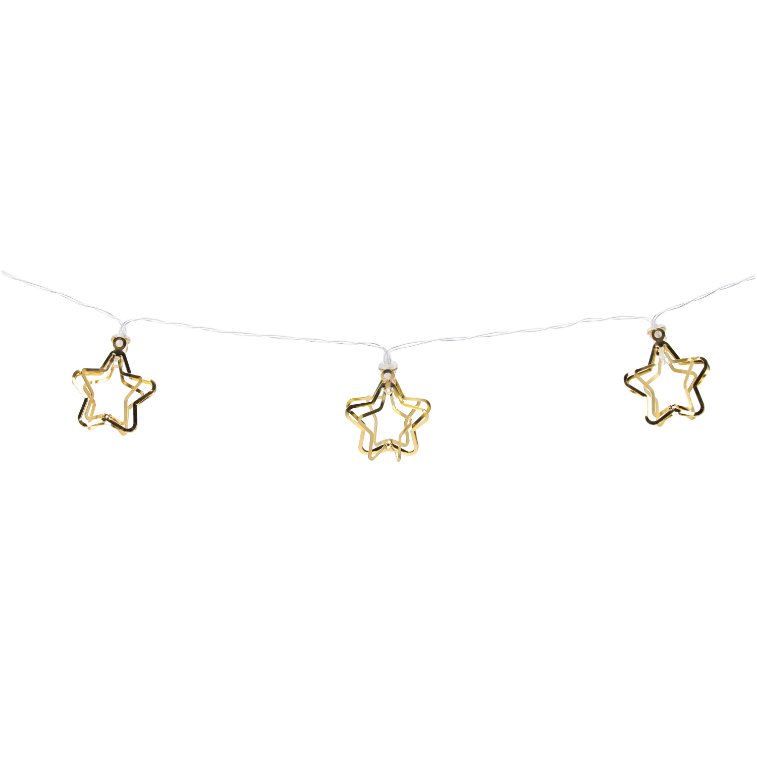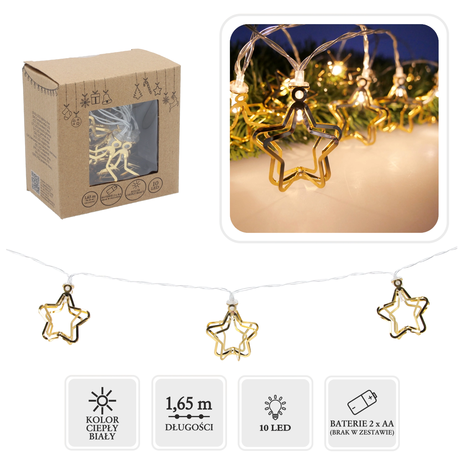 Dekorační LED řetěz s 10 teplými diodami v průhledných hvězdách se zlatým efektem je ideální pro sváteční výzdobu i celoroční zkrášlení interiéru. Kovové 3D hvězdy působí elegantně a dodají lesk každé aranži – od glamour po boho.