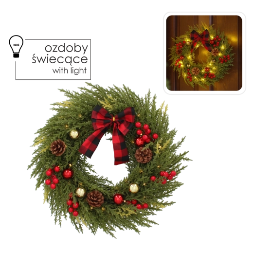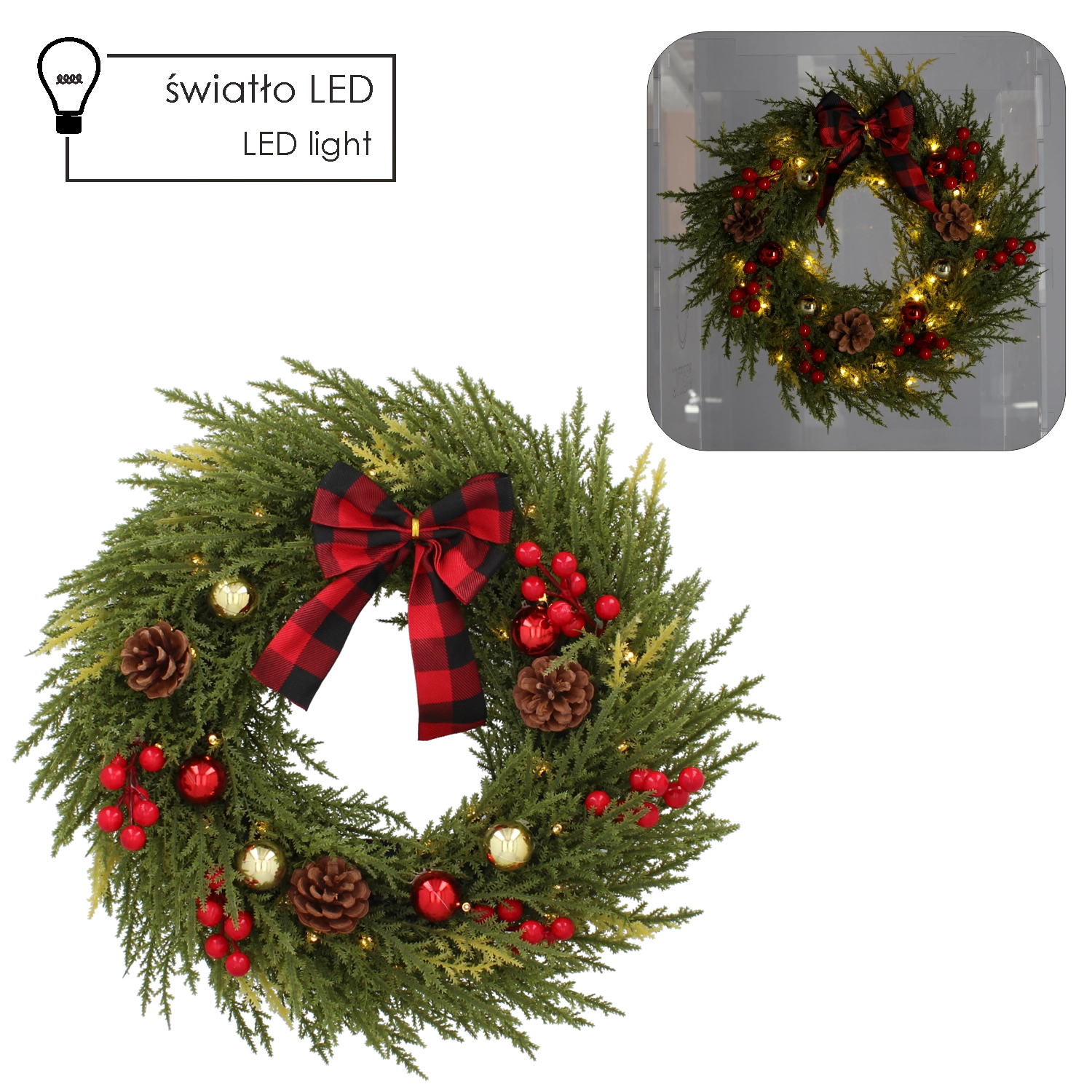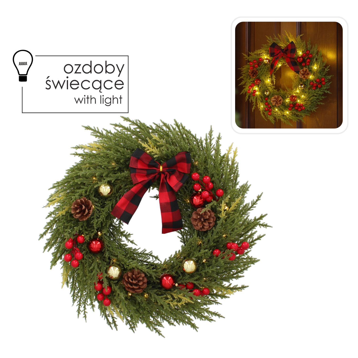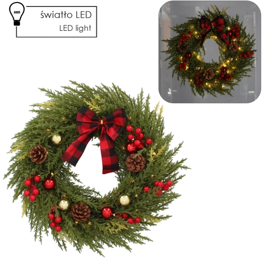 Elegantní vánoční LED věnec přináší útulnou atmosféru domova díky teplému bílému světlu a bohatému, realistickému vzhledu jehličí doplněnému o dekorativní prvky, jako jsou bobule, šišky a stylová kostkovaná mašle. Díky napájení 3× AA bateriemi jej snadno umístíte na dveře, zeď či okno bez viditelných kabelů.