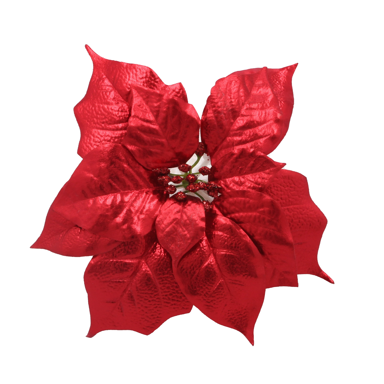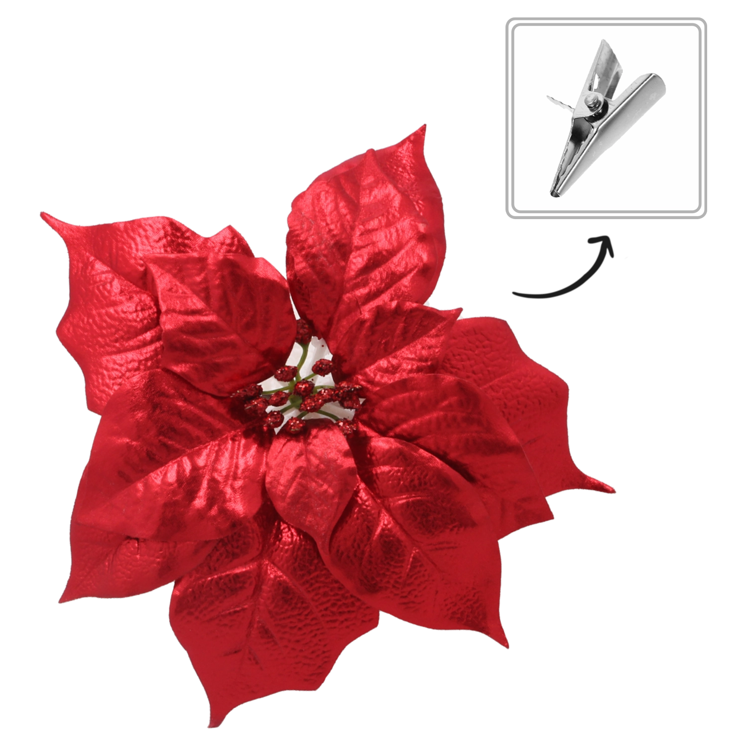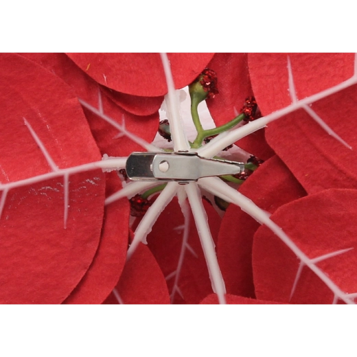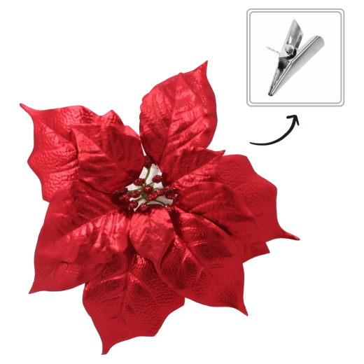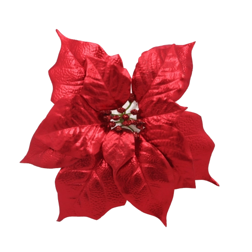 Tato realistická umělá poinsettia věrně napodobuje přirozený tvar a strukturu květu a díky brokátovým akcentům krásně odráží světlo vánočních ozdob. Univerzální design se snadno sladí s moderním i tradičním stylem výzdoby a vytvoří harmonickou sváteční kompozici.