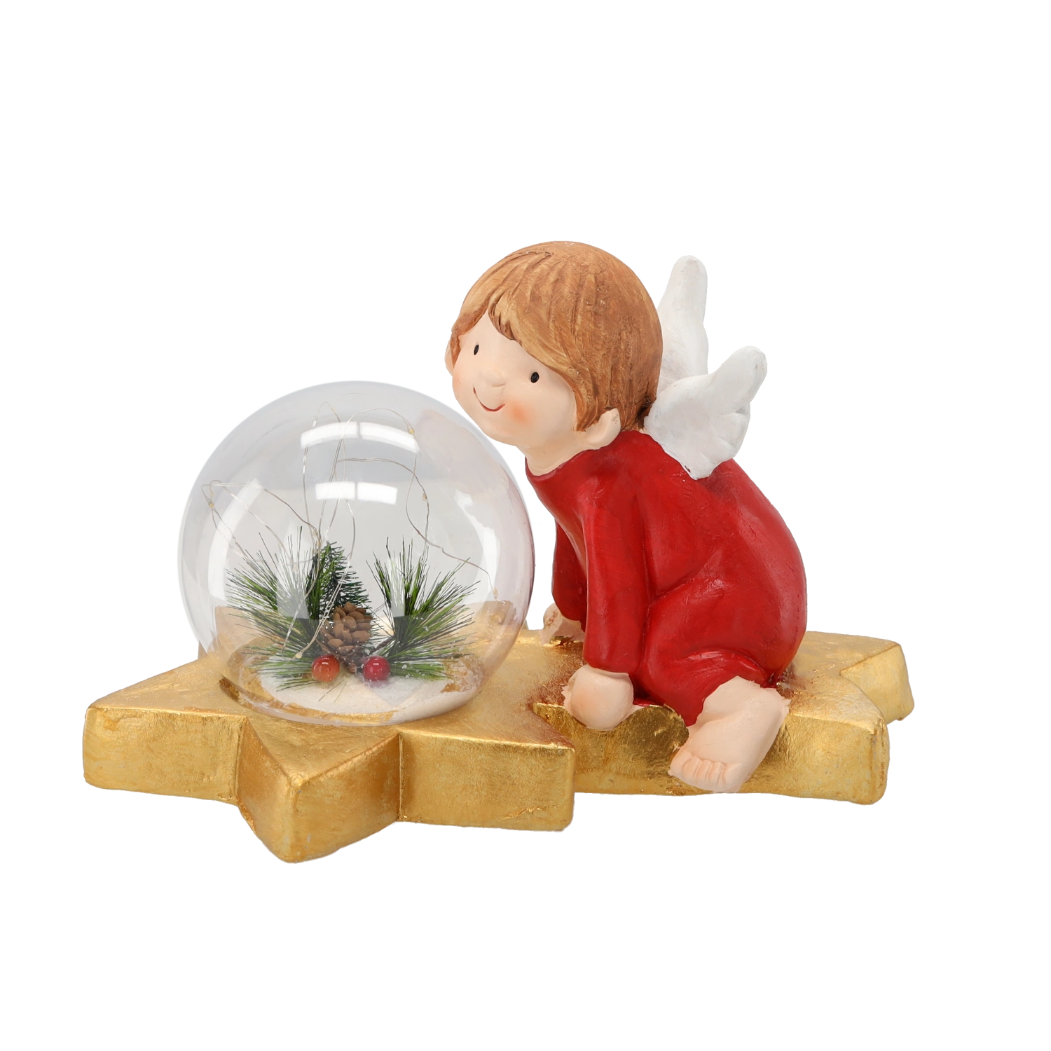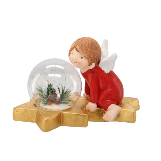 Roztomilá vánoční figurka andělky s čirou LED koulí vnese do vašeho domova kouzelnou atmosféru. Na zlaté hvězdě klečí anděl v červeném oblečku a vedle něj září dekorativní koule s jehličím, bobulemi a šiškou. Díky detailnímu zpracování, lesklé povrchové úpravě a jemnému LED osvětlení je tato dekorace ideální na stůl, polici i komodu. Baterie AAA nejsou součástí balení.