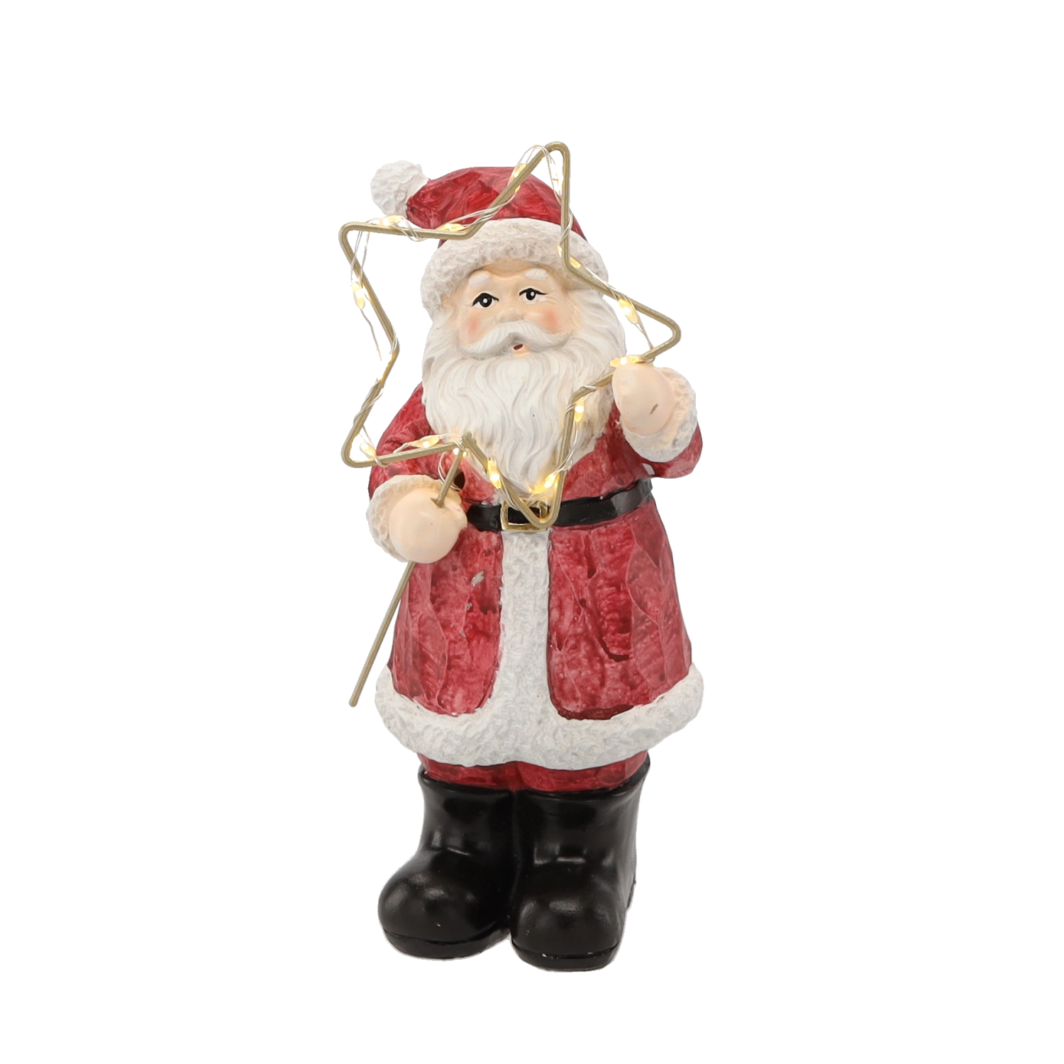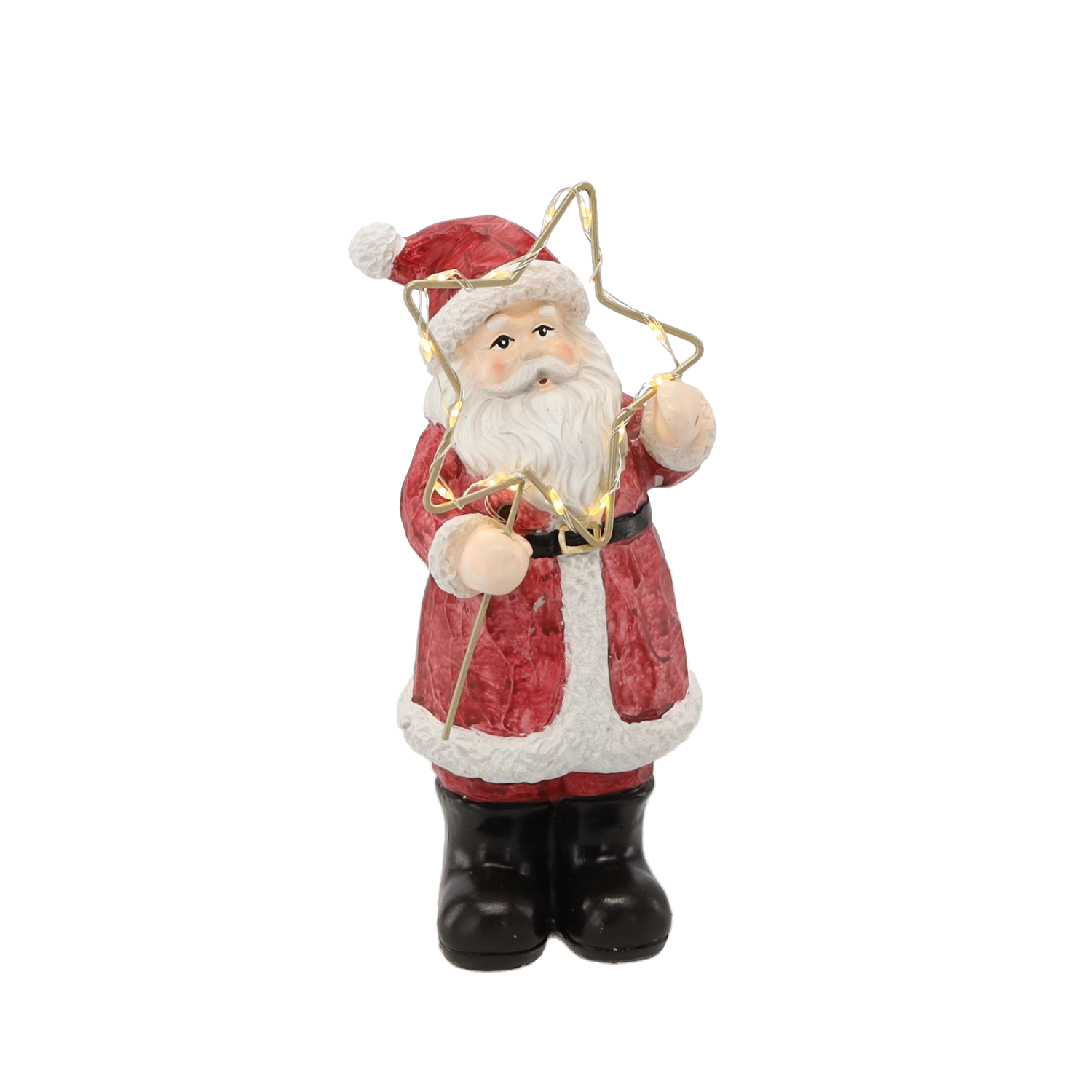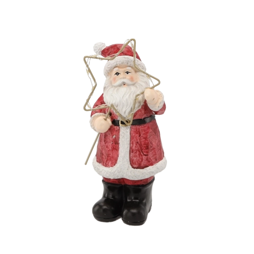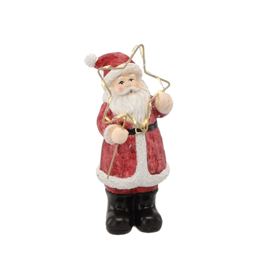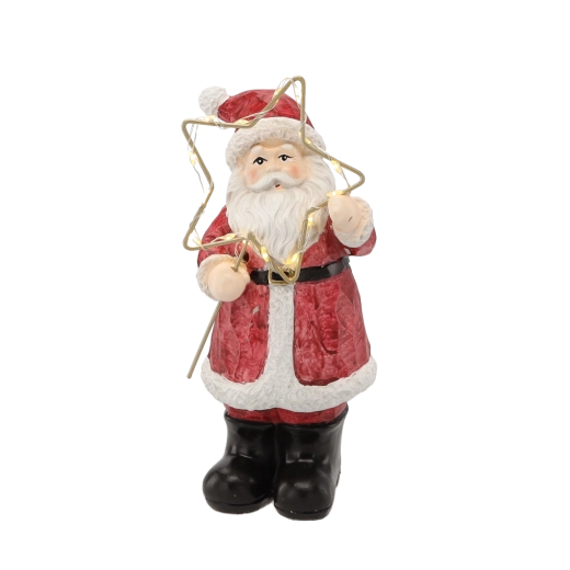 Tato vánoční figurka Santy v klasickém červeném kabátu přináší do interiéru kouzlo Vánoc. Zlatá hvězda s LED světlem jemně prozáří okolí a zvýrazní detailně malované prvky – od vousů až po texturu oděvu. Díky stabilní základně je ideální jako stolní dekorace.