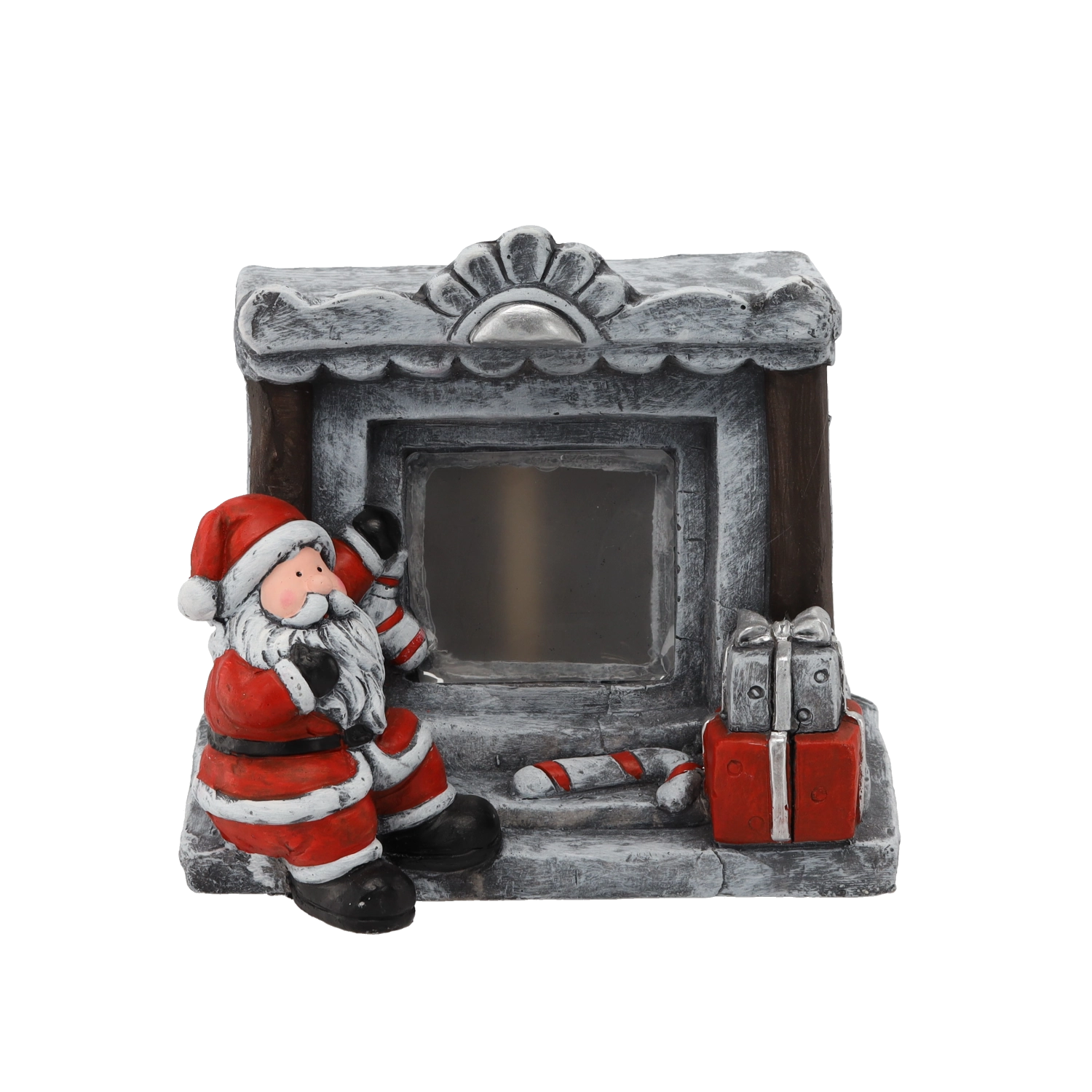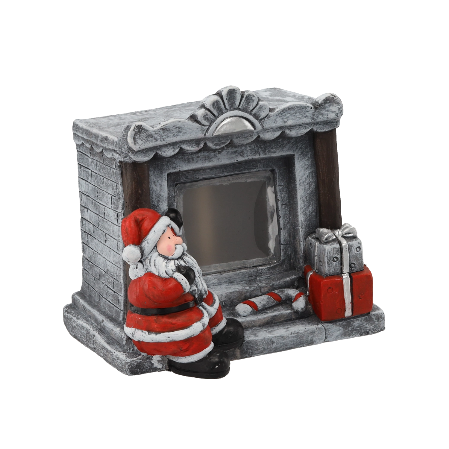 Kamenný efekt krbu, SANTA, dárky i cukrové hůlky jsou pečlivě modelované a malované, aby vynikly na stole či polici.