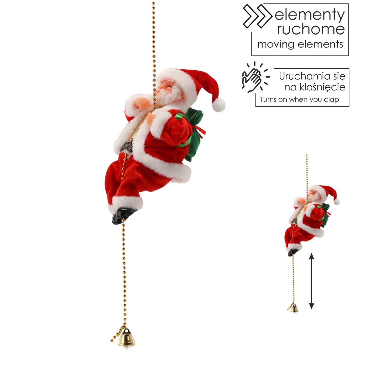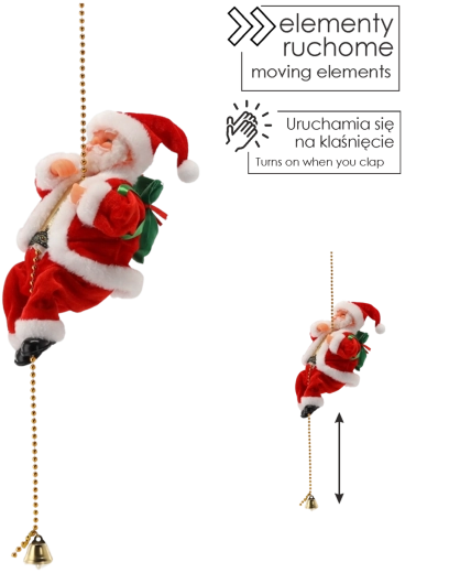 Oživte svůj domov vánoční atmosférou s tímto pohyblivým Santou, který se „šplhá“ po zlatém řetízku s rolničkou. Figurka v klasickém červeném kabátu s bílým lemem a zeleným pytlem dárků nabízí působivý pohyb nahoru a dolů, textilní zpracování s důrazem na detaily a snadné zavěšení jako sváteční dekorace do obýváku, dětského pokoje či výlohy.