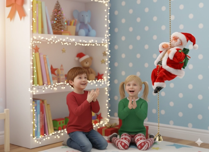 Santa „šplhá“ po zlatém řetízku a vytváří živou sváteční atmosféru v každém interiéru – od obýváku po dětský pokoj.