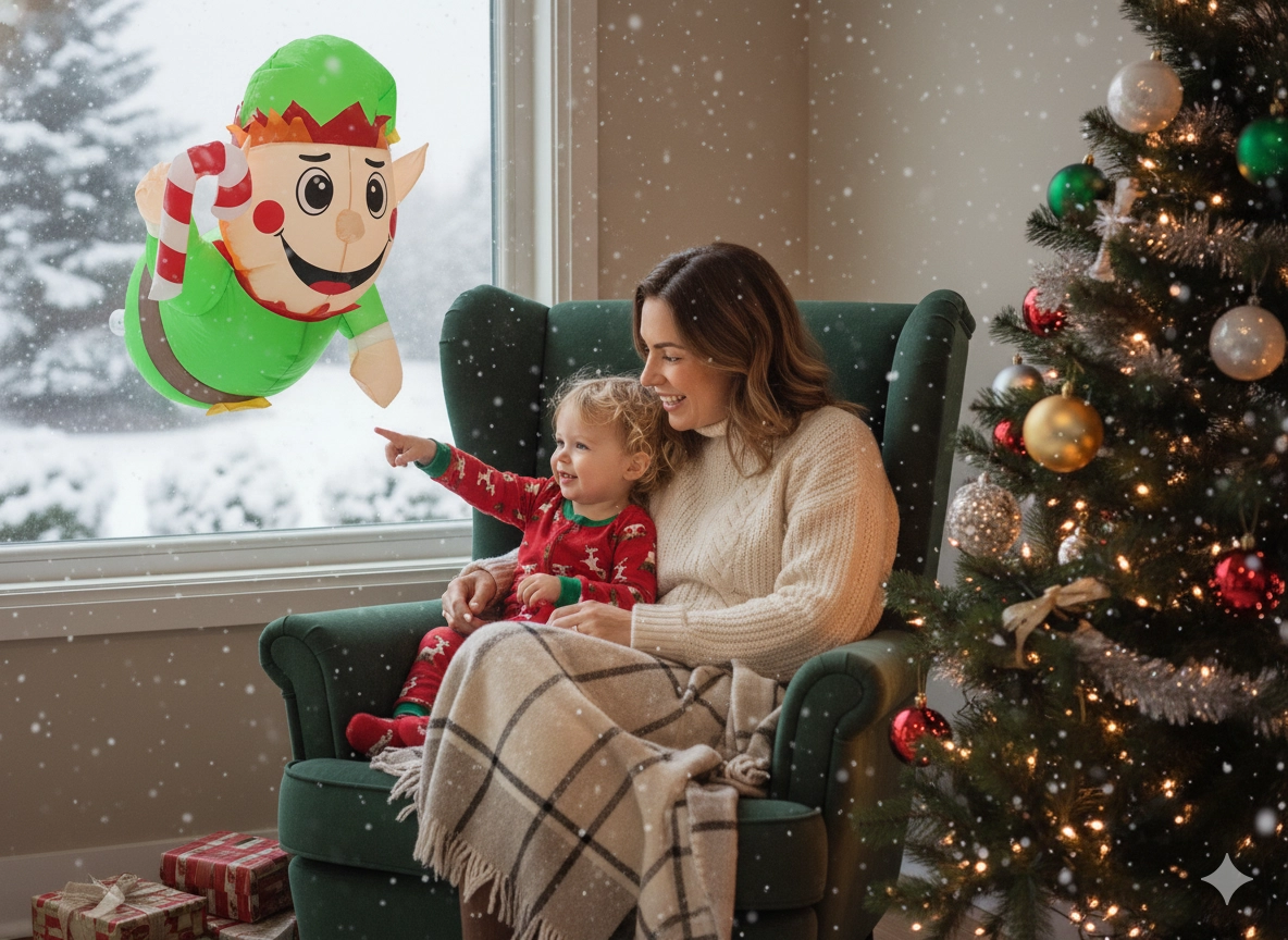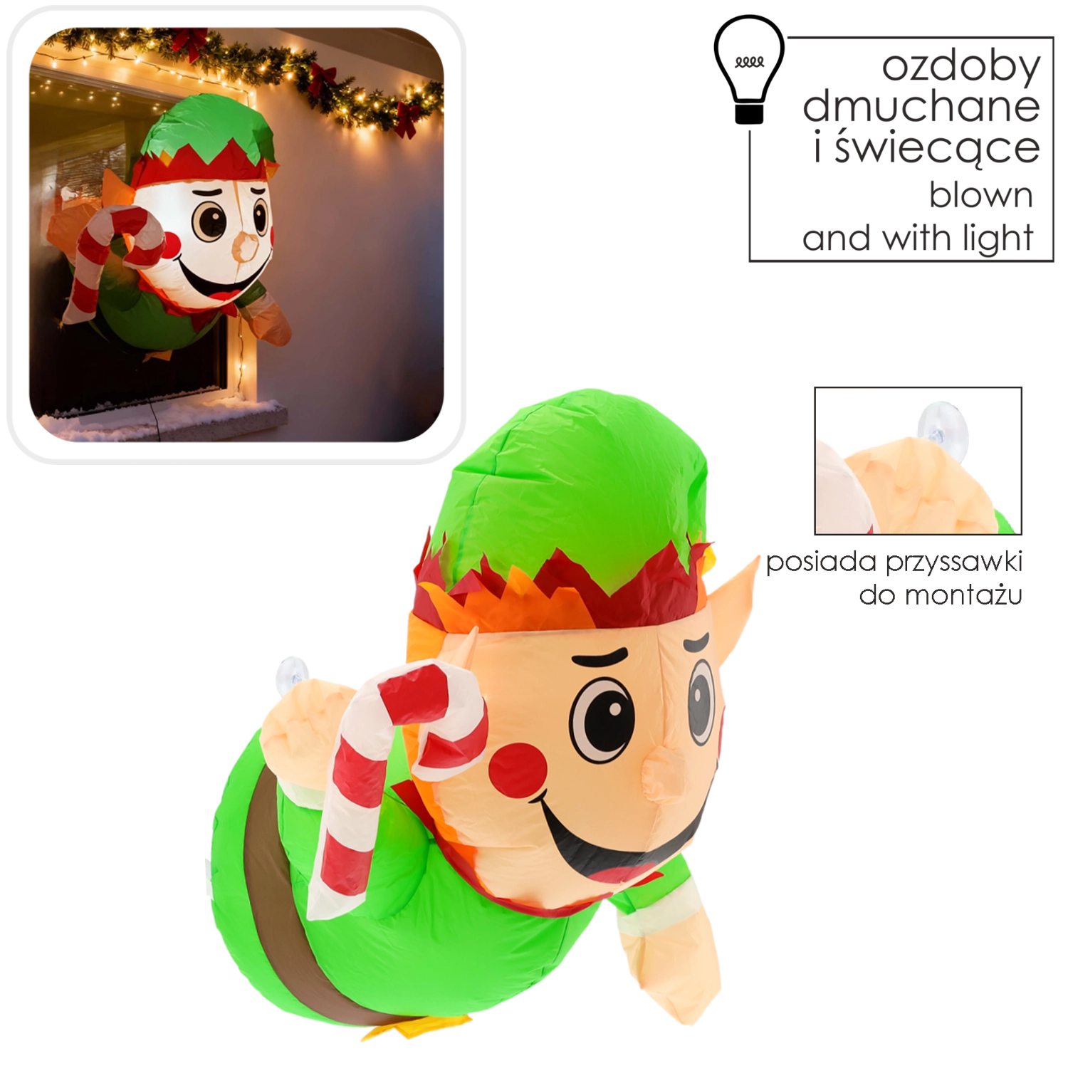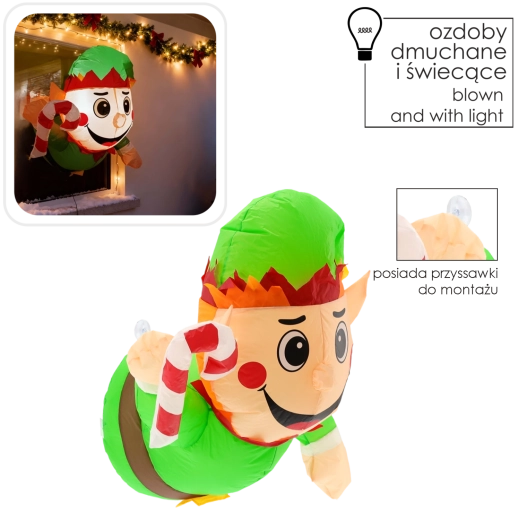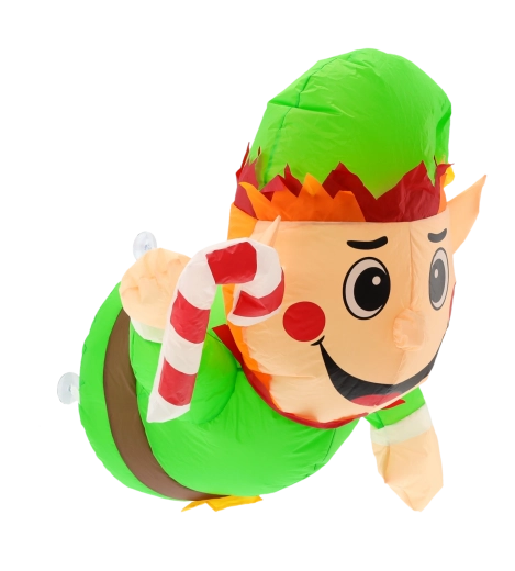 Nafukovací elf s roztomilým úsměvem a lízankou okamžitě zaujme pohledy kolemjdoucích i návštěv. Vestavěné LED diody zajišťují jemné a úsporné podsvícení, takže dekorace skvěle vynikne ve večerních hodinách na okně, dveřích či vitríně.
