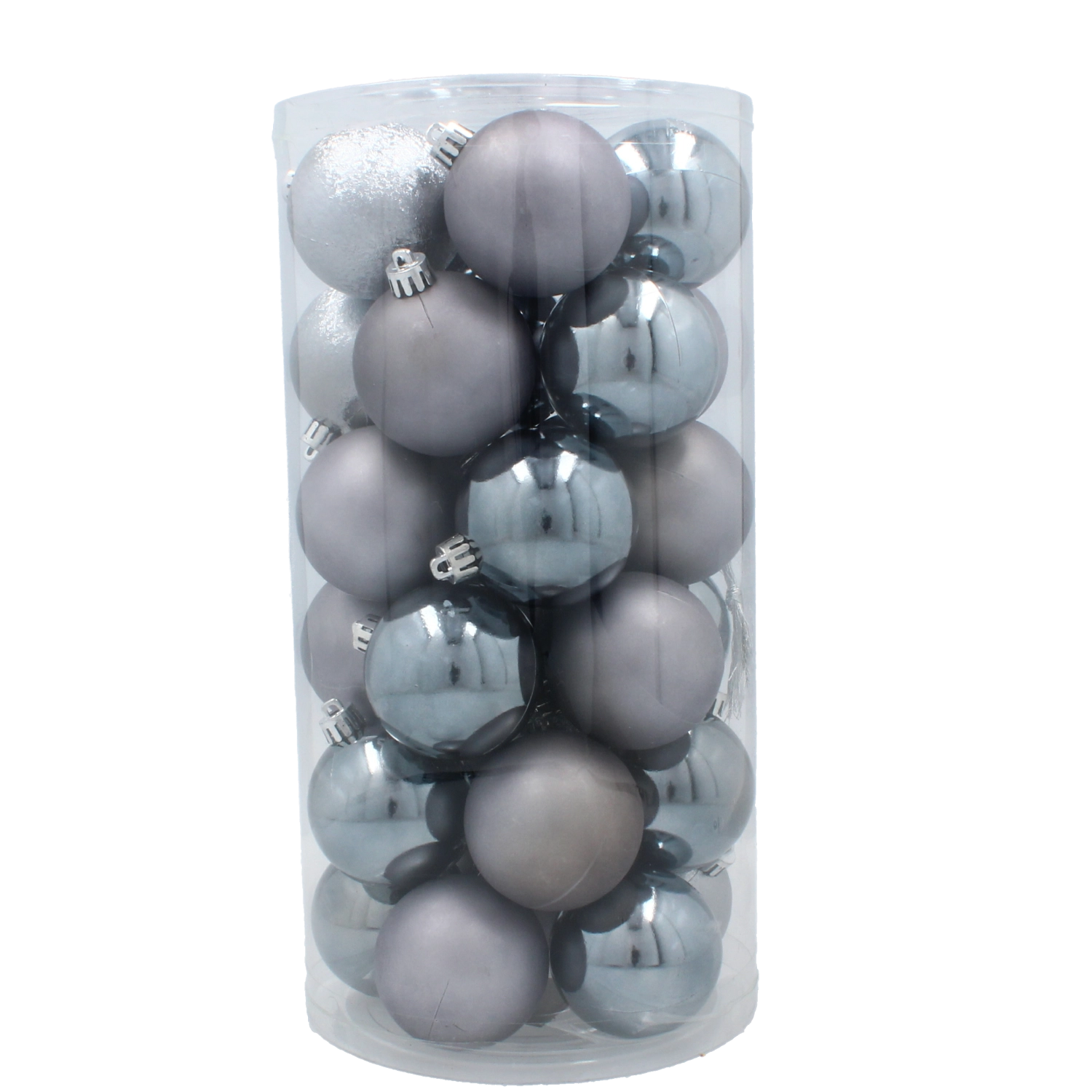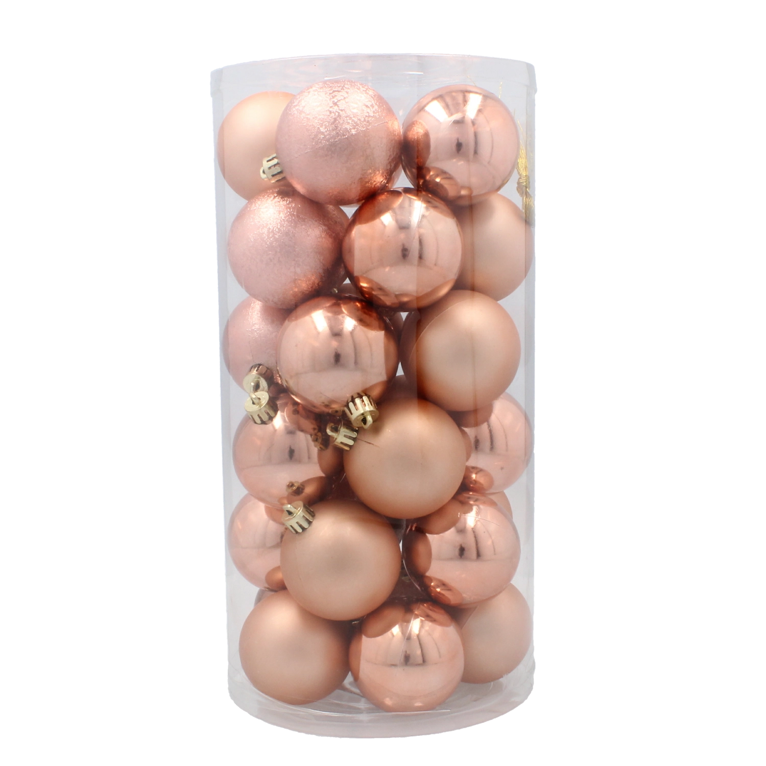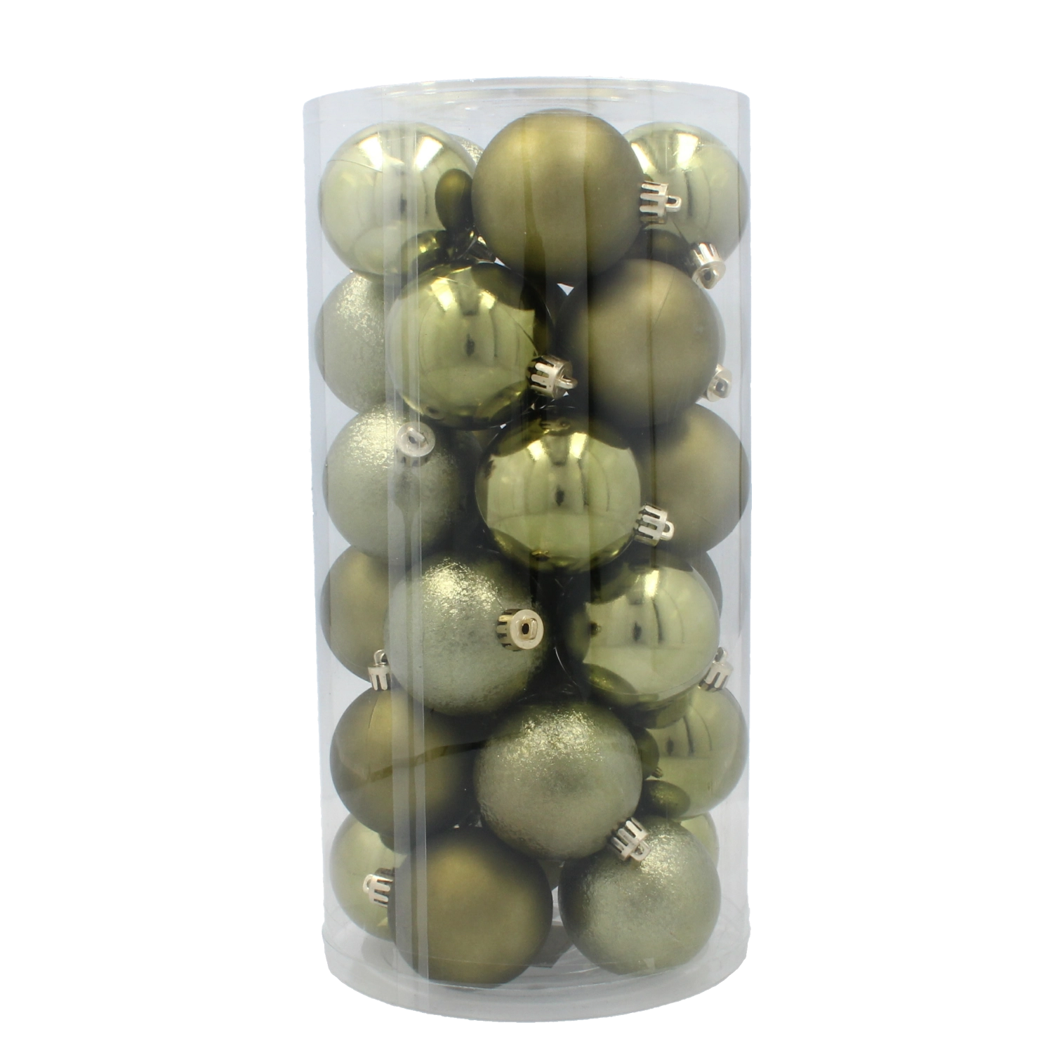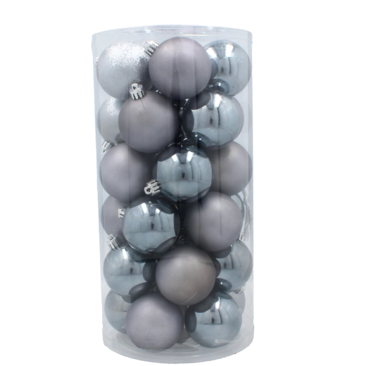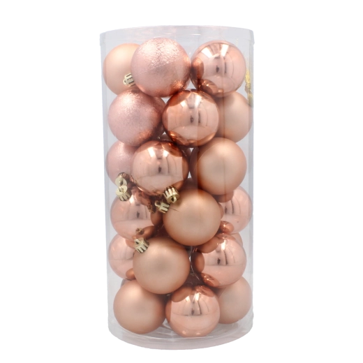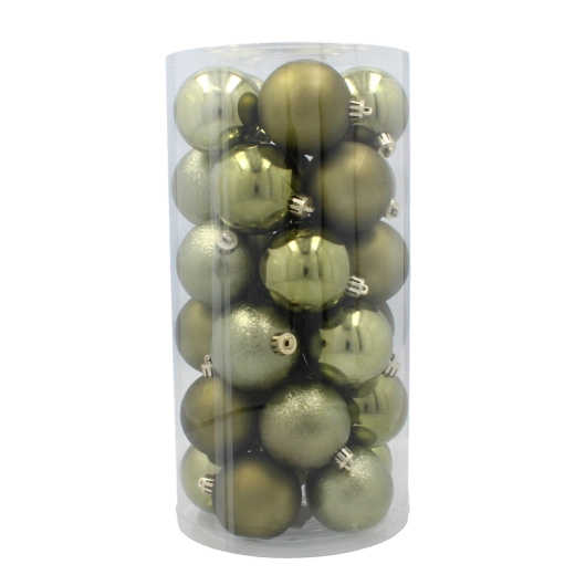 Stylová sada 30 vánočních ozdob o průměru 6 cm v elegantních odstínech olivové, měděné a grafitové dodá vašemu domovu moderní sváteční atmosféru. Odolné plastové baňky s lesklou, matnou i třpytivou povrchovou úpravou jsou lehké, nerozbitné a bezpečné pro děti i domácí mazlíčky.