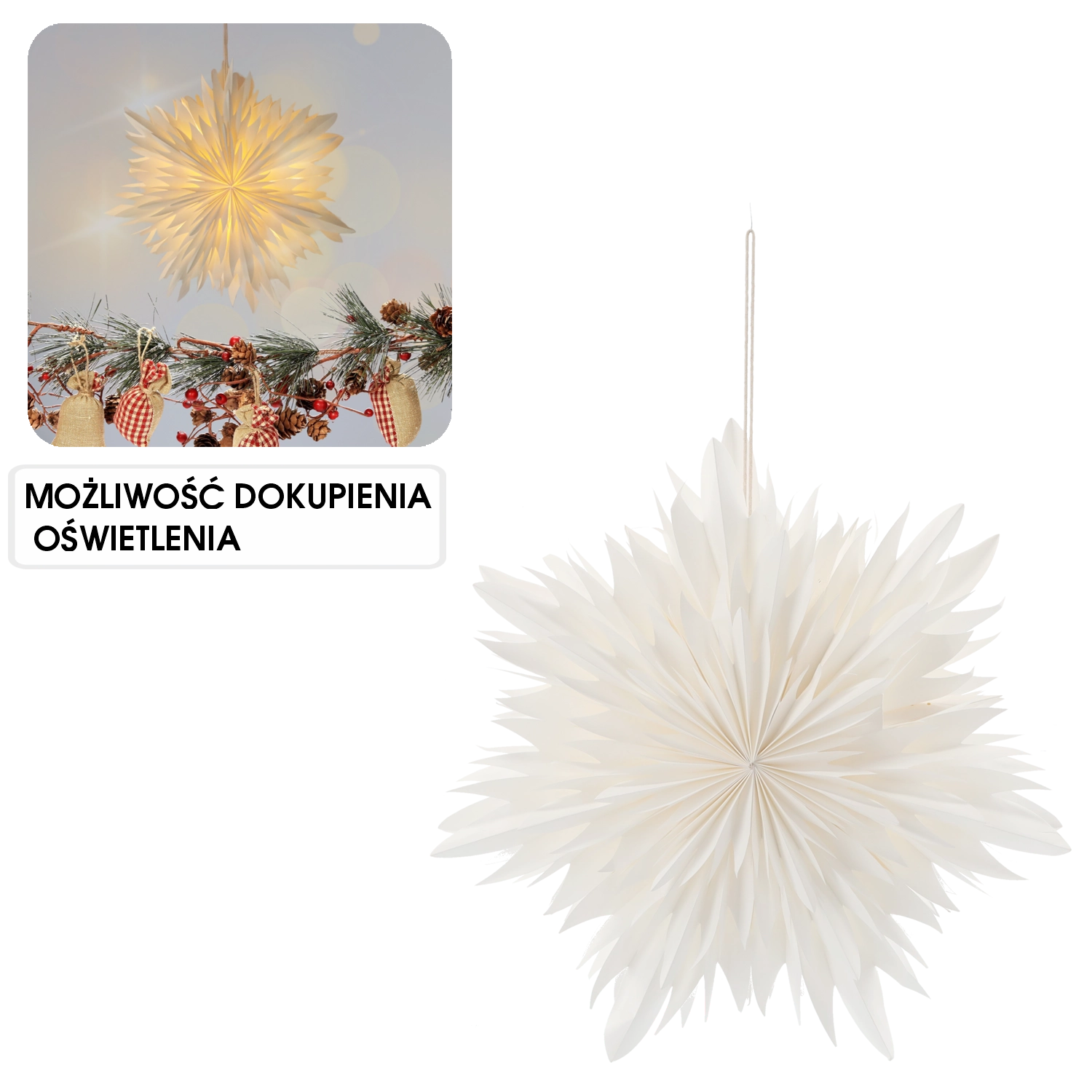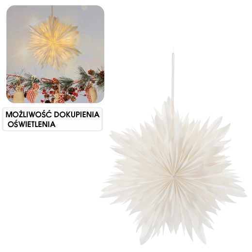 Objevte čistou eleganci v podobě bílé papírové hvězdy, která okamžitě zútulní každý prostor. Lehký papír s promyšleným skladem vytváří výrazný 3D efekt a krásně odráží světlo. Ideální pro zavěšení do okna, nad stůl či do výlohy.