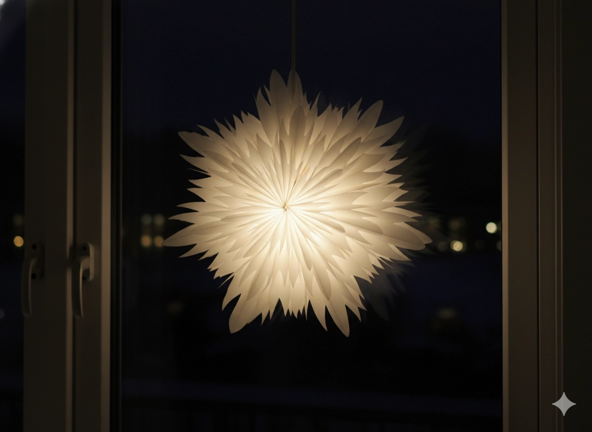 Bílý papír krásně rozptyluje teplé světlo a dodá interiéru měkký, sváteční nádech – ideální do oken, nad stůl nebo do obývacího pokoje.