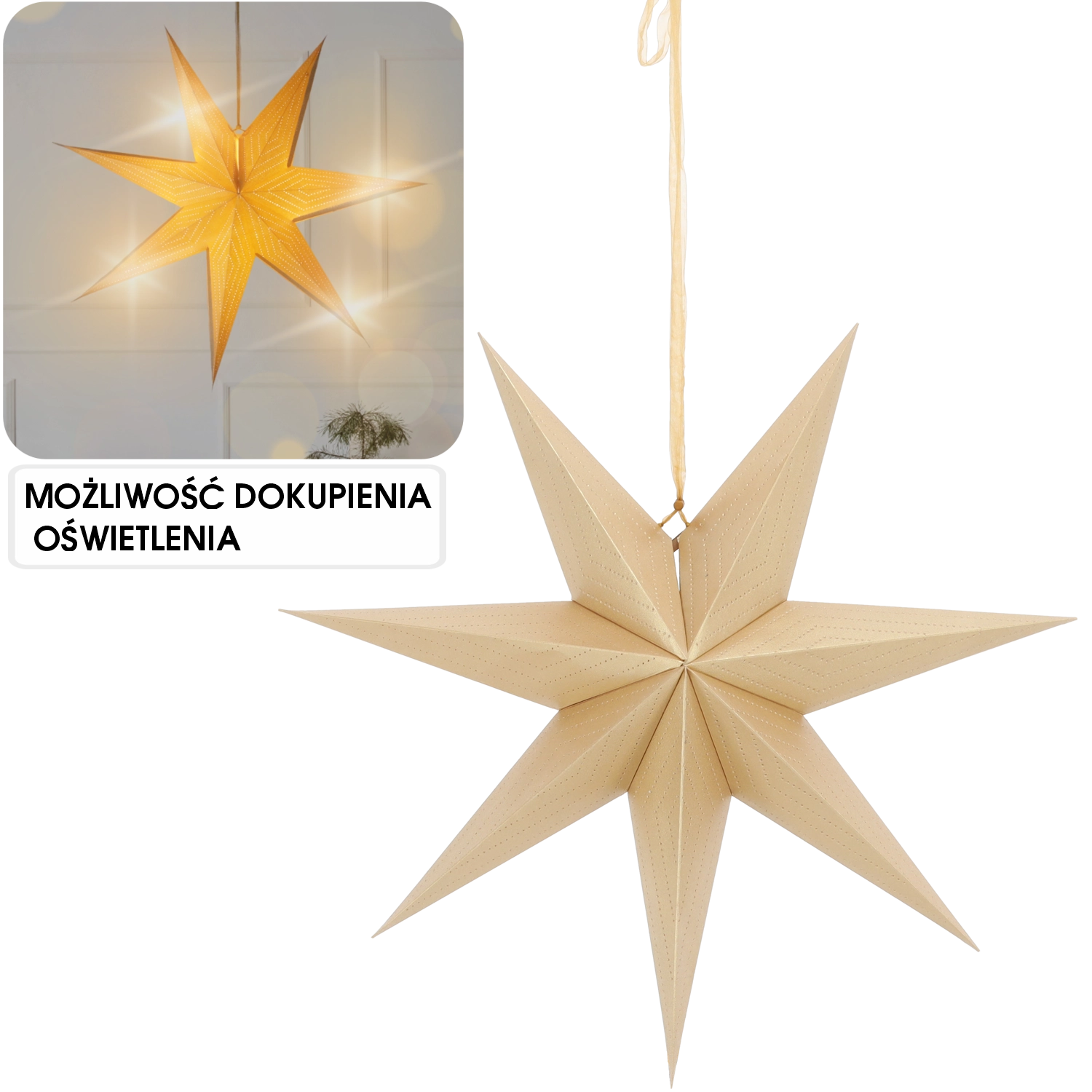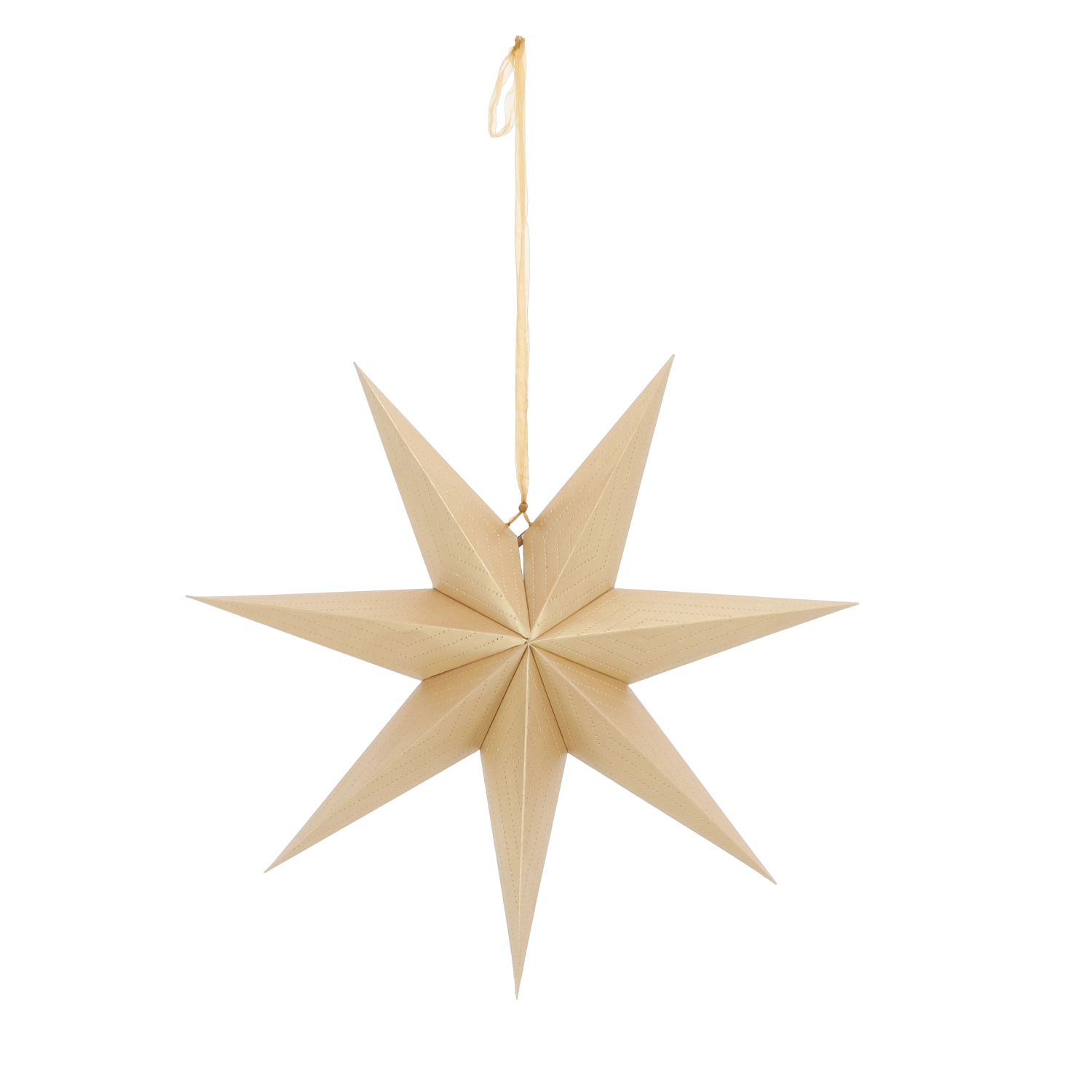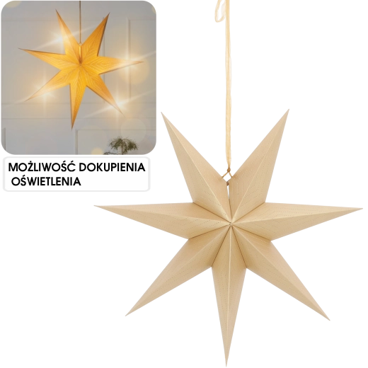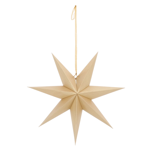 Elegantní dekorativní hvězda o průměru 60 cm v luxusní zlaté barvě dodá vašemu domovu sváteční atmosféru. Sedmicípý tvar a jemný perforovaný vzor vytváří působivé světelné efekty, zejména u zdroje světla. Je lehce zavěsitelná, skládací a vyrobena z FSC certifikovaného papíru – krásná i ekologická volba pro okno, stěnu nebo nad stůl.