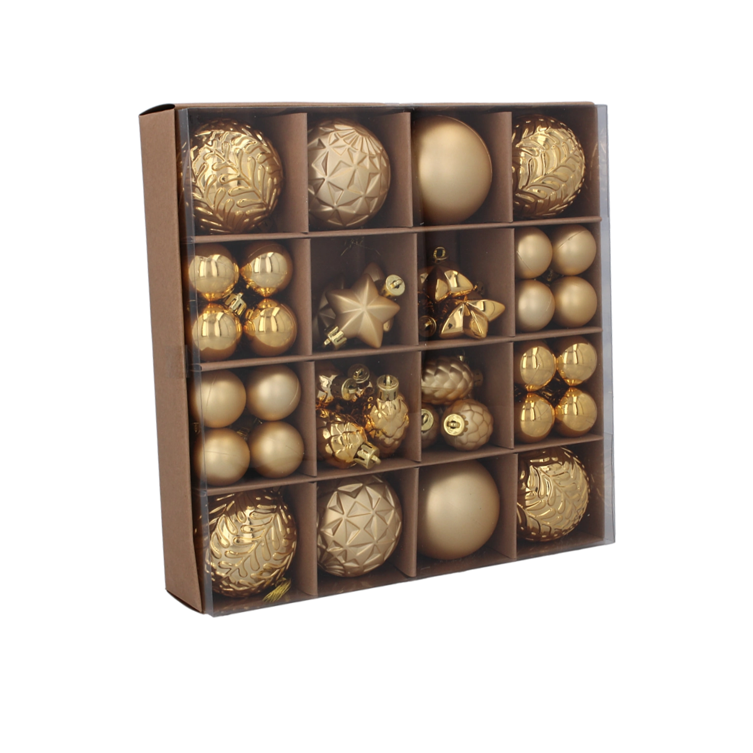 Tato univerzální sada obsahuje mix klasických koulí, hvězd a šišek v harmonicky sladěných tónech červené, zlaté a stříbrné. Díky kombinaci matných, lesklých a reliéfních povrchů dosáhnete vyvážené a elegantní výzdoby, která krásně odráží světlo a podtrhuje vánoční atmosféru.