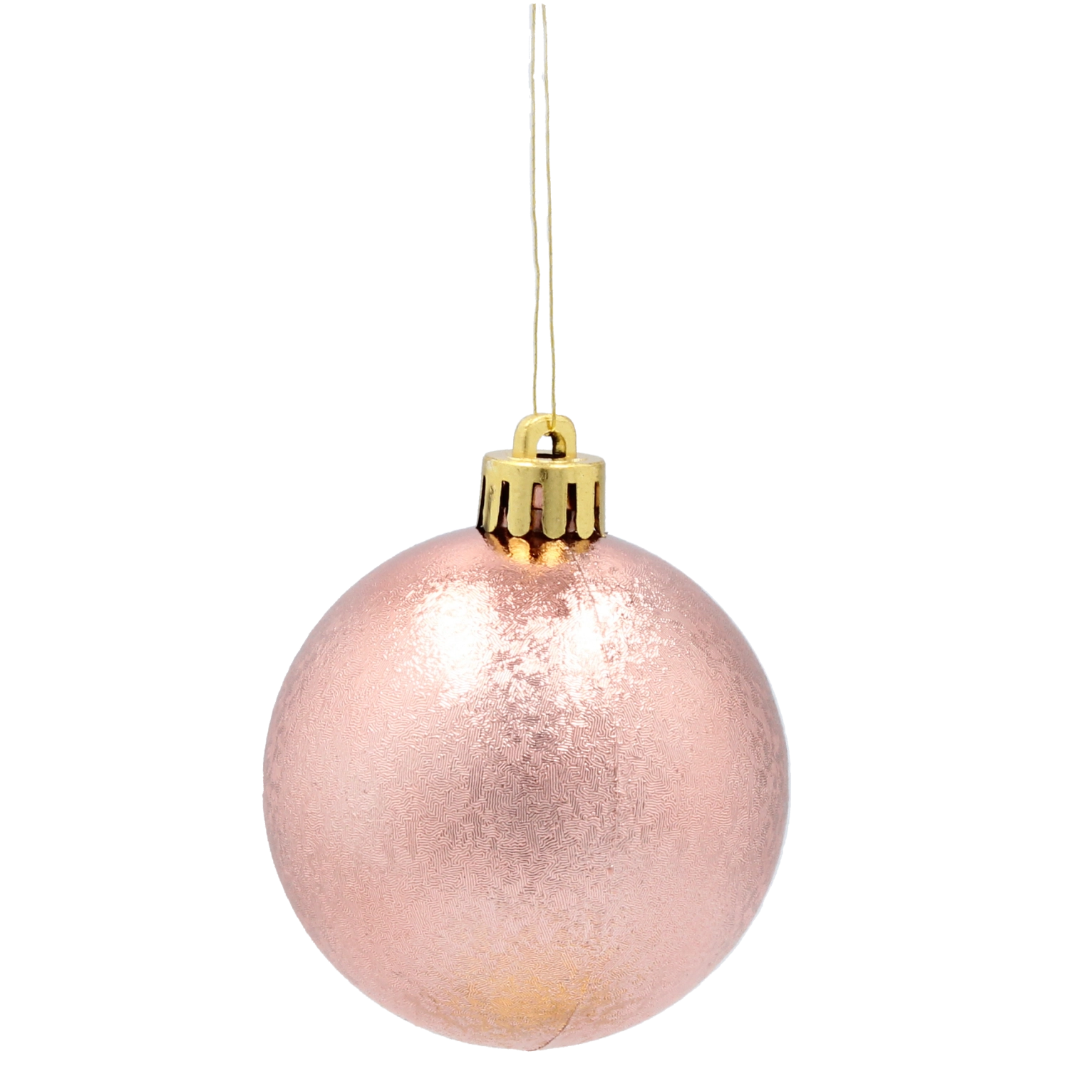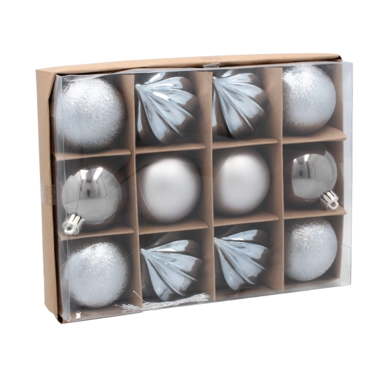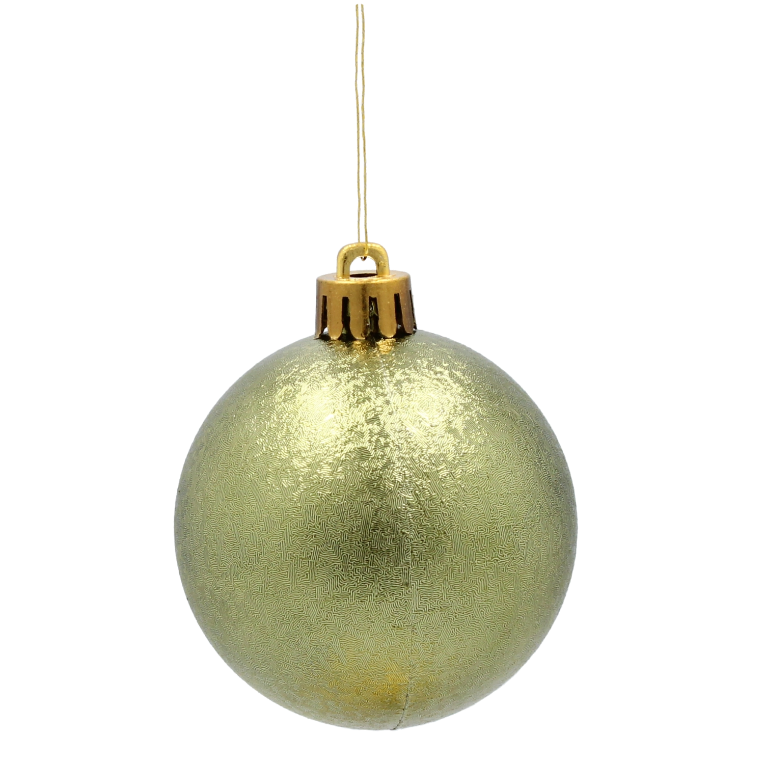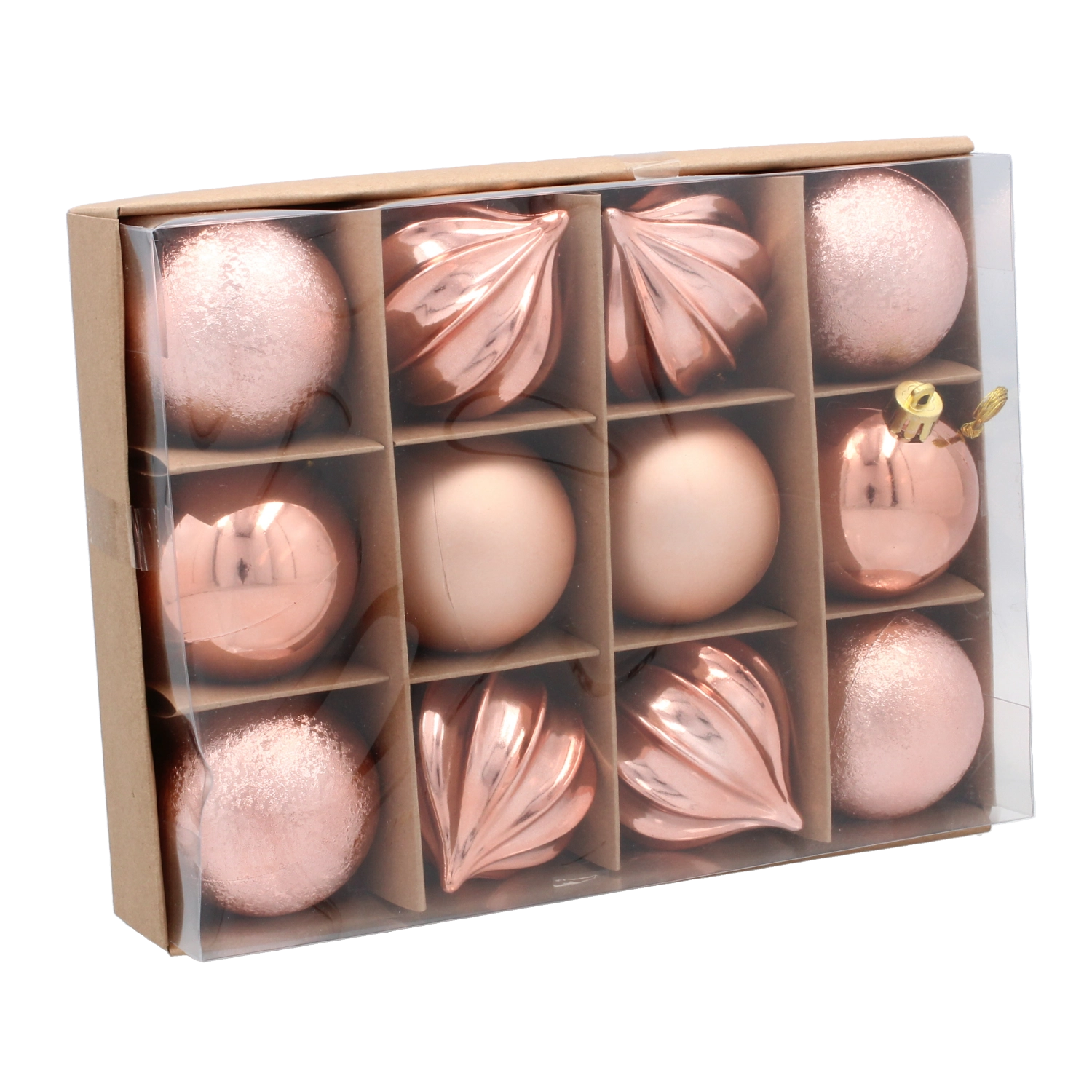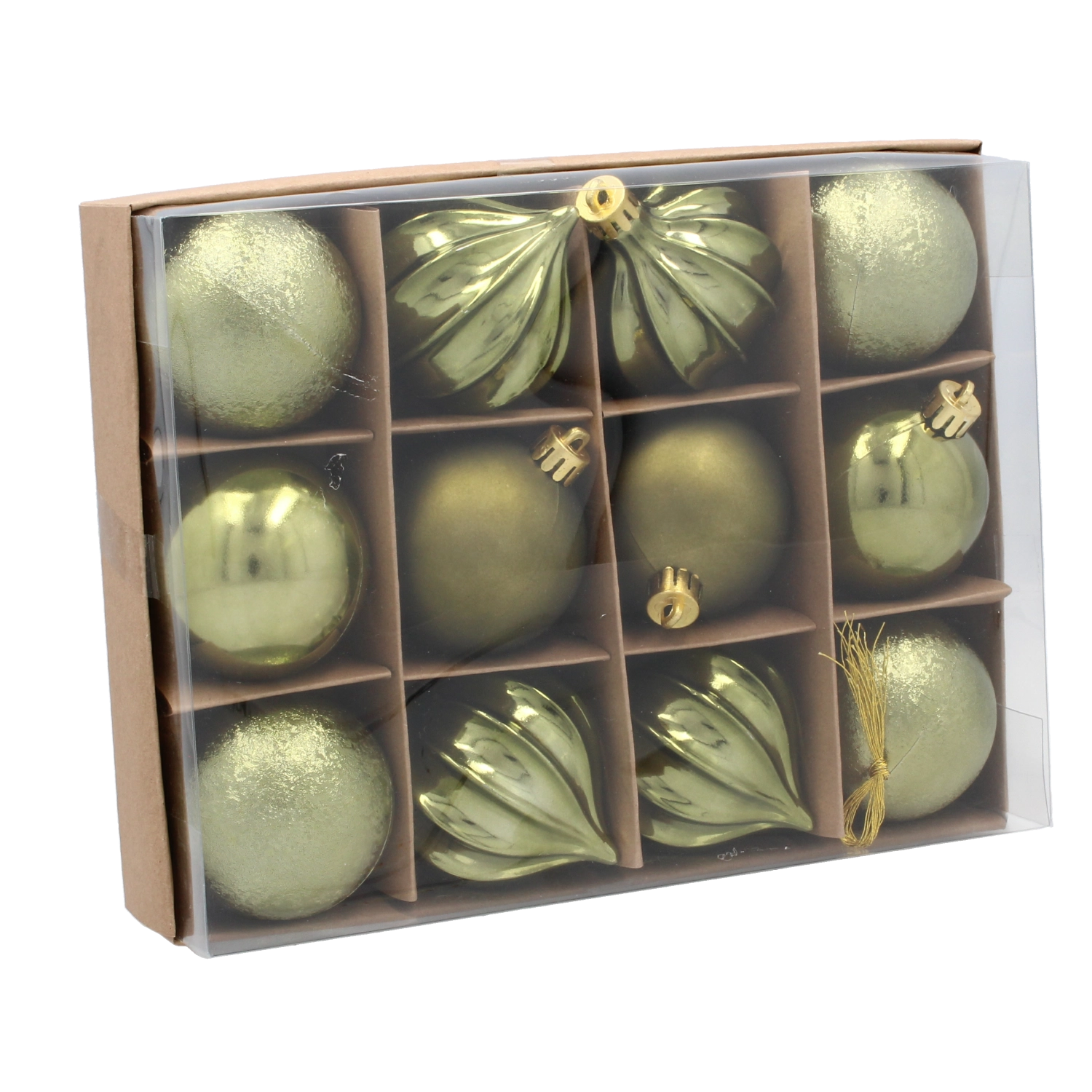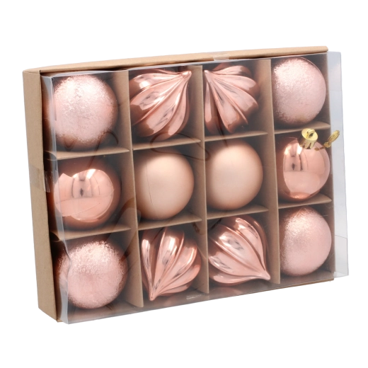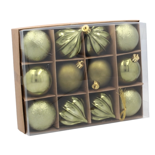 Vytvořte harmonickou sváteční atmosféru díky sadě 12 ozdob, které kombinují tři trendy odstíny – olivovou, měděnou a grafitovou. Každá koule má průměr 6 cm a díky různým povrchům a vzorům snadno dodá dekoraci hloubku a styl.
