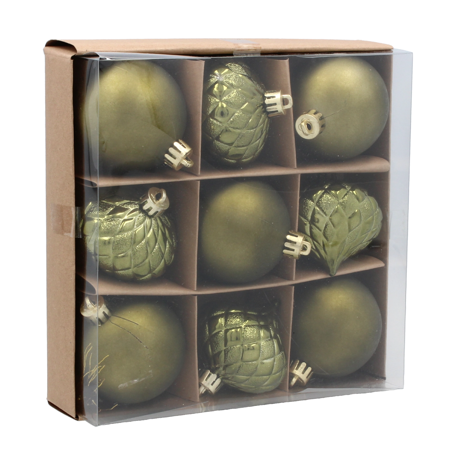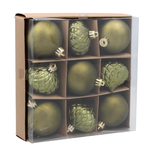 Dodejte stromku elegantní třpyt se sadou 9 ozdob o průměru 6 cm v odstínech olivové, měděné a grafitové. Kombinace moderních barev a tradičních vzorů vytváří sofistikovaný vzhled, zatímco odolný plast zajišťuje dlouhou životnost a bezpečné používání.