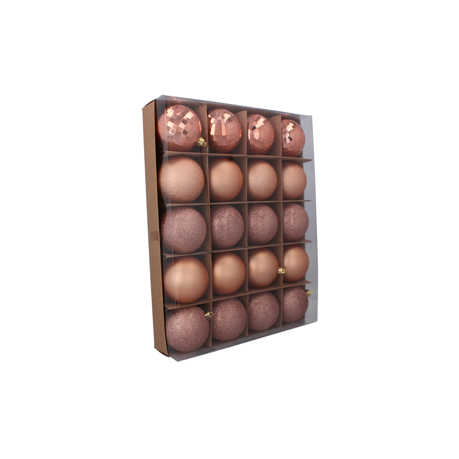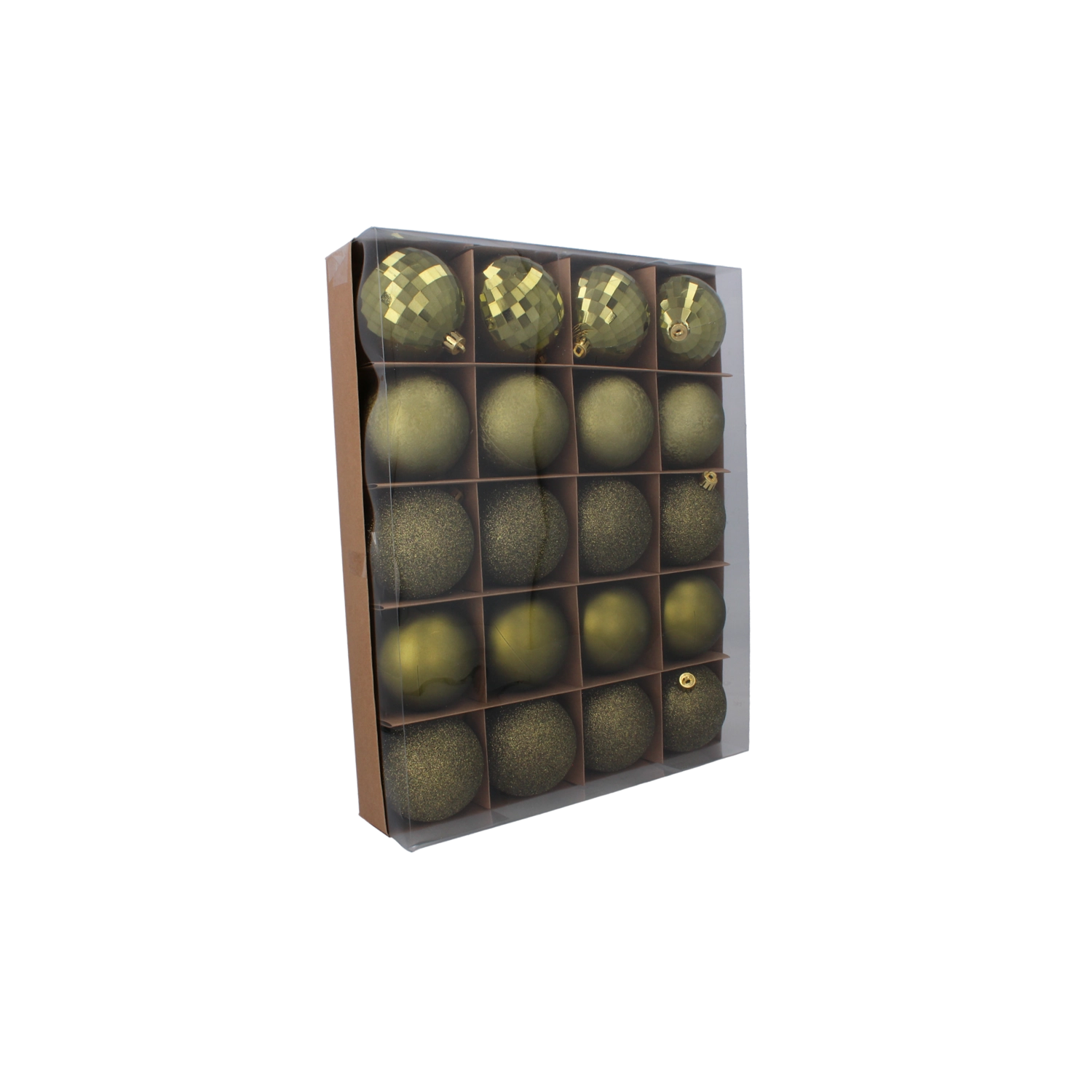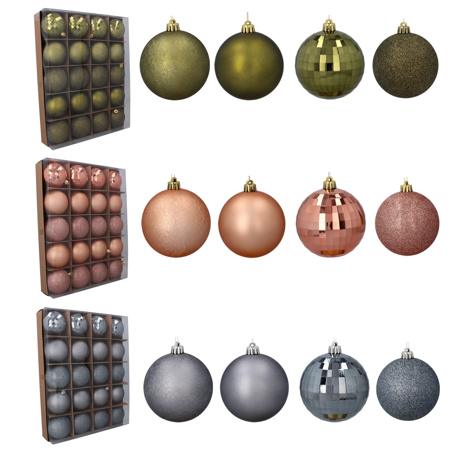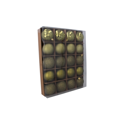 Tato univerzální sada 20 kusů přináší stylový mix textur, díky kterému snadno vytvoříte vizuálně pestrou, ale přitom sladěnou sváteční výzdobu. Kombinace olivové, měděné a grafitové barvy působí moderně a nadčasově – hodí se do klasických i minimalistických interiérů.