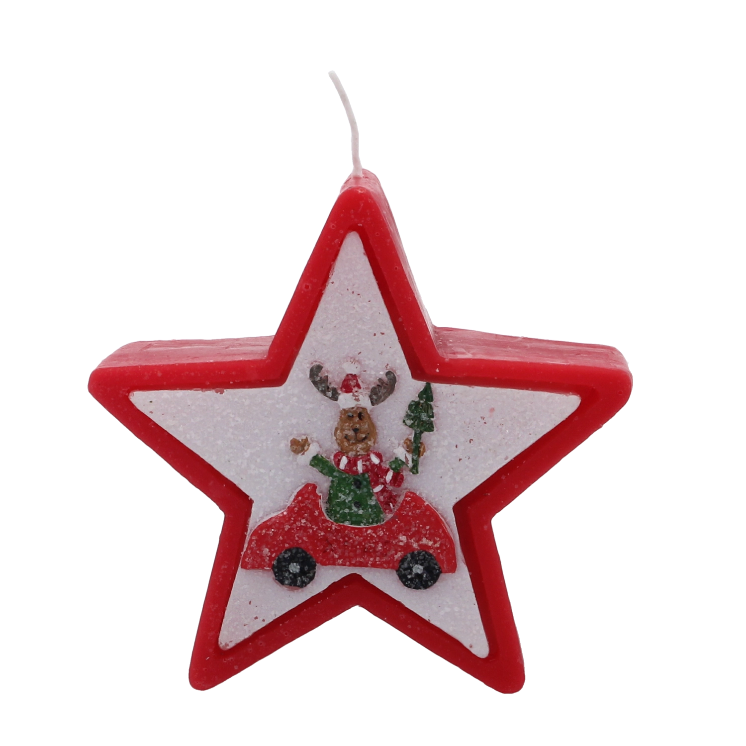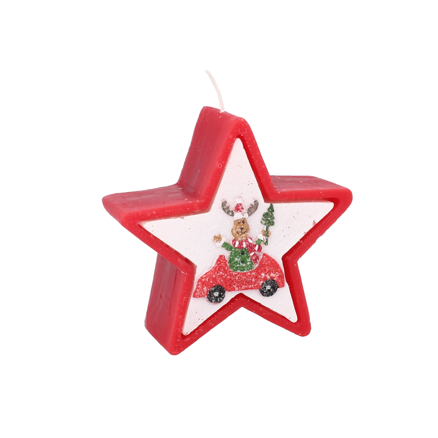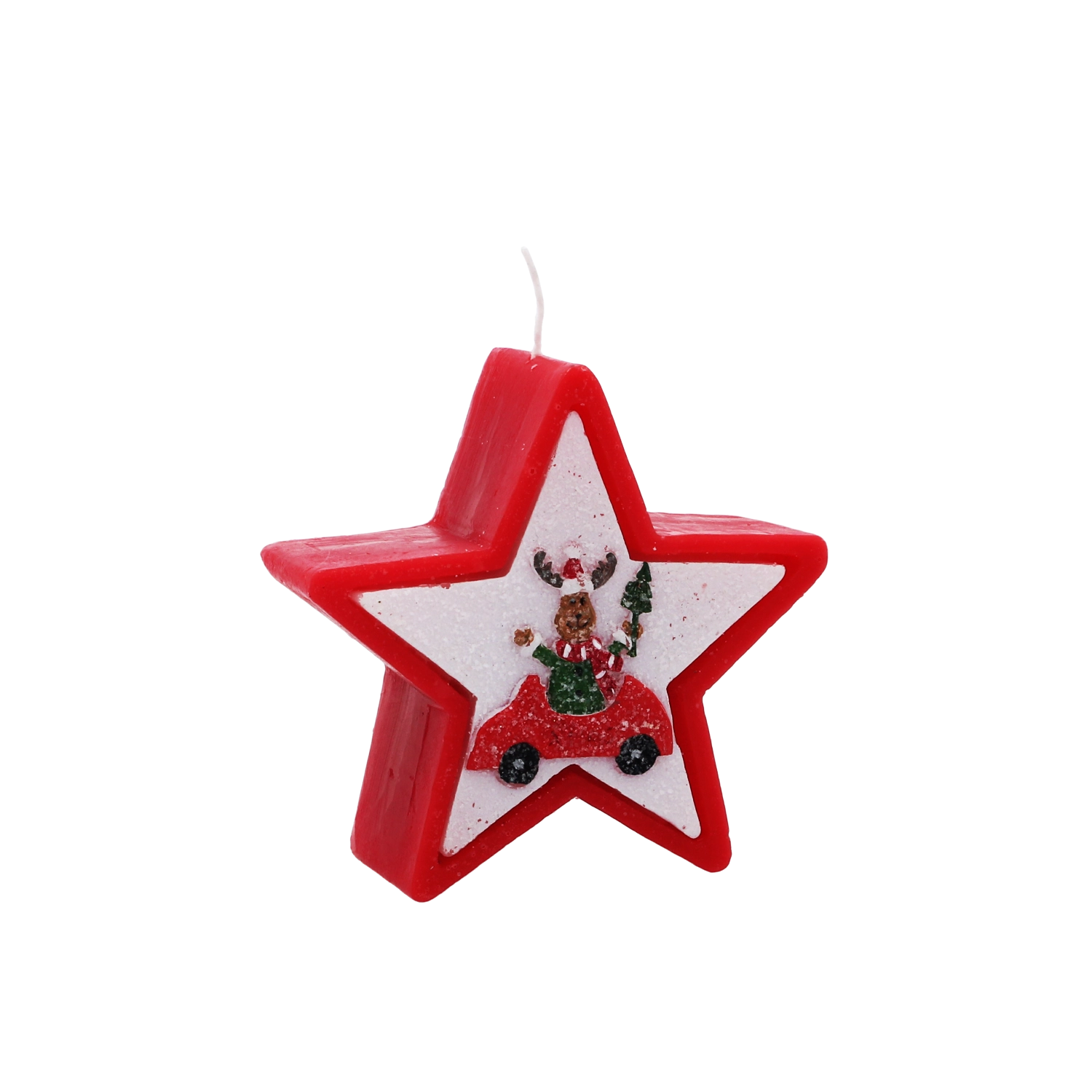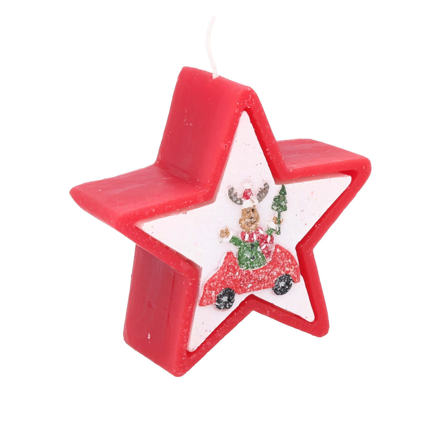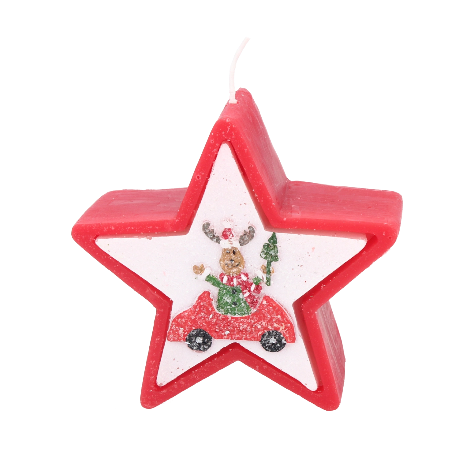 Tato vánoční svíčka v elegantním tvaru hvězdy zaujme veselým motivem soba v autě a okamžitě navodí hřejivou sváteční náladu. Kvalitní vosk zajišťuje stabilní a rovnoměrné hoření, takže si její světlo užijete déle.