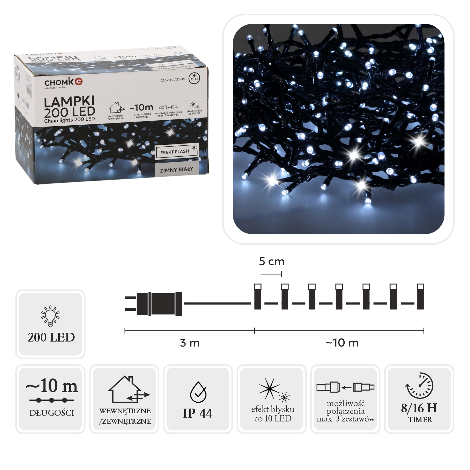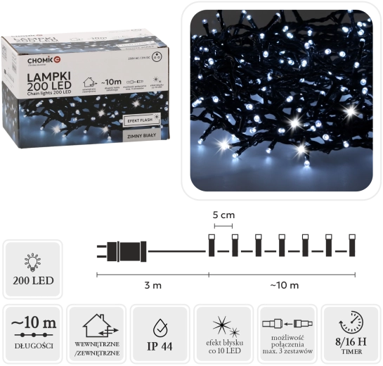 Dopřejte si kouzelnou atmosféru se světelným řetězem, který kombinuje elegantní studeně bílou barvu s jemným blikajícím efektem. Díky délce 10 m světelné části a 200 LED s rozestupy 5 cm snadno nasvítíte stromek, zábradlí i fasádu. Zelený kabel přirozeně splyne s větvemi, černý adaptér neruší vzhled instalace.