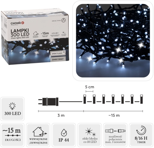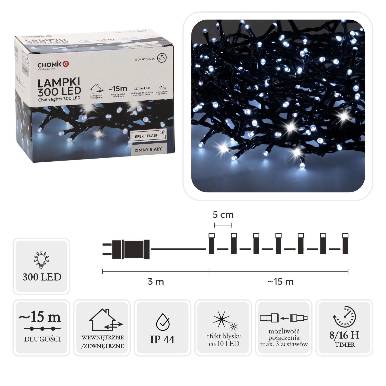 Vytvořte sváteční atmosféru s LED světelným řetězem o délce až 18 m a se 300 diodami ve studeně bílém odstínu doplněném o flash efekt. Řetěz nabízí stálé svícení i blikání, programátor s pamětí a časovačem 8/16 h, je vhodný do interiéru i exteriéru (IP44) a díky zelené izolaci skvěle splyne s větvemi stromků.