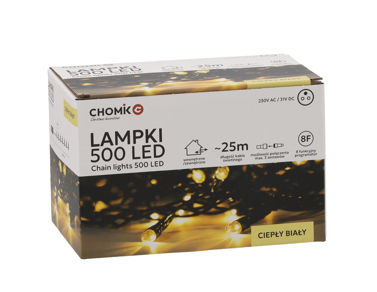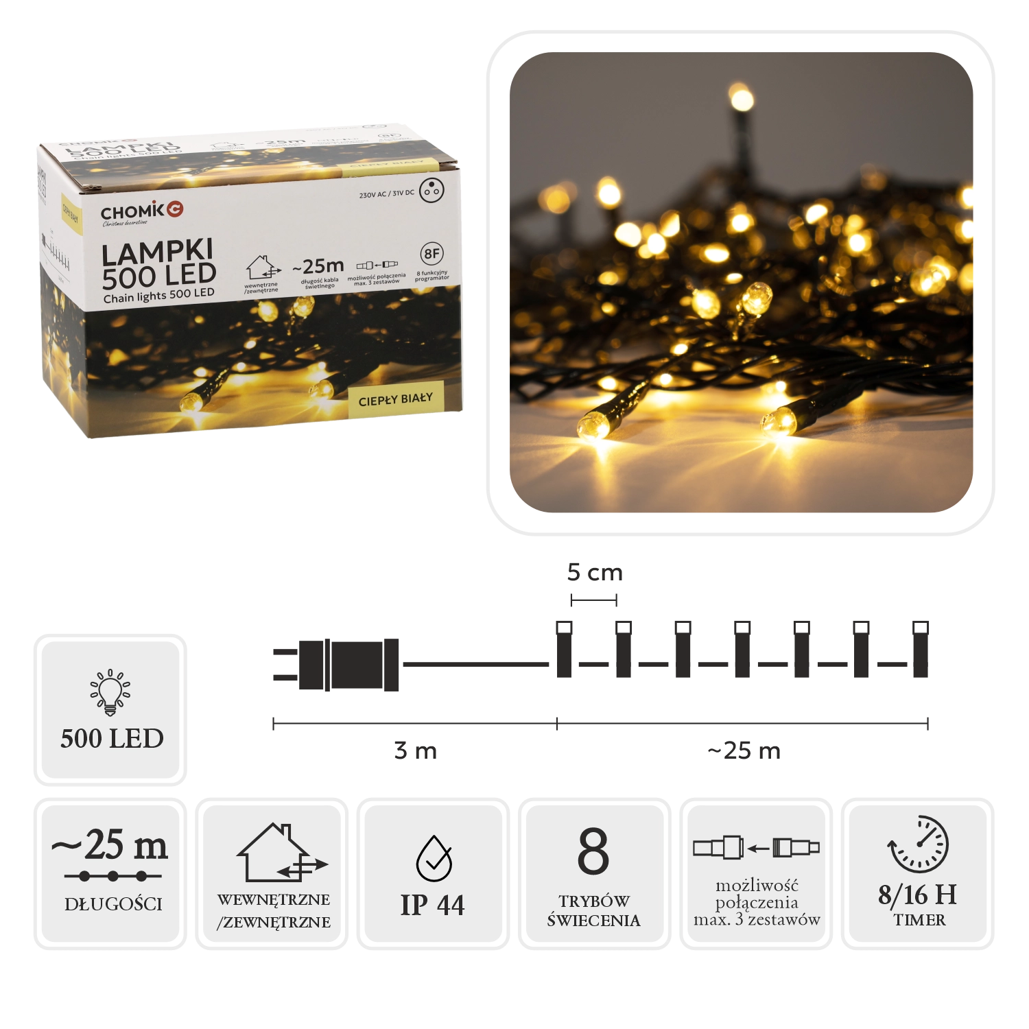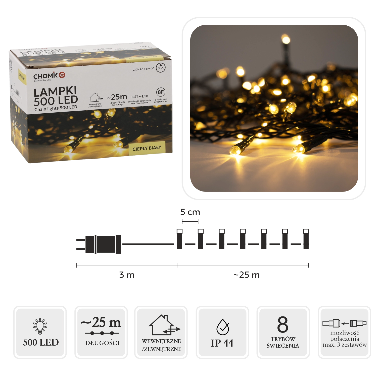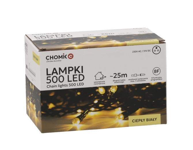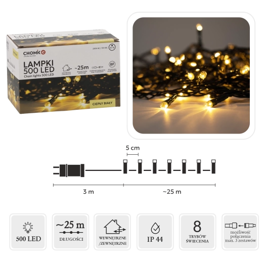 Hledáte spolehlivé a elegantní vánoční osvětlení? Tento LED světelný řetěz s 500 diodami v teplé bílé barvě dodá vašemu prostoru útulnou a sváteční atmosféru. Díky délce světelné části 25 m a rozteči 5 cm rovnoměrně pokryje stromek, fasádu i zábradlí.