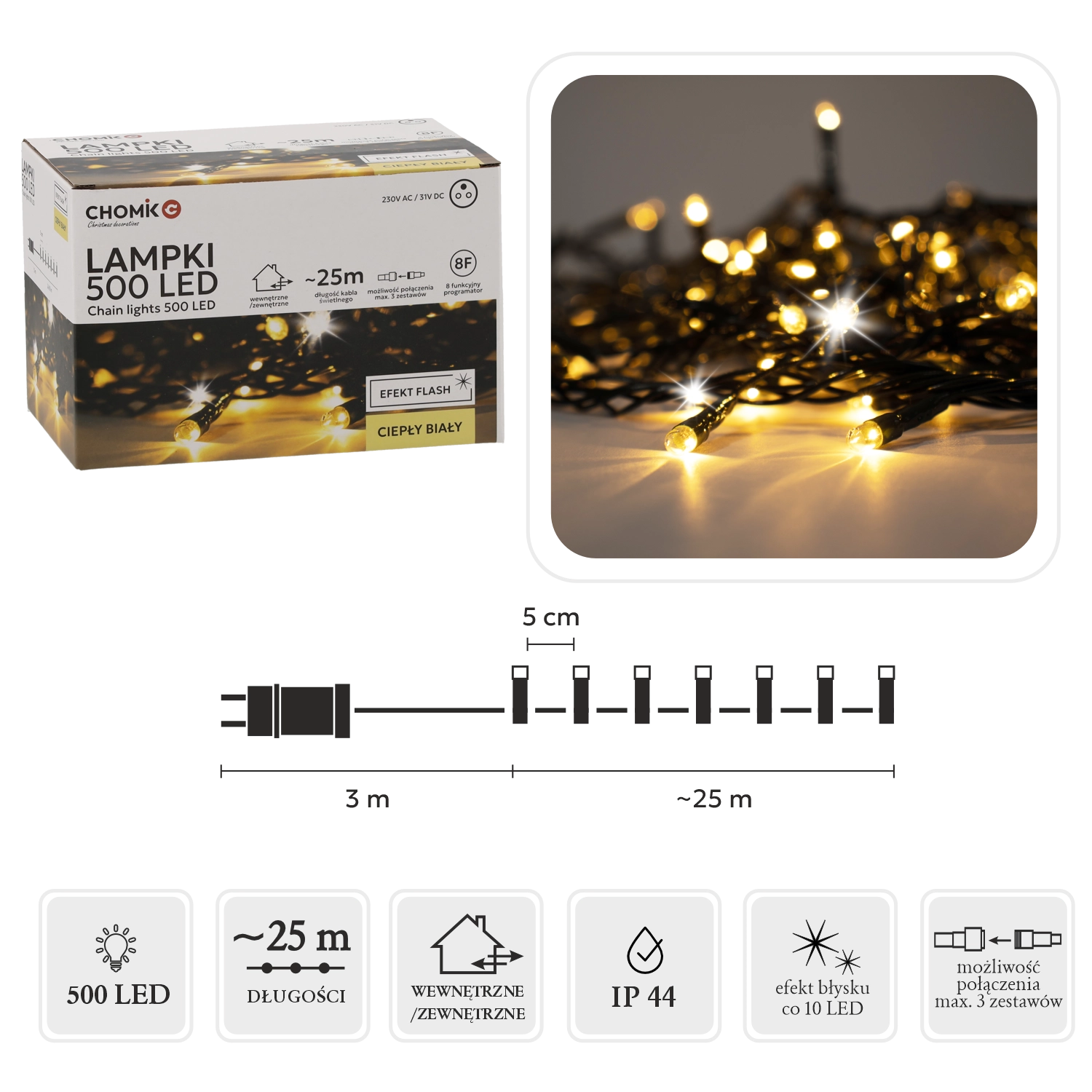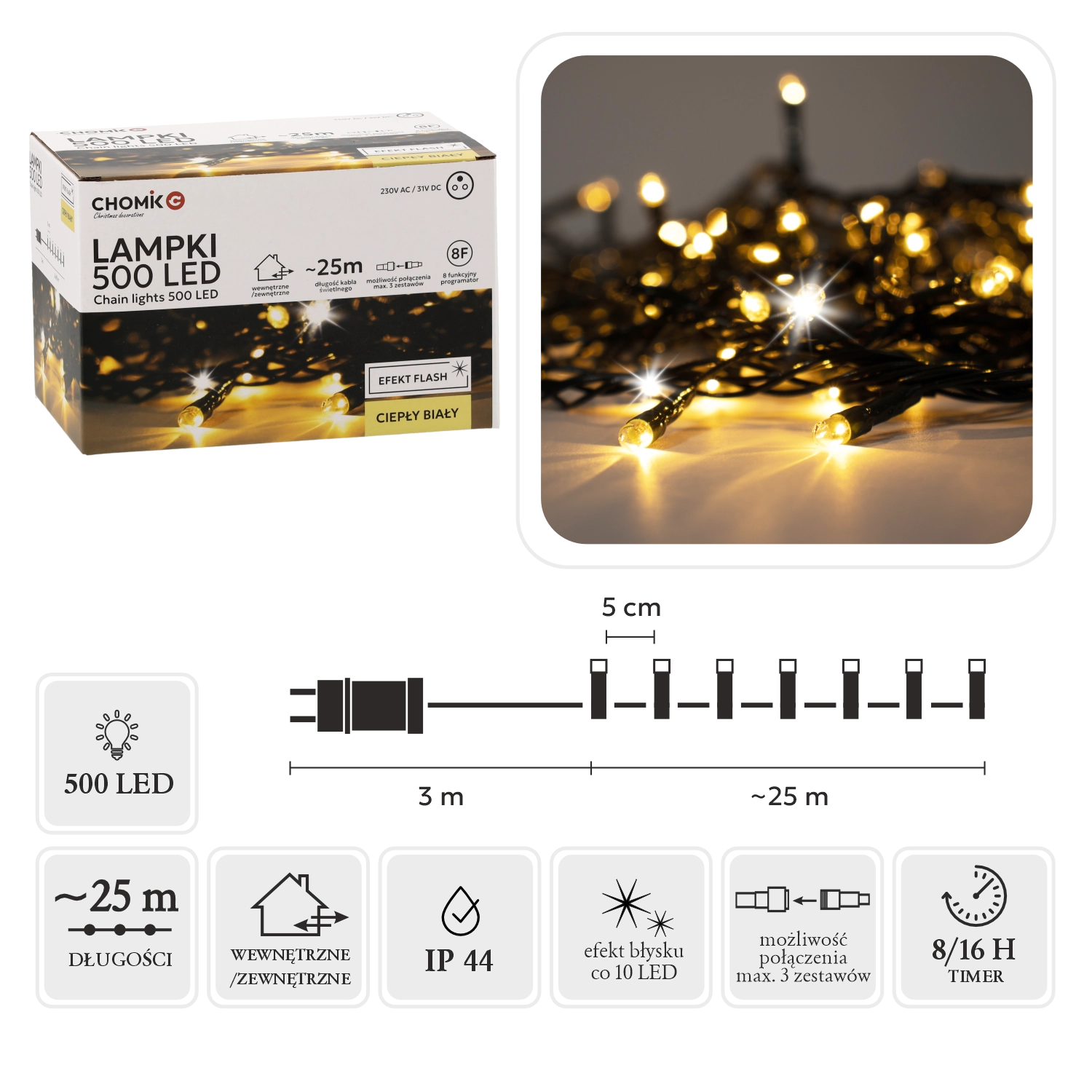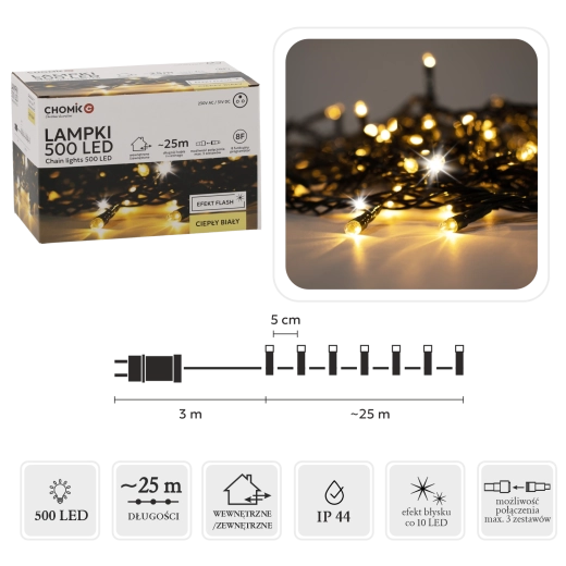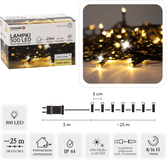 Řetěz je připraven pro použití uvnitř i venku (IP44). Programátor s pamětí si pamatuje poslední nastavení a časovač 8/16 h zajišťuje automatické vypínání a zapínání. Díky možnosti propojit až 3 stejné řetězy jednoduše pokryjete i velmi velké plochy.