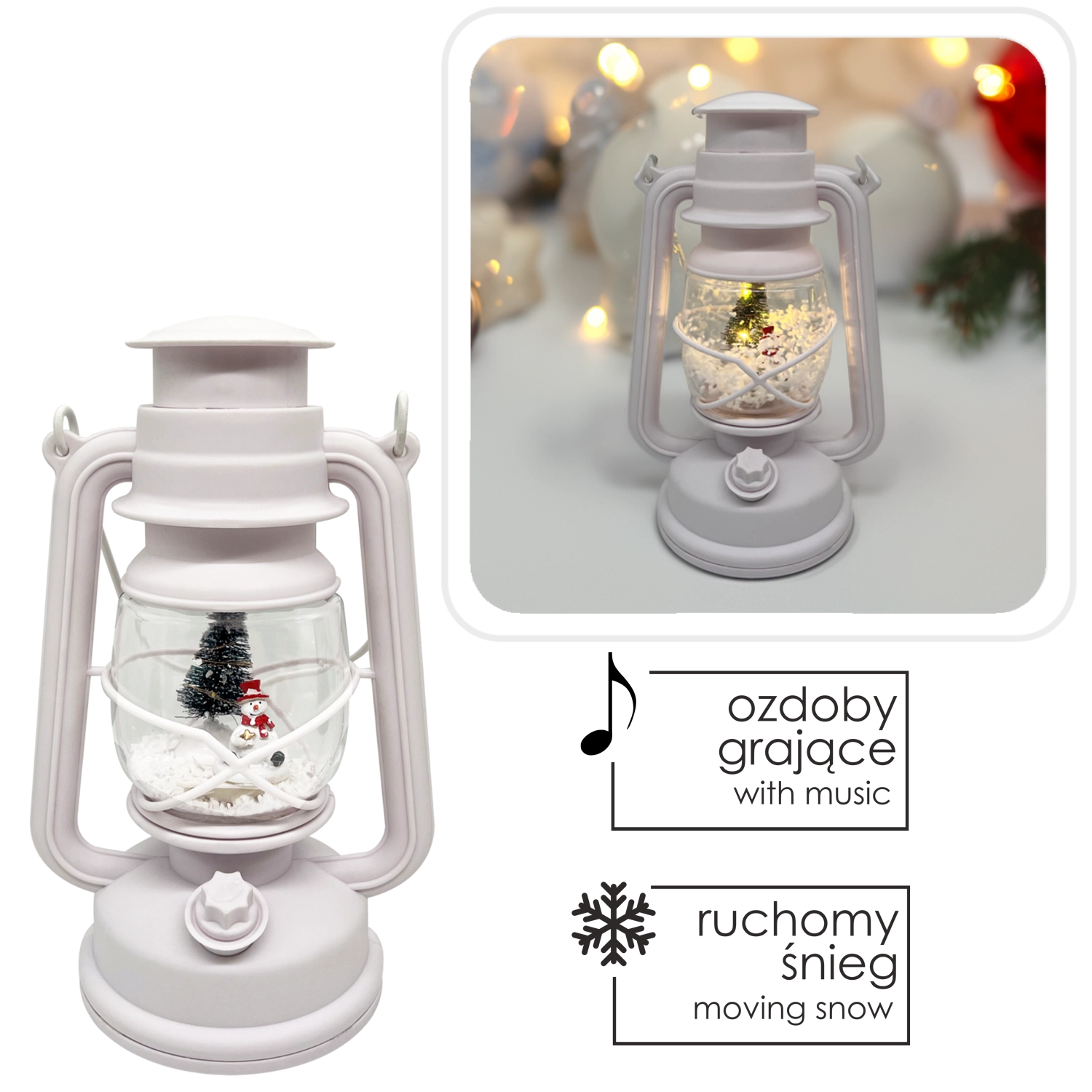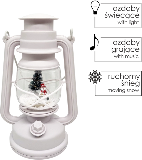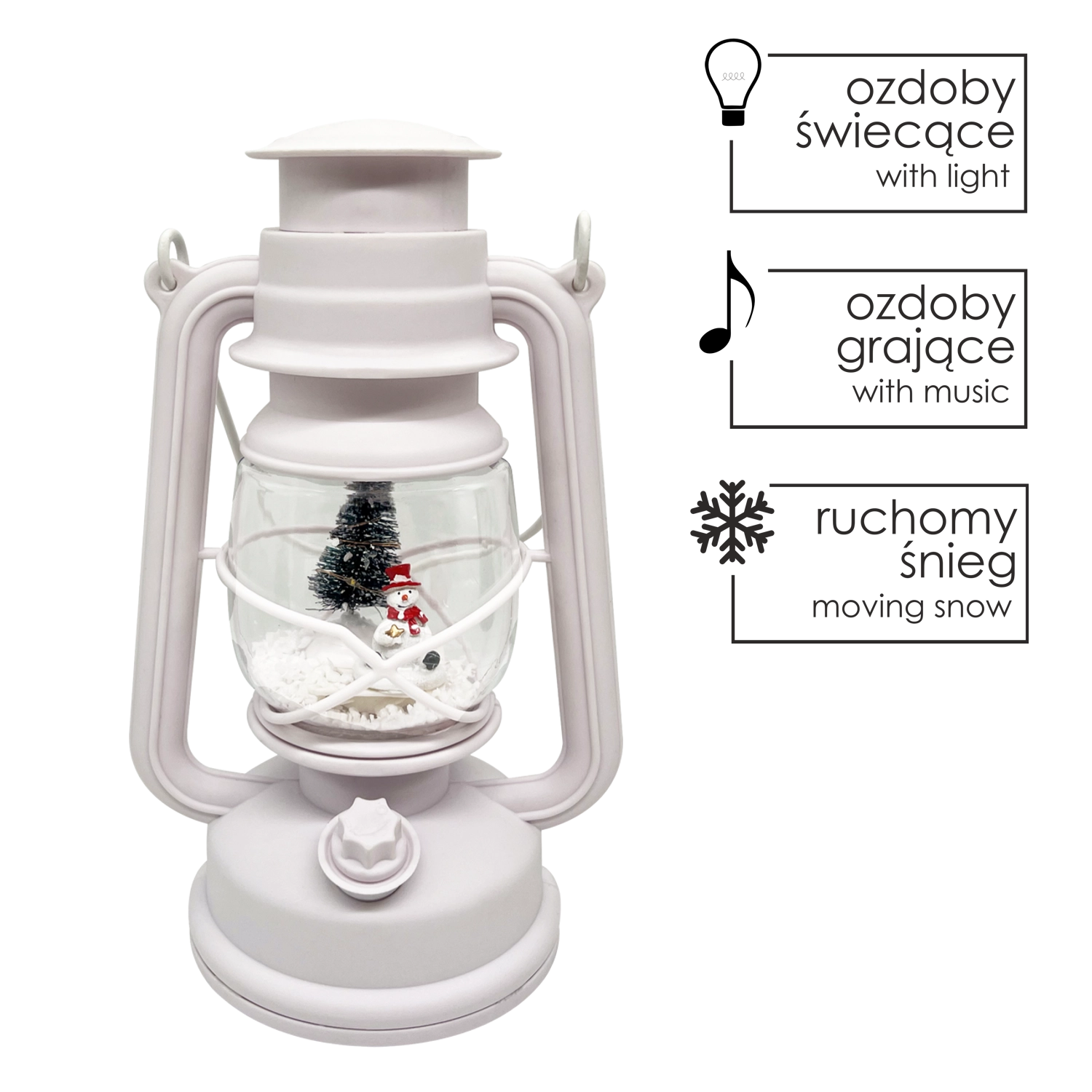 Dopřejte svému interiéru vánoční kouzlo s bílým lampionem CHOMIK, který kombinuje dekorativní vzhled s praktickými funkcemi. Vestavěné LED osvětlení zajistí jemné a úsporné světlo, zatímco hrací strojek podtrhne sváteční náladu příjemnou melodií. Motiv roztomilého sněhuláka se stromečkem potěší děti i dospělé.