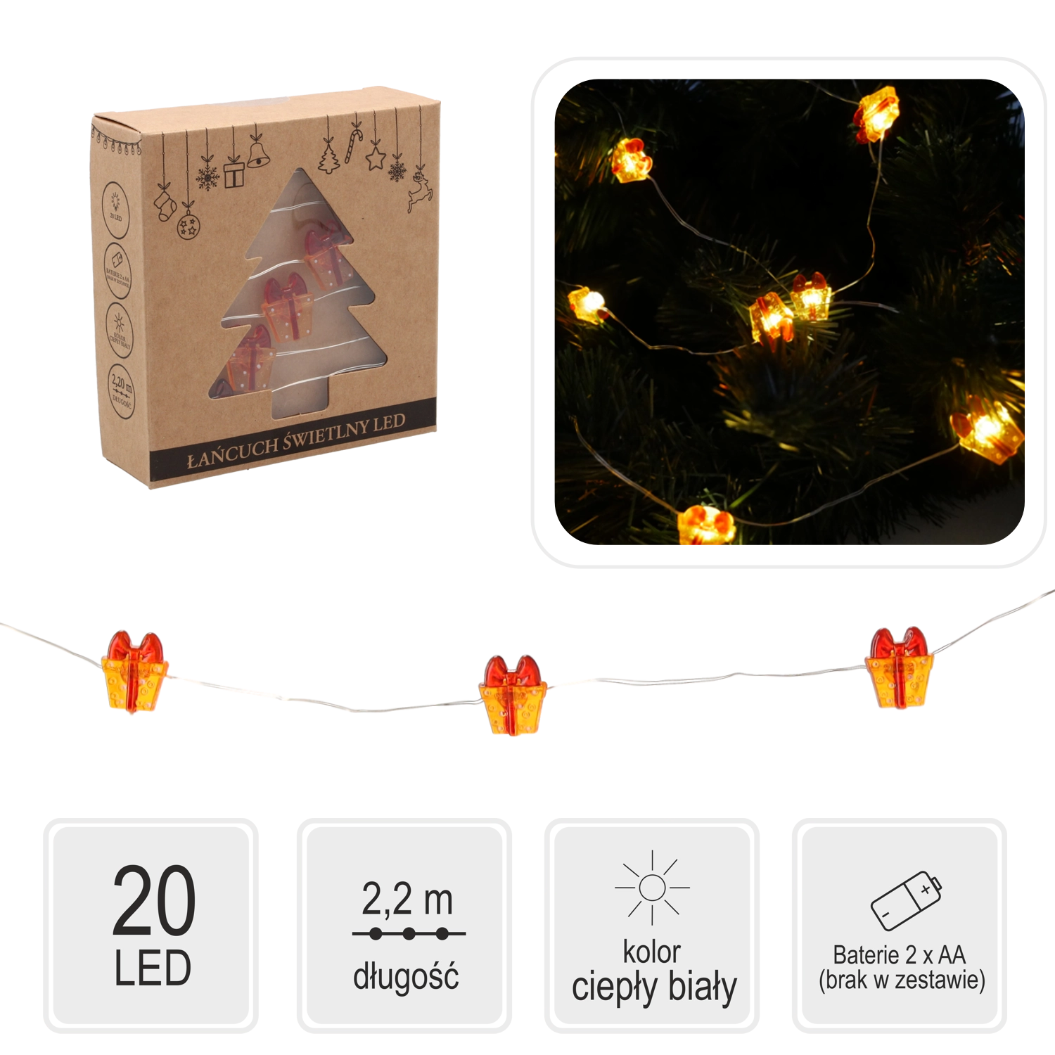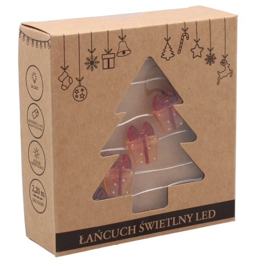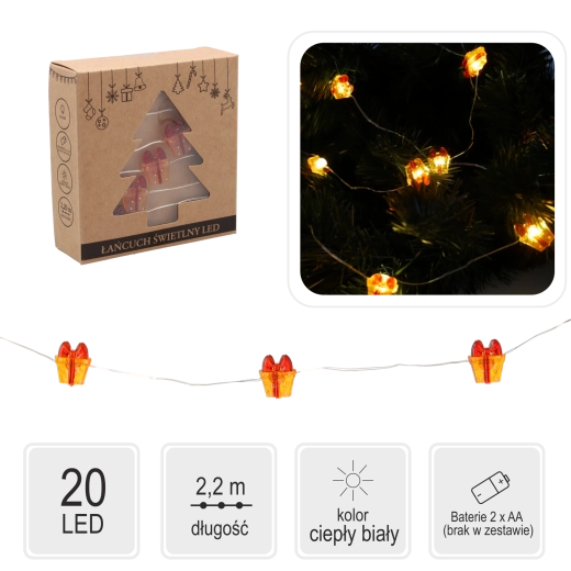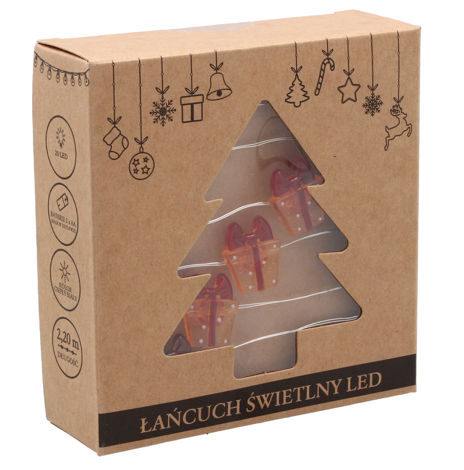 Rozzářete domov vánoční atmosférou se světelným řetězem s motivem dárků. 20 teplých bílých LED vytváří útulné náladové světlo, bateriové napájení umožní dekorovat kdekoliv – na stromku, okně, polici i ve věnci.
