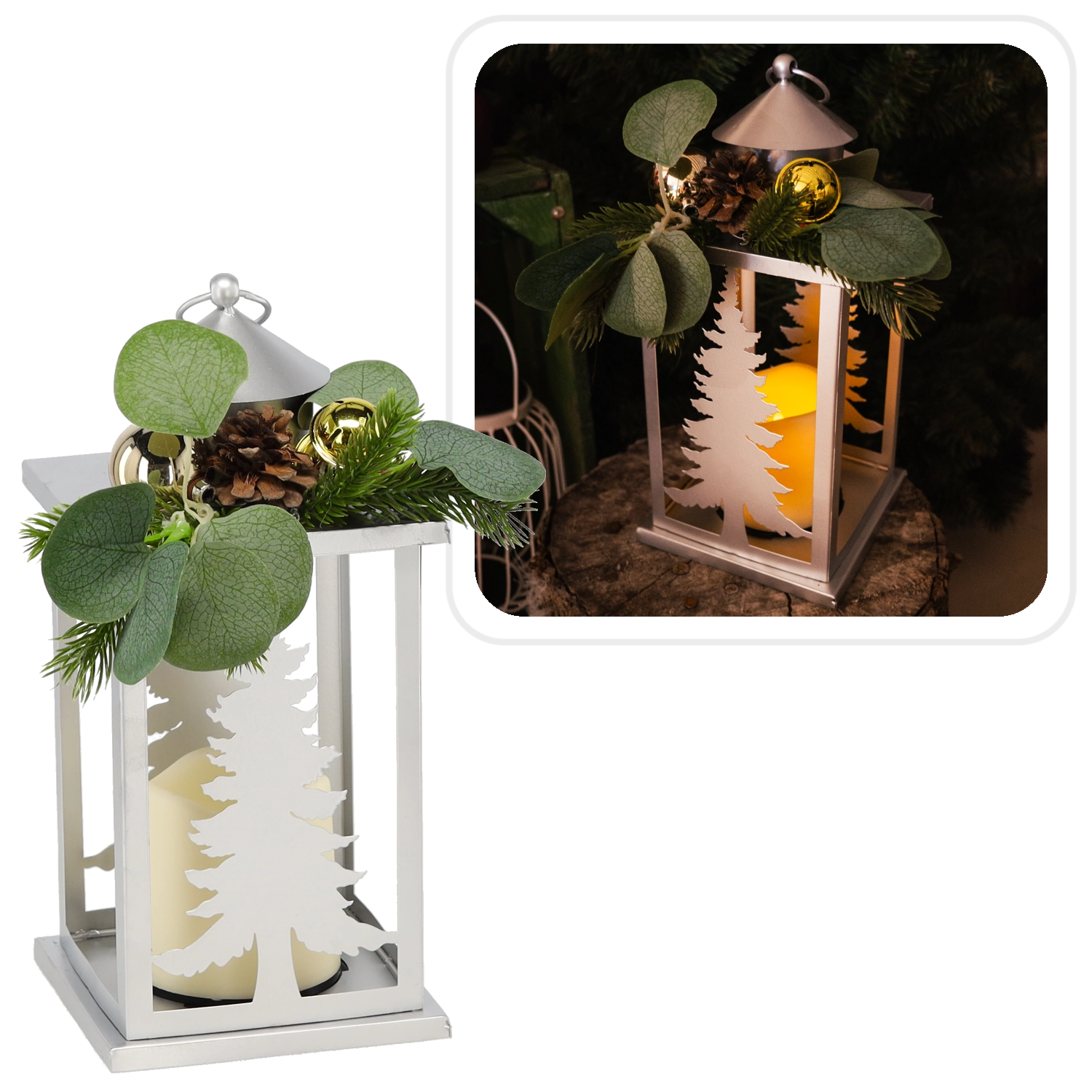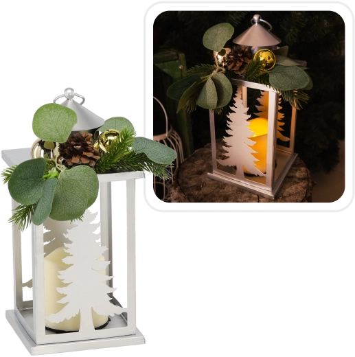 Vytvořte si doma sváteční náladu s tímto stylovým lampionem ve stříbrné barvě. Kombinuje klasický vzhled kovové lucerny s moderním a bezpečným LED osvětlením. Dekorativní prvky v podobě stromečků, zelených větviček a šišky dodají interiéru útulnost a zimní kouzlo.