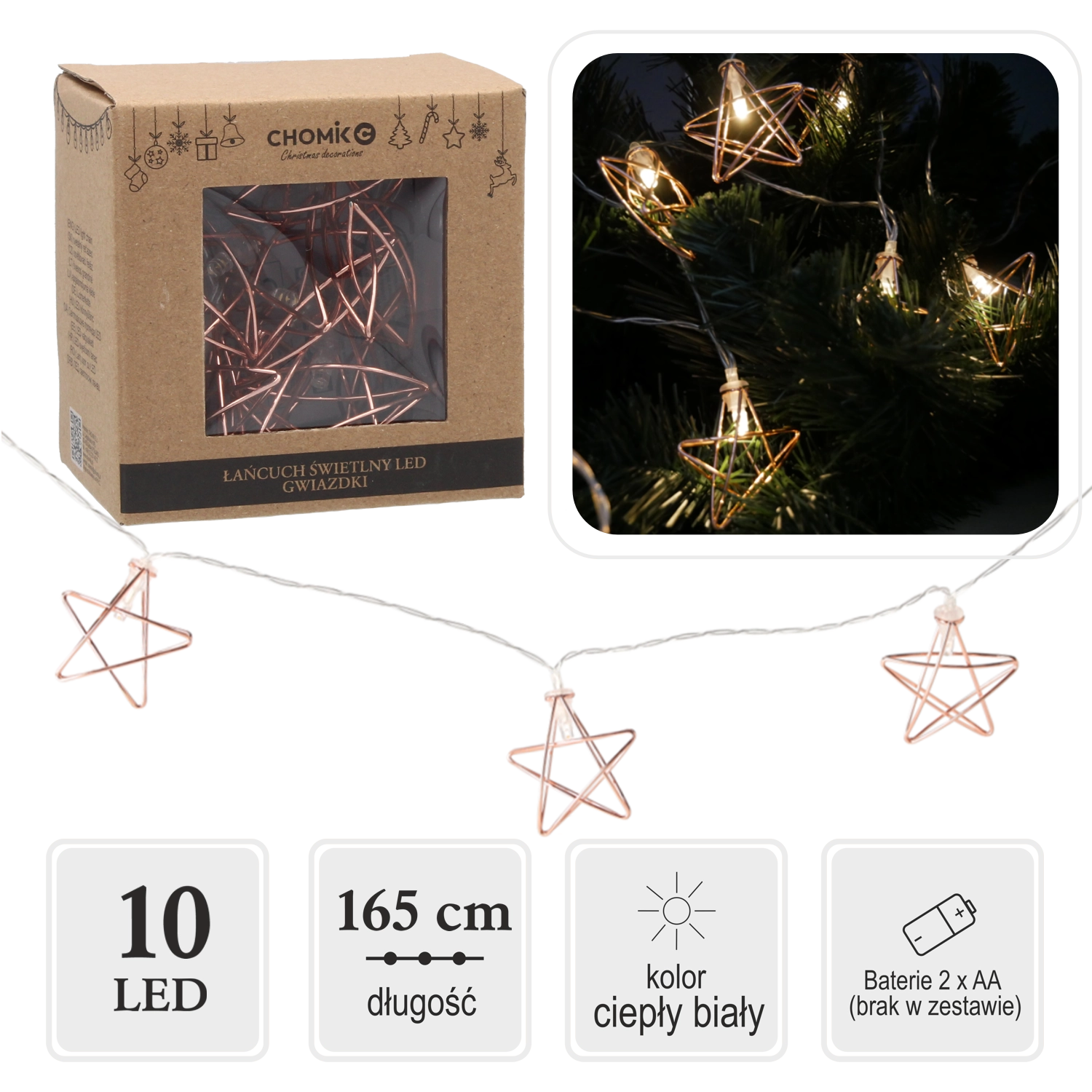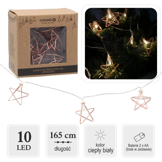 Díky napájení 2× AA bateriemi nejste omezeni zásuvkou – řetěz snadno naaranžujete na polici, okno, zrcadlo nebo stůl. Celková délka 165 cm a rozestupy 15 cm mezi LED zajišťují vyvážené a efektní nasvícení.