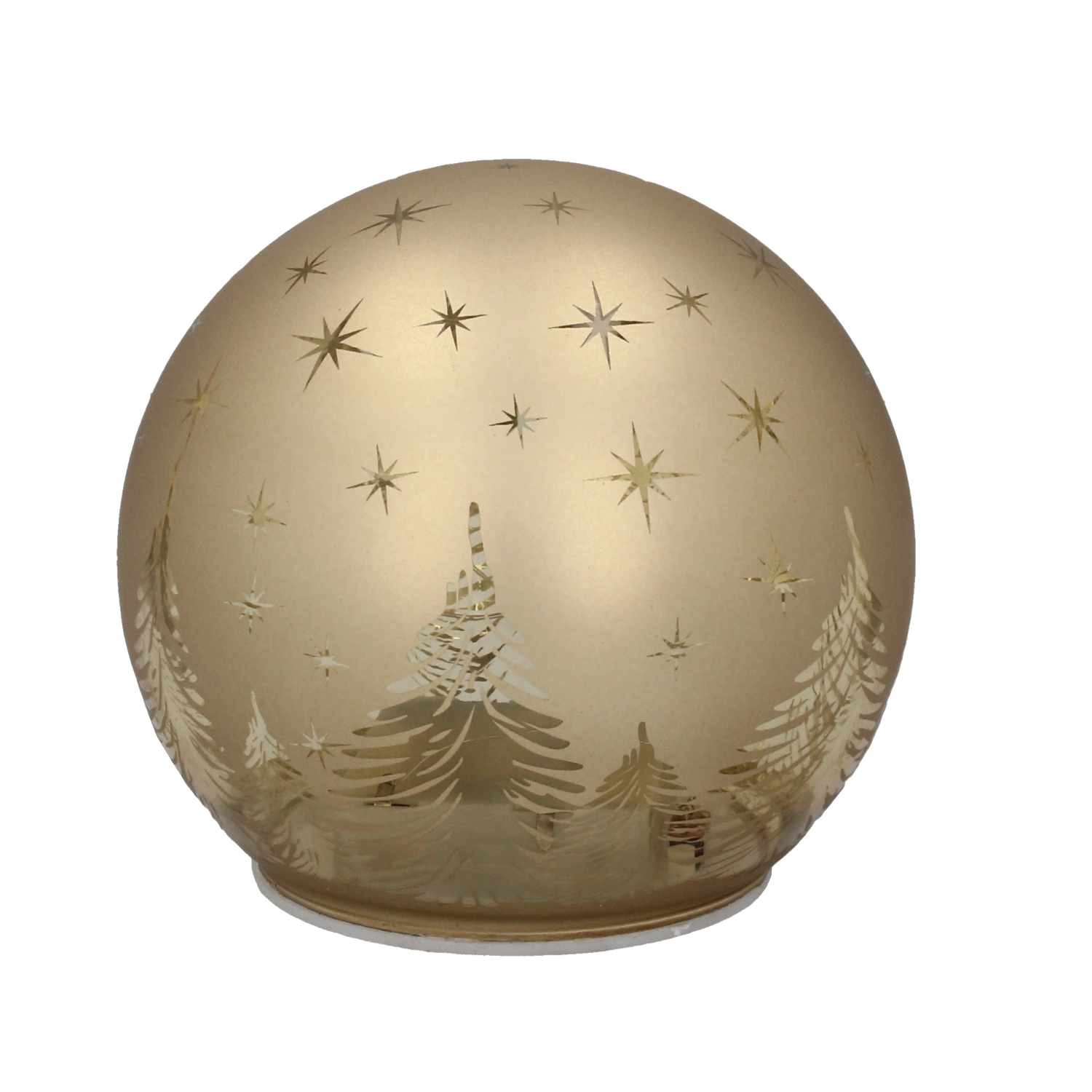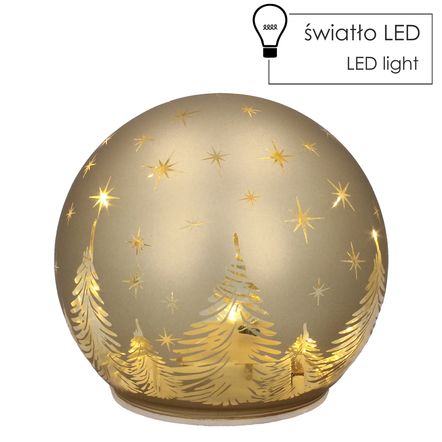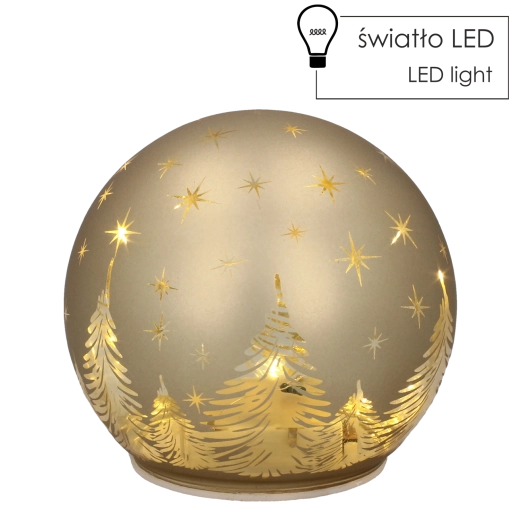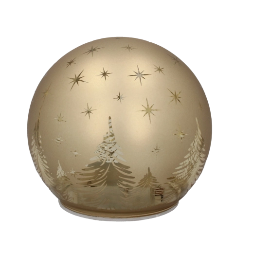 Elegantní skleněná koule v luxusním zlatém provedení s integrovaným LED osvětlením přinese do interiéru teplou, slavnostní atmosféru. Jemné světlo s efektem hvězdné oblohy vytváří útulné prostředí, zatímco energeticky úsporné LED zajistí dlouhou výdrž bez zbytečné spotřeby. Kompaktní rozměry 12 × 11 cm umožňují snadné umístění na stůl, polici i parapet.