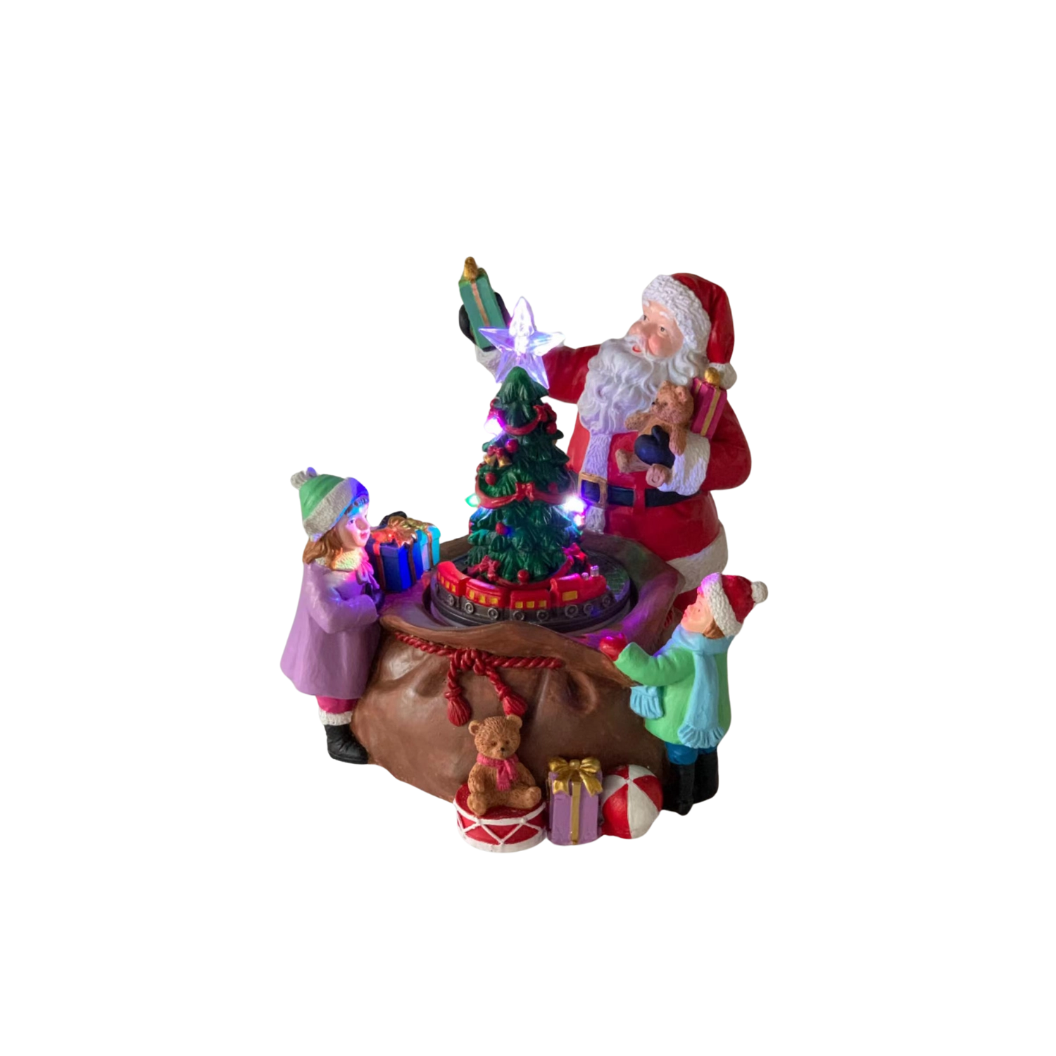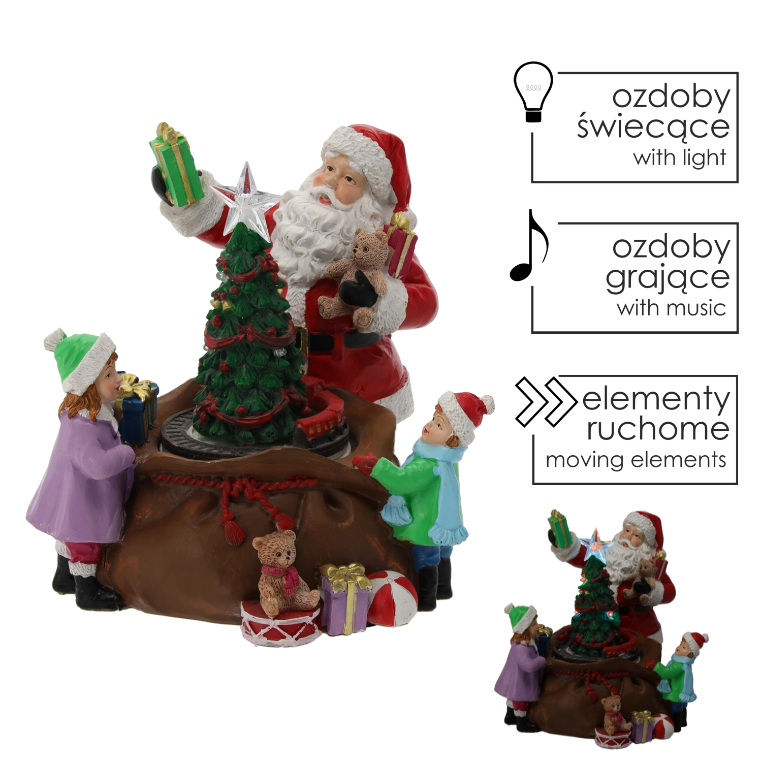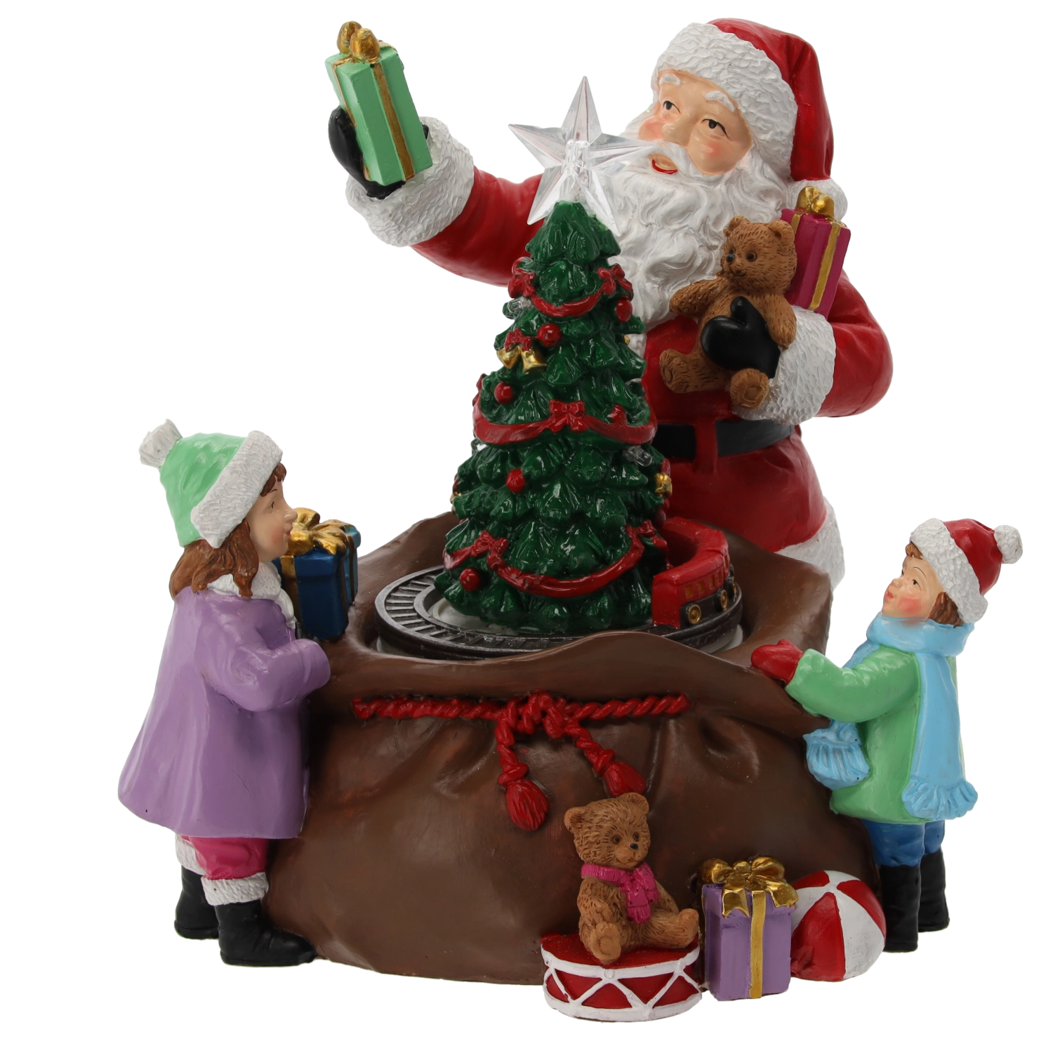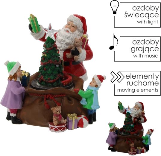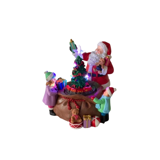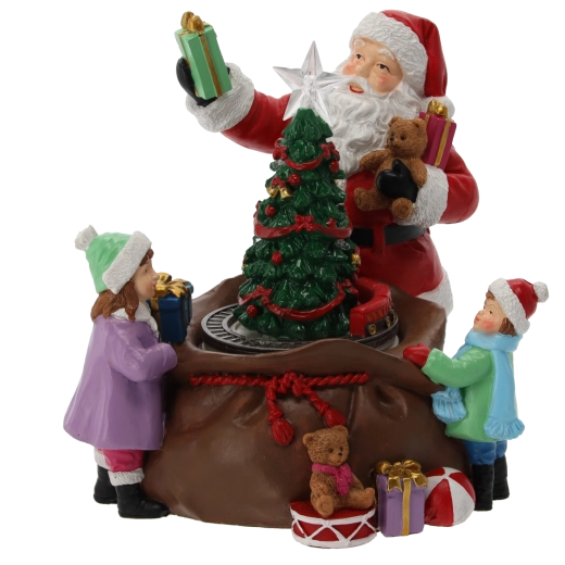 Tato detailně zpracovaná vánoční dekorace s figurkou SANTY, dětmi a bohatou nadílkou kolem osvětleného stromku promění každý interiér v útulný sváteční koutek. Integrované LED diody včetně zářící hvězdy na špičce stromku a barevných světélek vytvářejí teplou, slavnostní atmosféru.