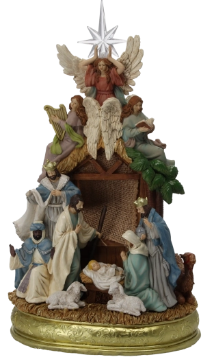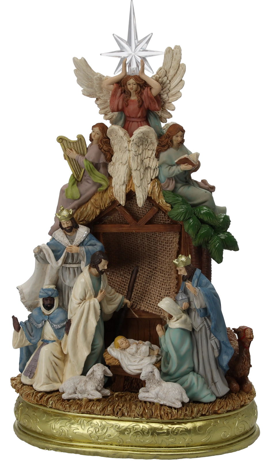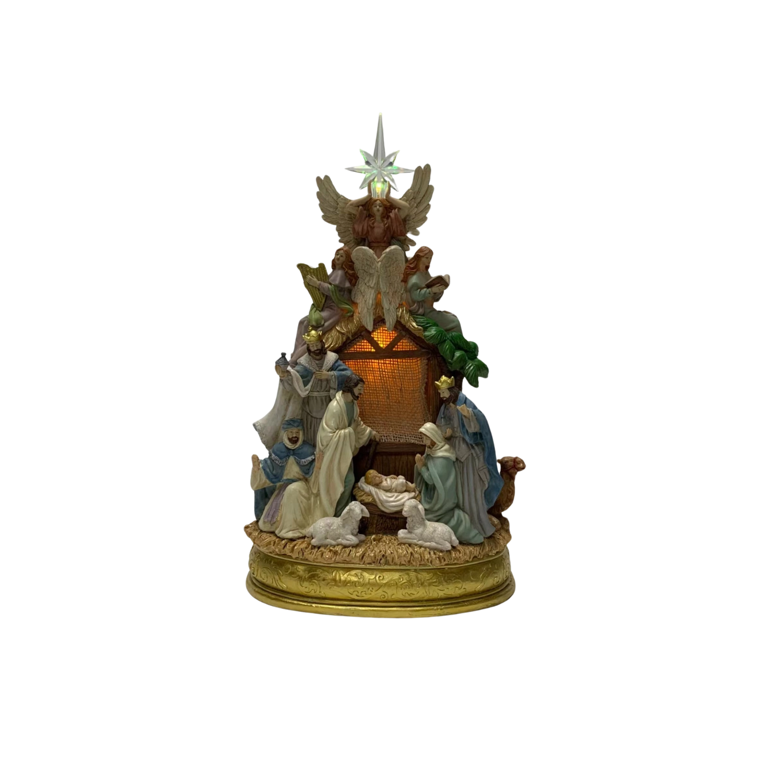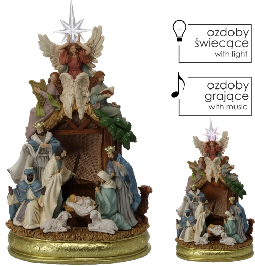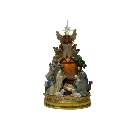 Tato dekorativní betlémská scéna z pryskyřice nadchne propracovanými postavami Svaté rodiny, andělů, pastýřů i Tří králů. Integrované LED osvětlení prozáří stáj příjemným teplým světlem, zatímco betlémská hvězda barevně pulzuje a umocňuje sváteční náladu.