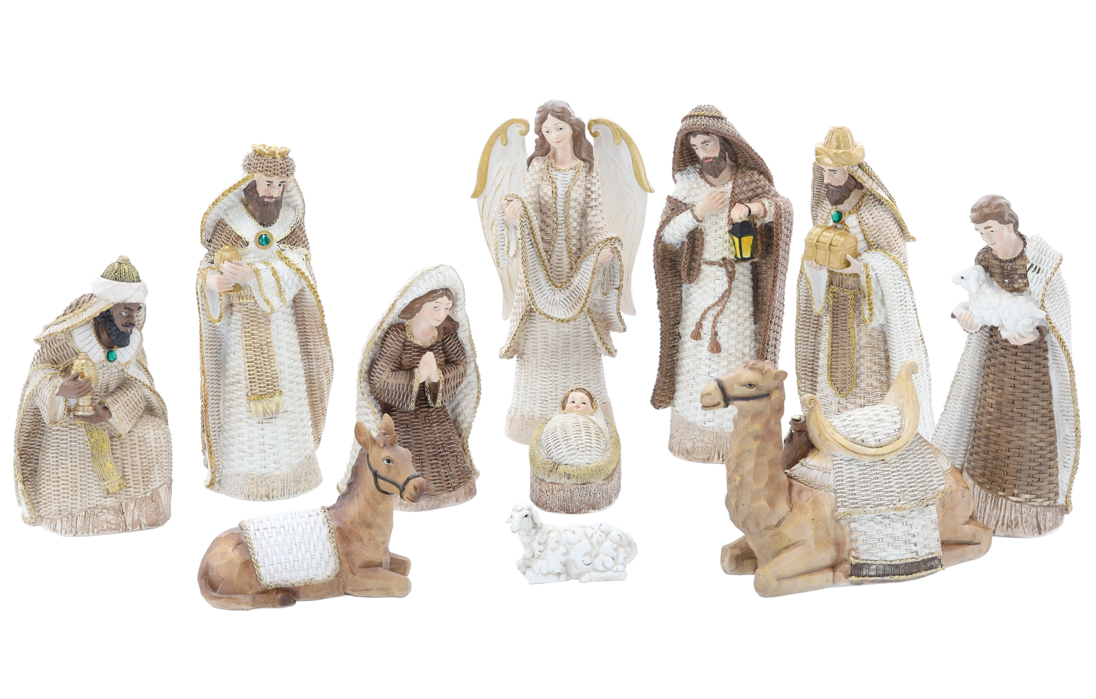 Tento reprezentativní set zahrnuje svatou rodinu, tři krále, anděla, pastýře a zvířata, takže snadno vytvoříte kompletní betlém na komodě, krbu či výstavním stole. Polyresin zajišťuje vysokou odolnost proti poškození a stálost barev, takže si dekoraci užijete po mnoho sezón.