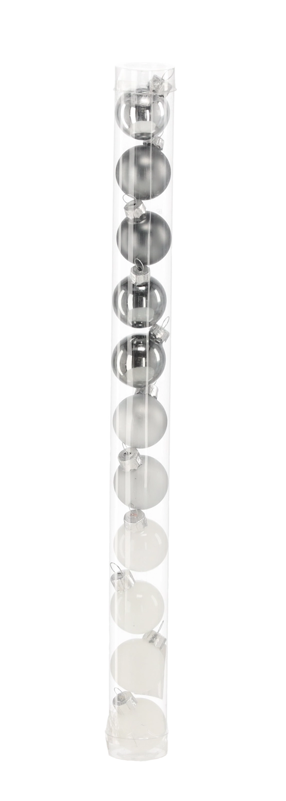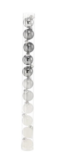 Elegantní sada 11 skleněných ozdob o průměru 3 cm v kombinaci bílé a stříbrné barvy dodá stromku moderní, sofistikovaný vzhled. Mix lesklých, matných a průhledných povrchů krásně odráží světlo a vytváří jemný sváteční lesk. Praktická tubusová krabička usnadňuje skladování i darování.
