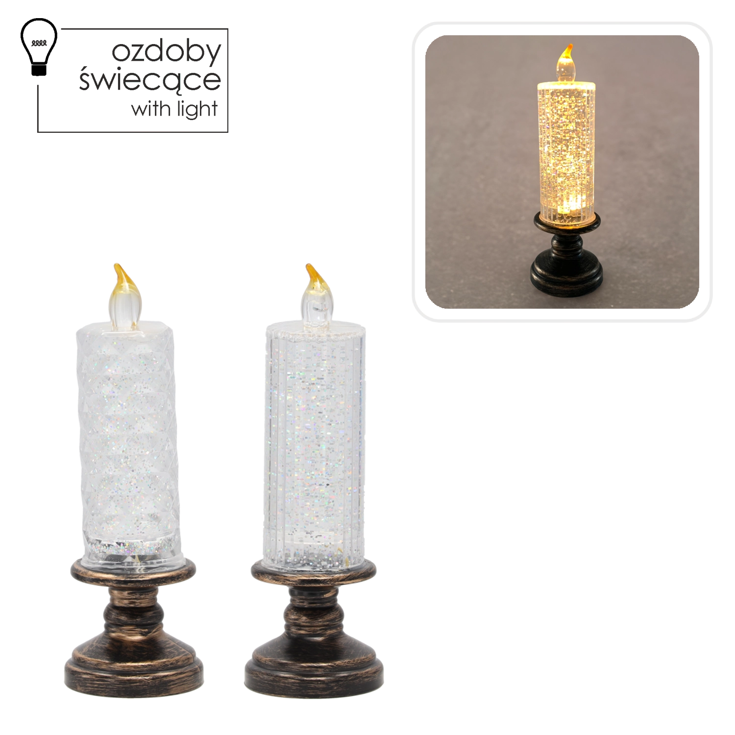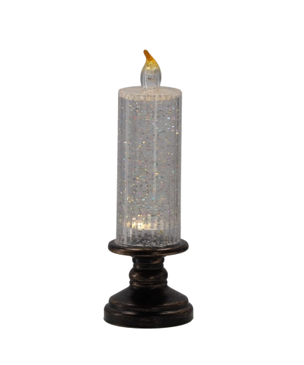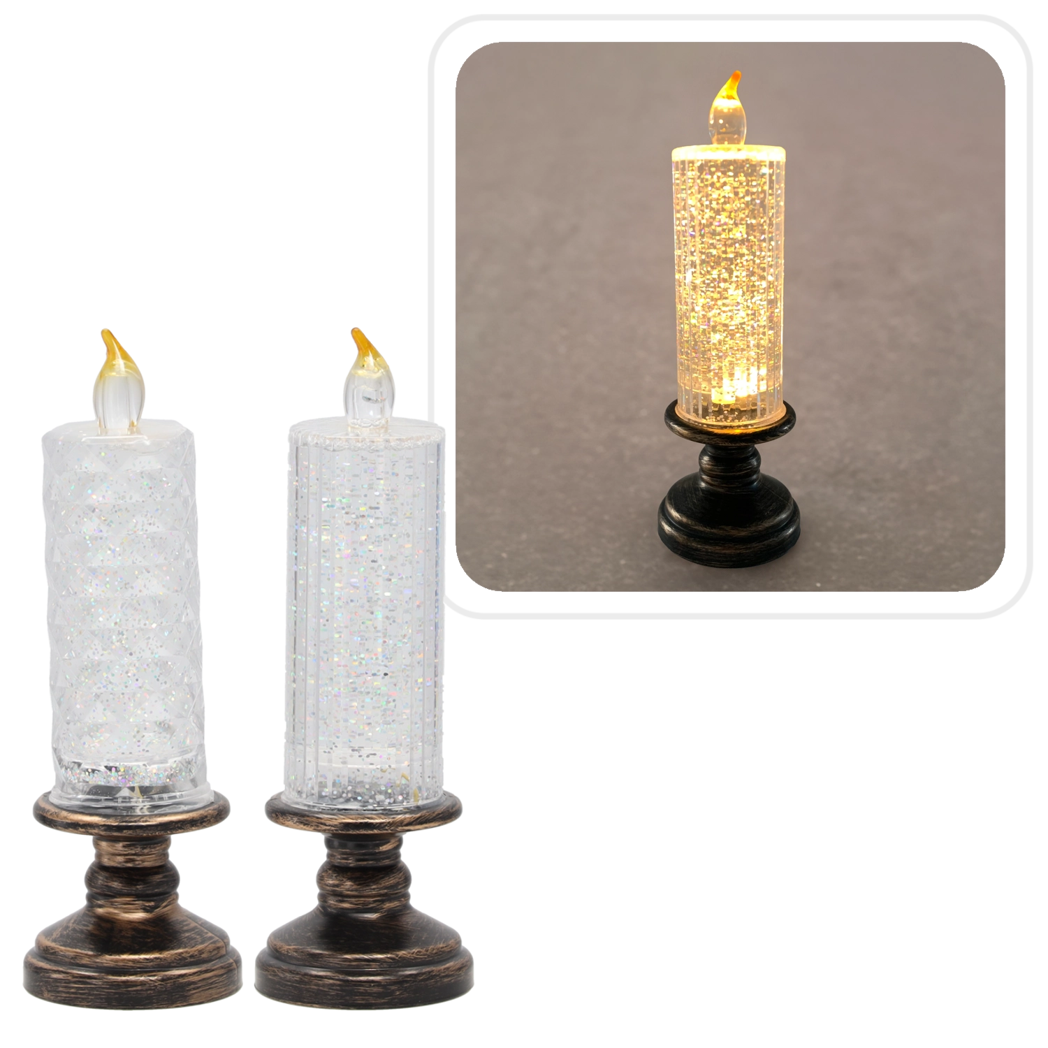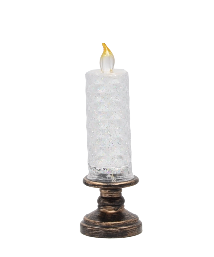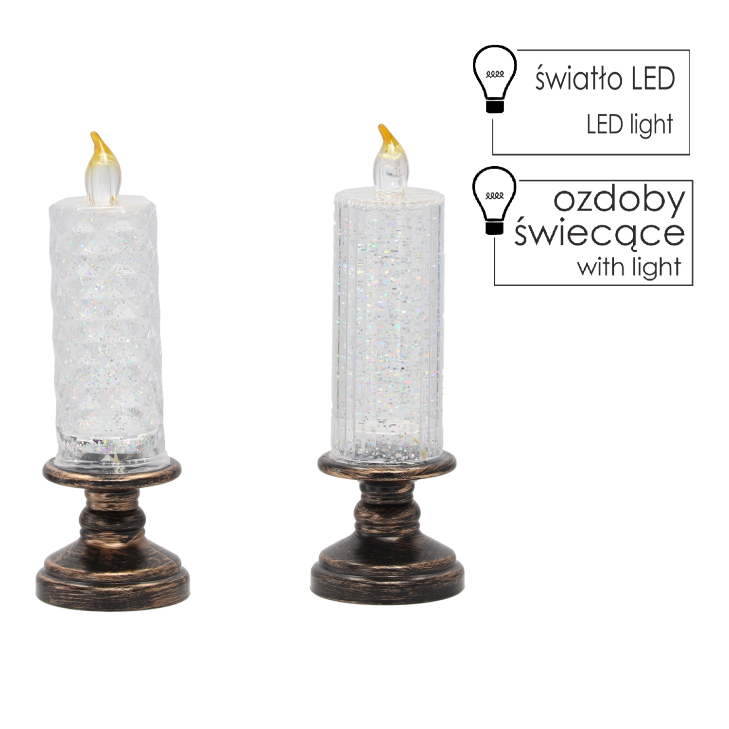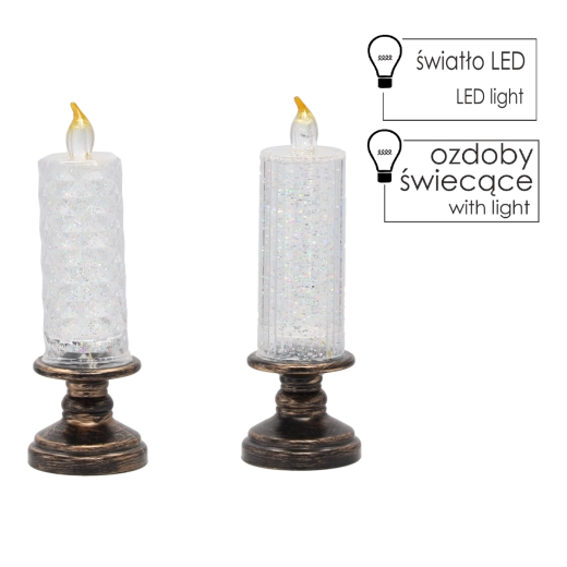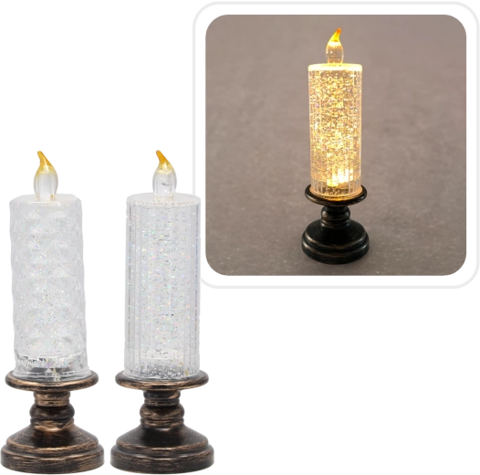 Stylová dekorativní LED svíčka s průhledným válcem plným třpytek a vintage podstavcem vykouzlí útulnou atmosféru během okamžiku. Po rozsvícení vytváří jemné teplé světlo a zářivý třpytivý efekt, který je ideální na stůl, komodu či okenní parapet. Napájení zajišťují baterie LR44, takže ji snadno umístíte kamkoli bez kabelů.