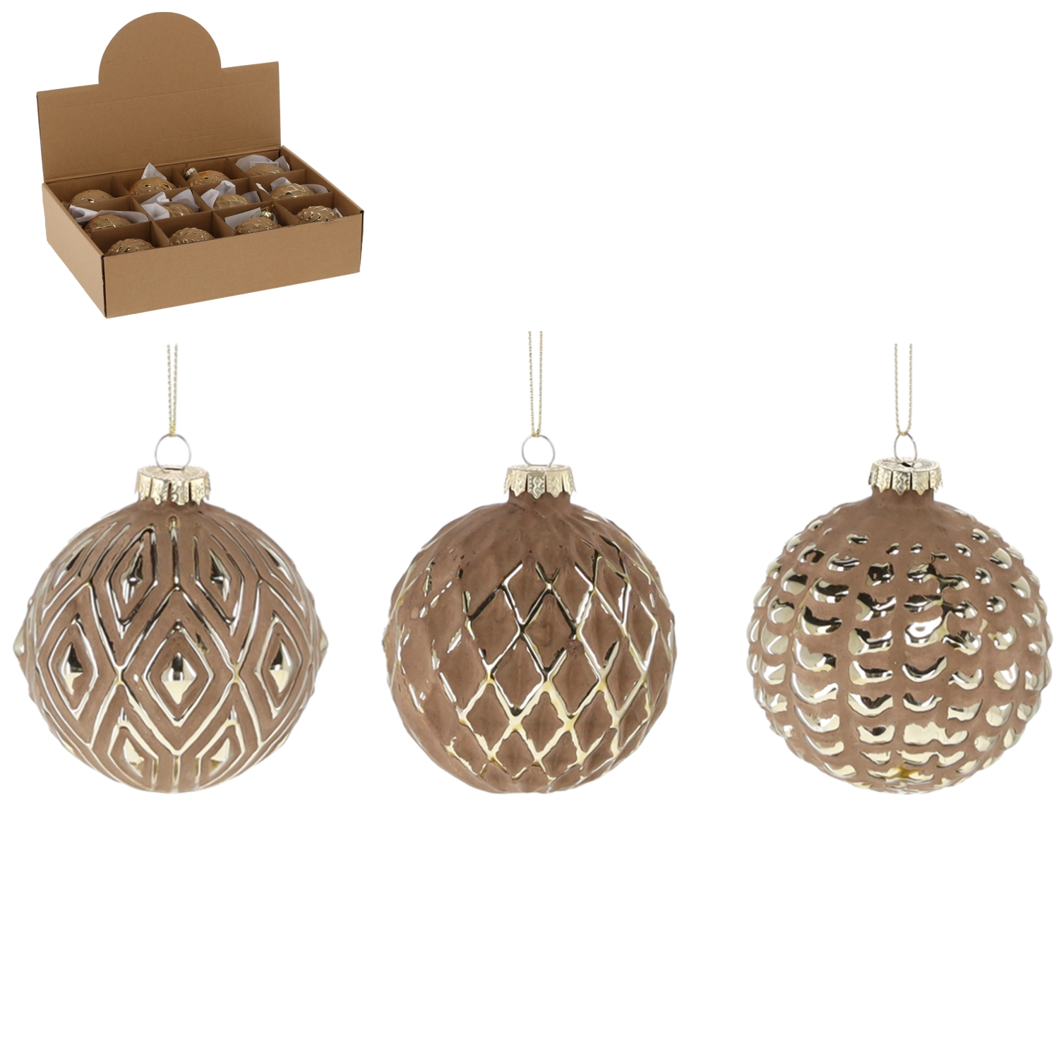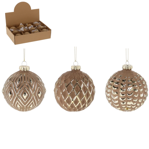 Elegantní skleněné vánoční koule o průměru 8 cm v hnědé barvě se zlatými ornamenty dodají vaší výzdobě luxusní a sofistikovaný vzhled. Kombinace matného povrchu a lesklých detailů vytváří působivý kontrast, který na stromku krásně vynikne. Sada obsahuje 12 kusů s různými vzory, které snadno sladíte s ostatními dekoracemi a vytvoříte harmonickou a útulnou atmosféru během Vánoc.
