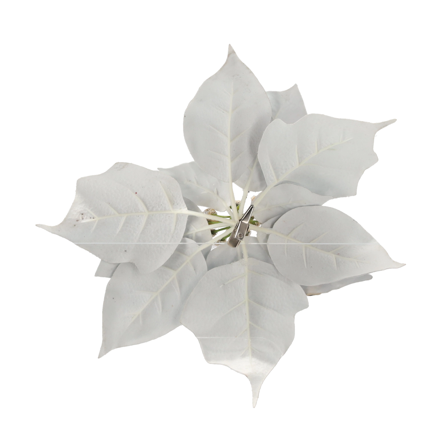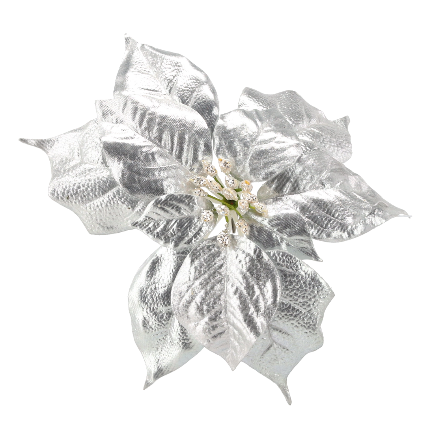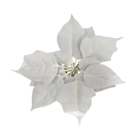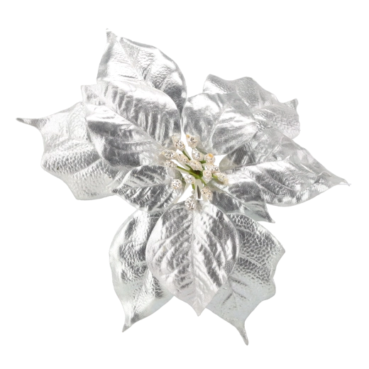 Elegantní umělá vánoční hvězda (poinsettia) o výšce 25 cm ve stříbrném provedení dodá vašemu domovu sváteční třpyt. Kvalitní materiál věrně napodobuje vzhled živé květiny a praktický klips umožní snadné připevnění na stromek, věnce, girlandy či další dekorace.