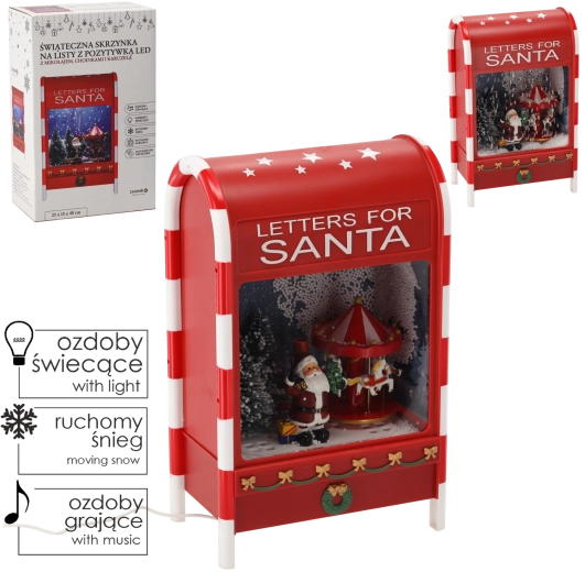 Tato dekorativní červená schránka je působivým vánočním doplňkem s bohatými vizuálními i zvukovými efekty. Studené bílé SMD LED podtrhují zimní atmosféru, zatímco scéna se Santa Clausem, stromečky a kolotočem vytváří kouzelný pohyblivý výjev. Funkce efektu sněžení dodává dekoraci autentickou sváteční náladu.