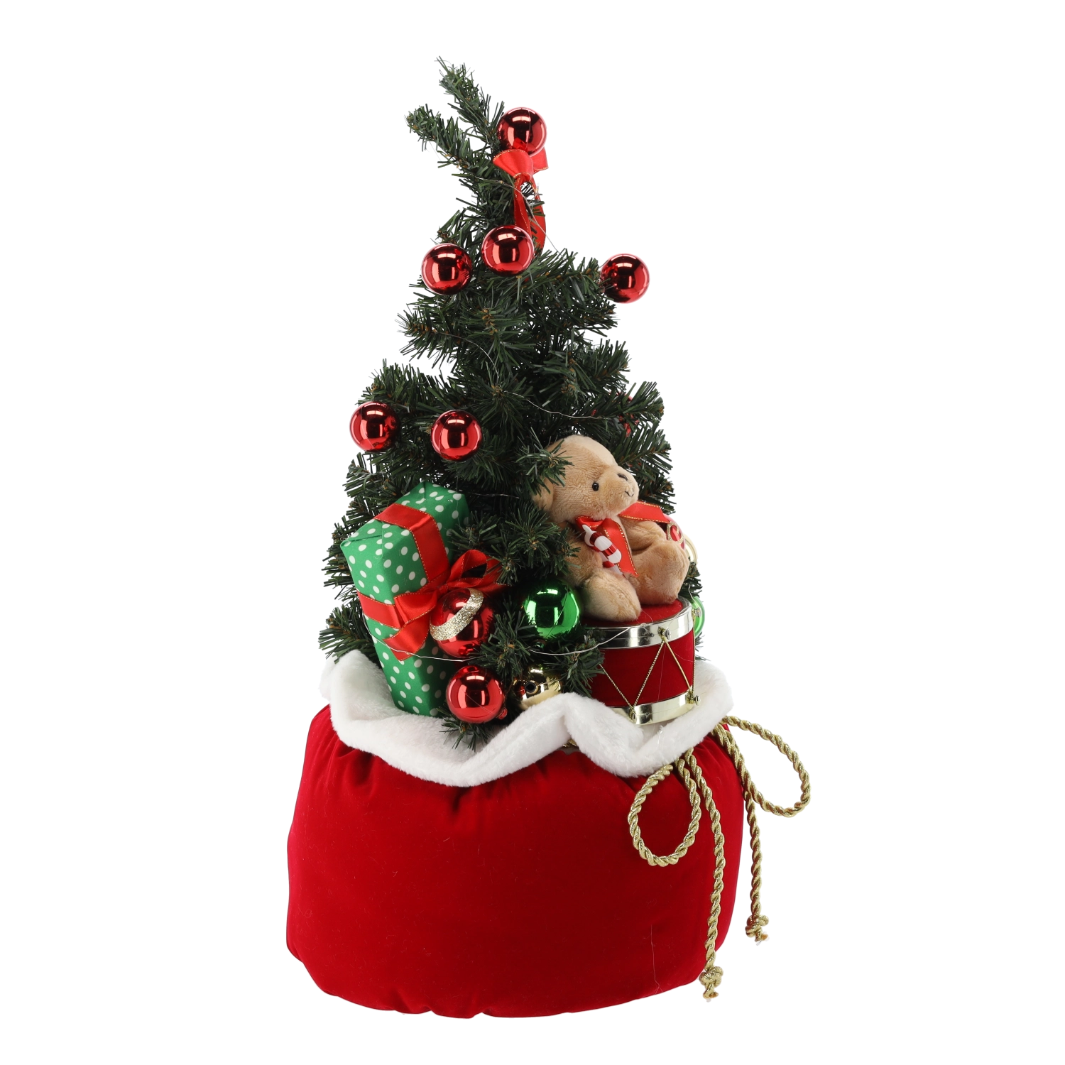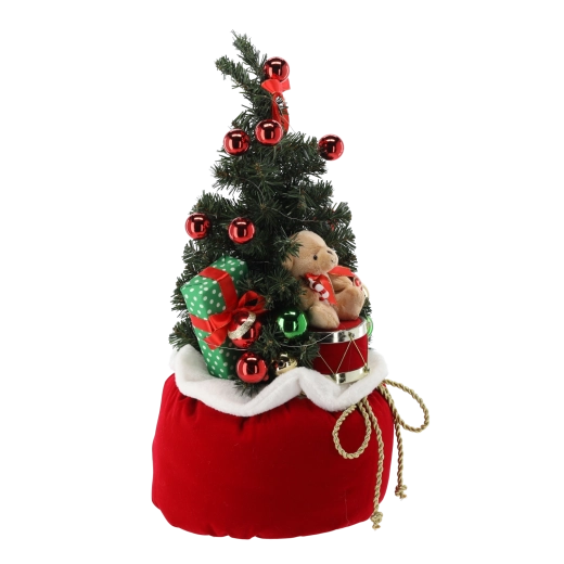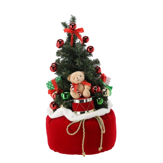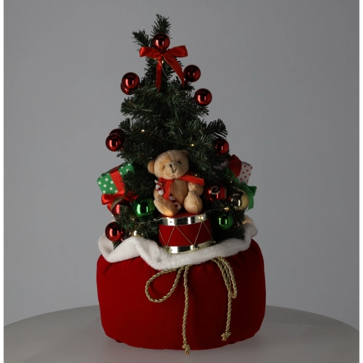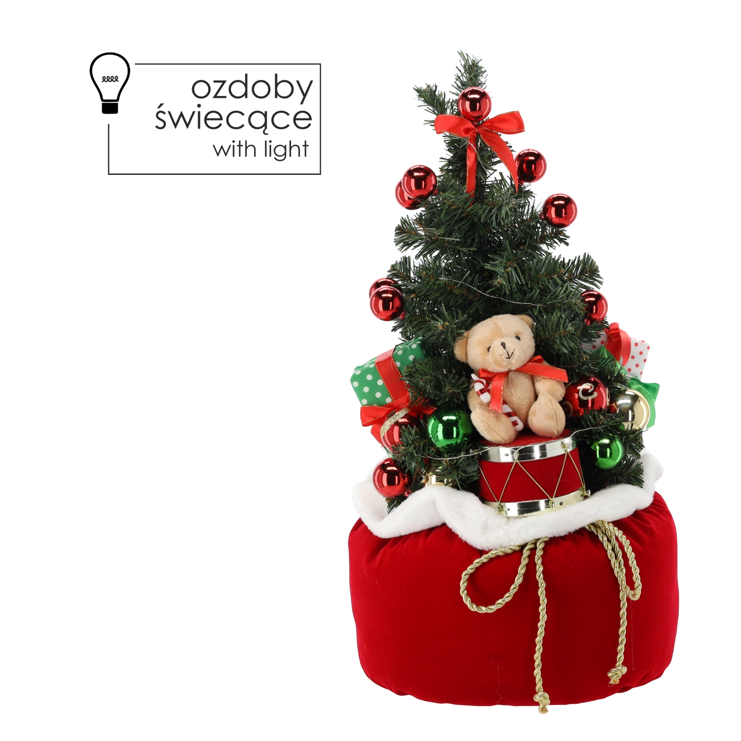 Stromeček je osazen červenými a zelenými ozdobami, mašličkami a roztomilými dekoracemi, takže ho stačí jen vybalit a vystavit.